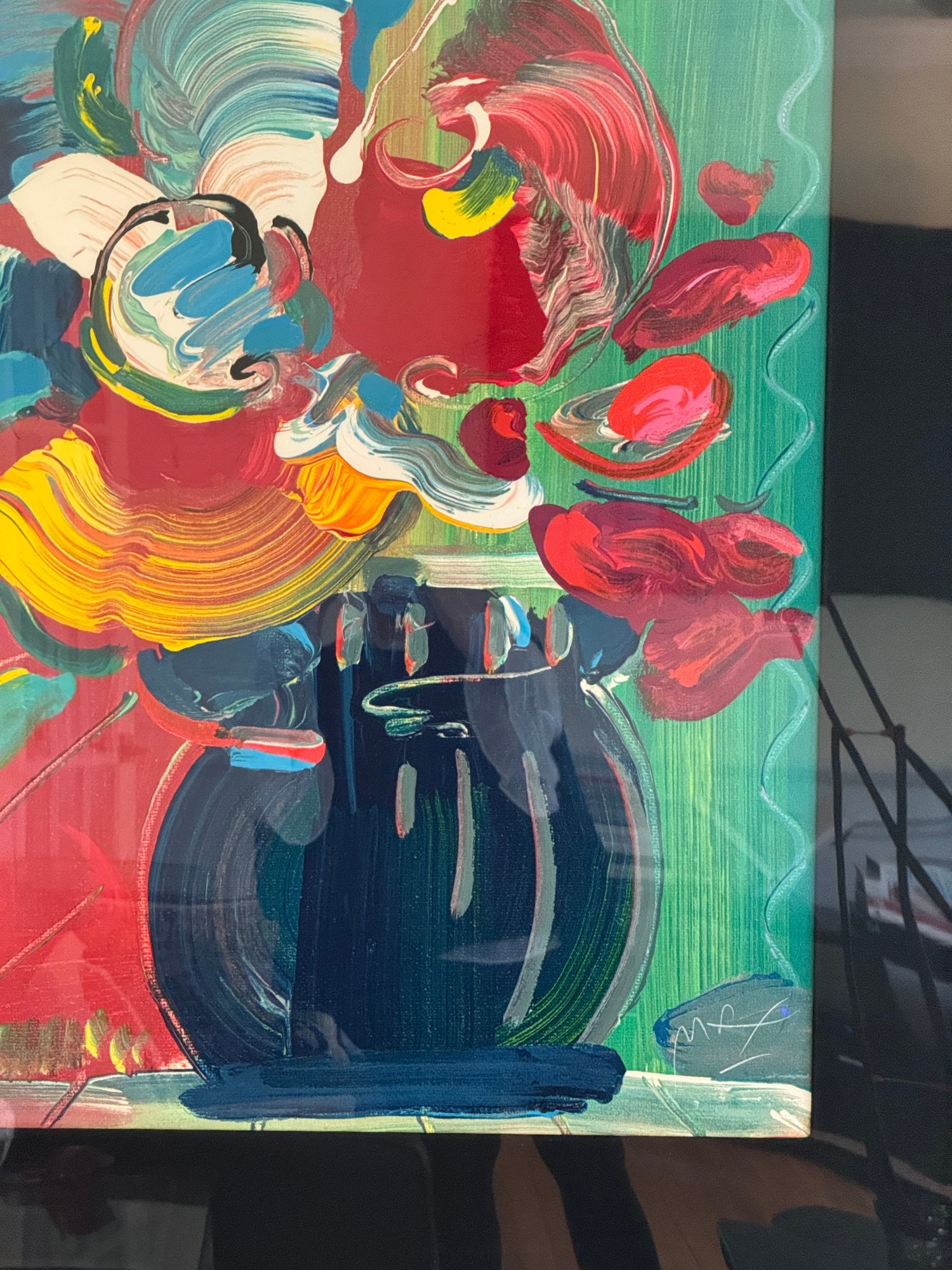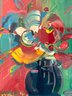 Peter Max's 'Roseville Bouquet' was inspired by his collection of the celebrated and beloved Roseville Pottery. Like the artisan pottery Max's "Roseville Bouquet' has influences from the early 20th Century Art Nouveau movement in the curves and swirls of the crown of flowers. It is also inspired by the Art Deco movement with its bold, geometric color fields. The feminine profile is painted in simple perfect strokes in striking scarlet on black. This exhilarating image brilliantly reproduces the bombastic color and detail of the artist's multicolored brushwork.