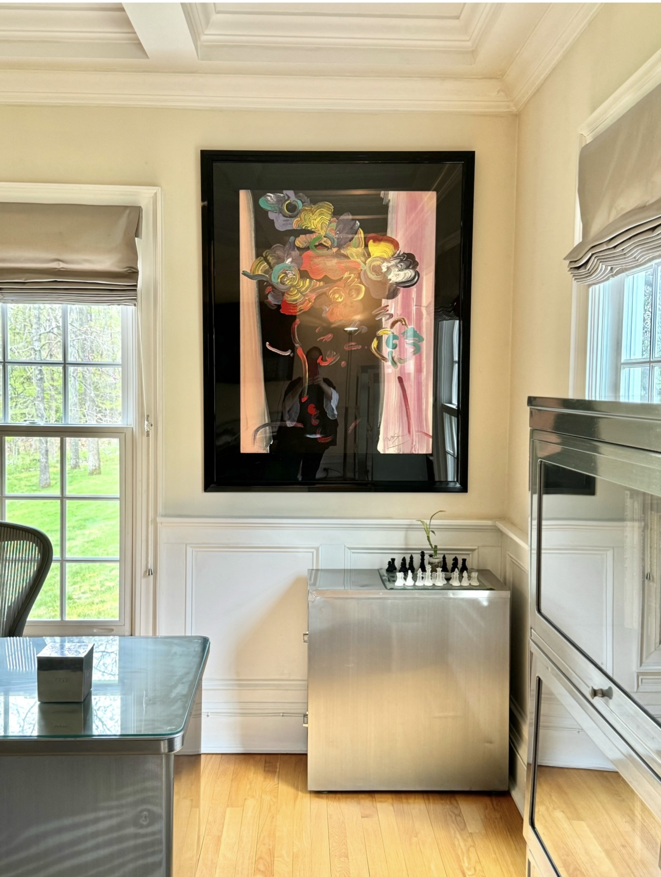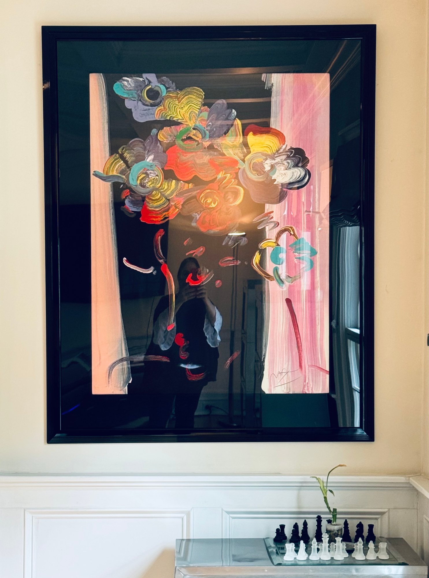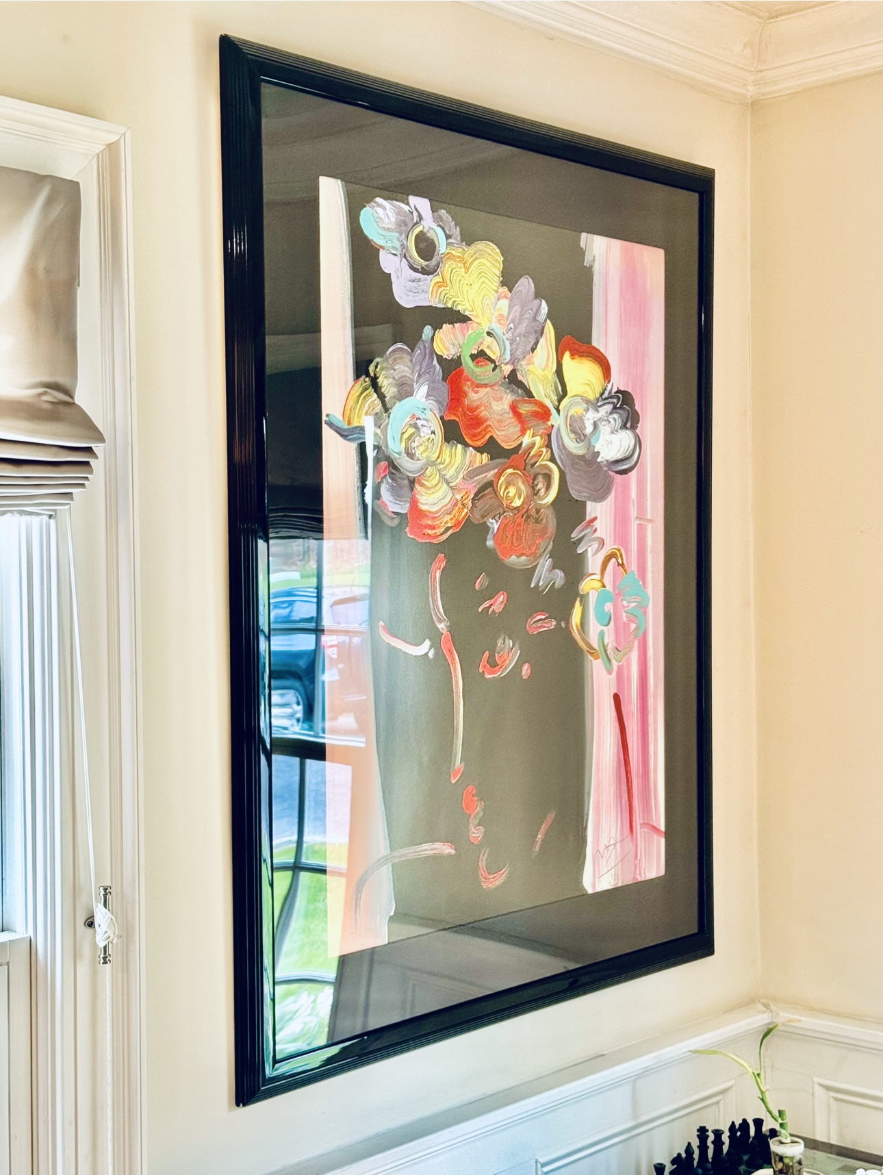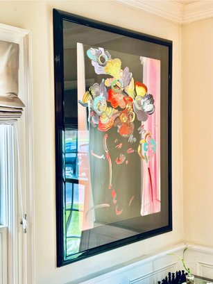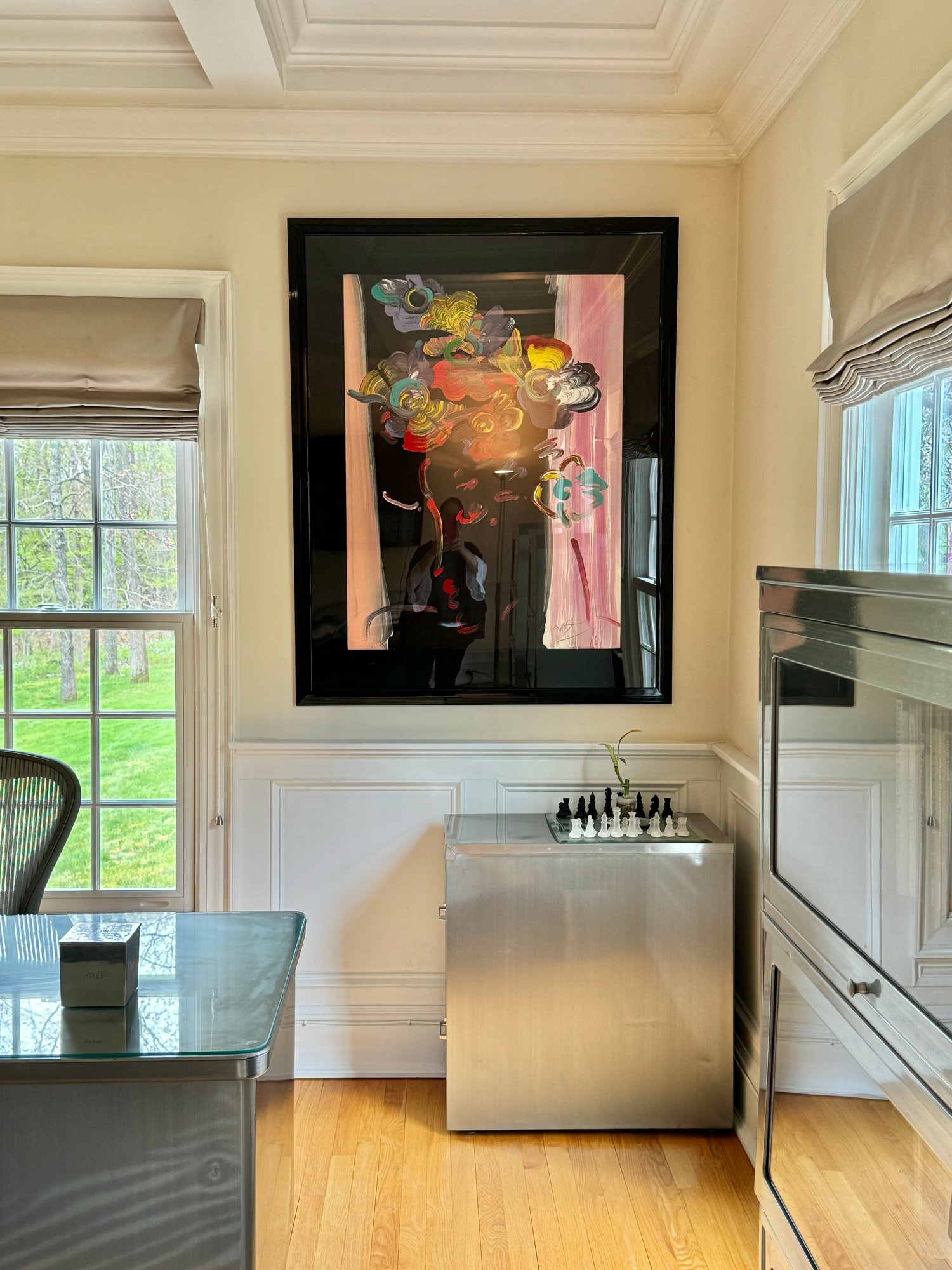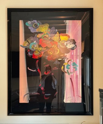 This beautiful Peter Max Serigraph on paper is Signed and Numbered and includes a Certificate of Authenticity from the Merrill Chase Gallery where it was purchased in 1992. Its year of publication was 1991 and is from a Limited Edition Numbered 109/300 and printed by Soma Fine Arts / Hanson Art Publishing. The print has been custom matted and framed in a black lacquer high gloss frame that works to highlight the colorful imagery. It was purchased together with 'The Roseville Suite' Serigraph for sale in this auction and have hung as a striking pair in this modern home office. The condition is in excellent condition has been well loved and cared for. It is one of two Peter Max serigraphs for sale in this auction.