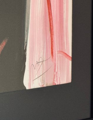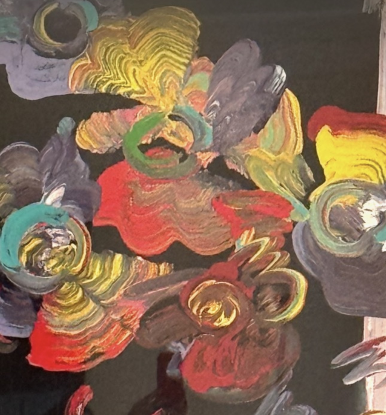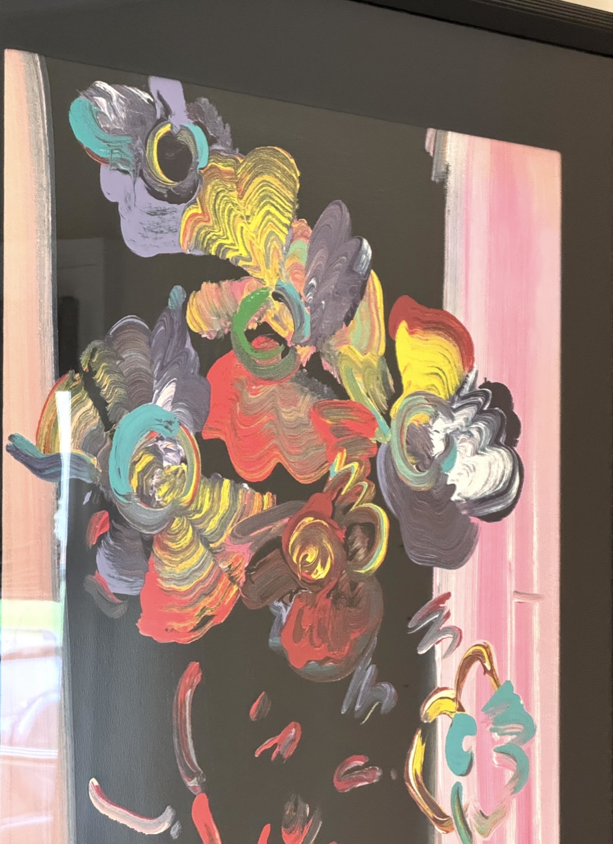 Peter Max's 'Roseville Profile' was inspired by his collection of the celebrated and beloved Roseville Pottery. Like the artisan pottery Max's "Roseville Profile' has influences from the early 20th Century Art Nouveau movement in the curves and swirls of the crown of flowers. It is also inspired by the Art Deco movement with its bold, geometric color fields. The feminine profile is painted in simple perfect strokes in striking scarlet on black. This exhilarating image brilliantly reproduces the bombastic color and detail of the artist's multicolored brushwork.