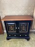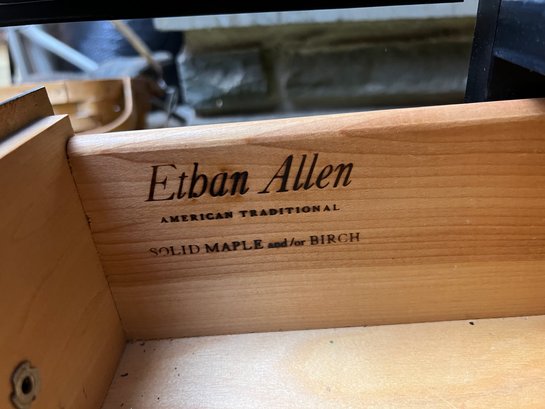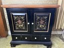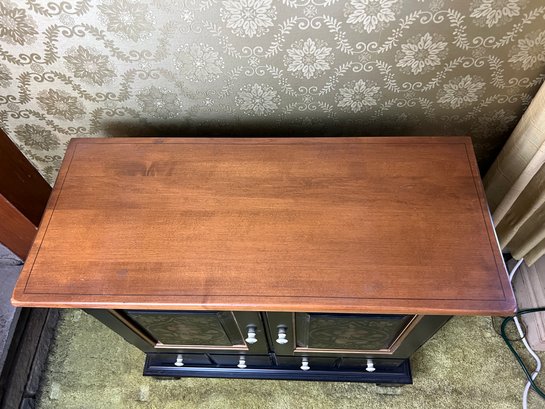 Vintage Ethan Allen "American Traditional" console cabinet with a natural maple top and an ebonized solid maple and/or birch body painted with stencil floral design.