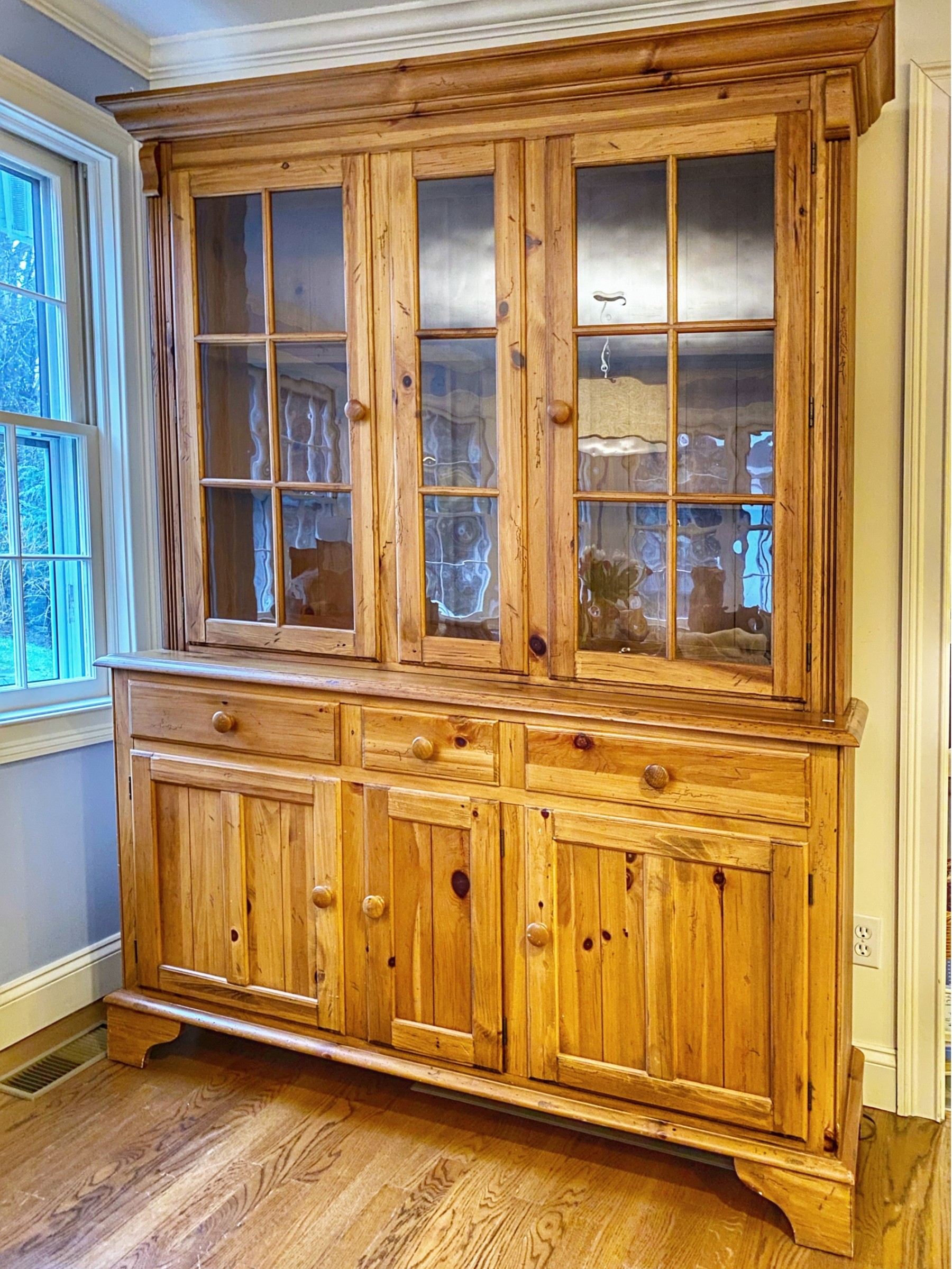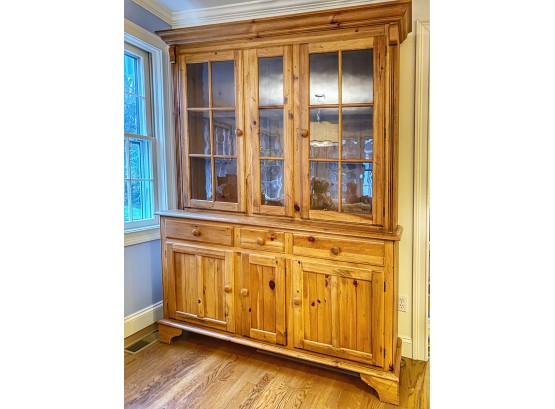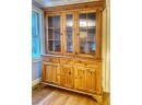 Traditional craftsmanship with a linear design. Generous storage options. Two wood-framed glass shelves behind glass doors, recessed interior lighting,