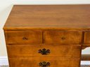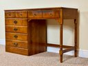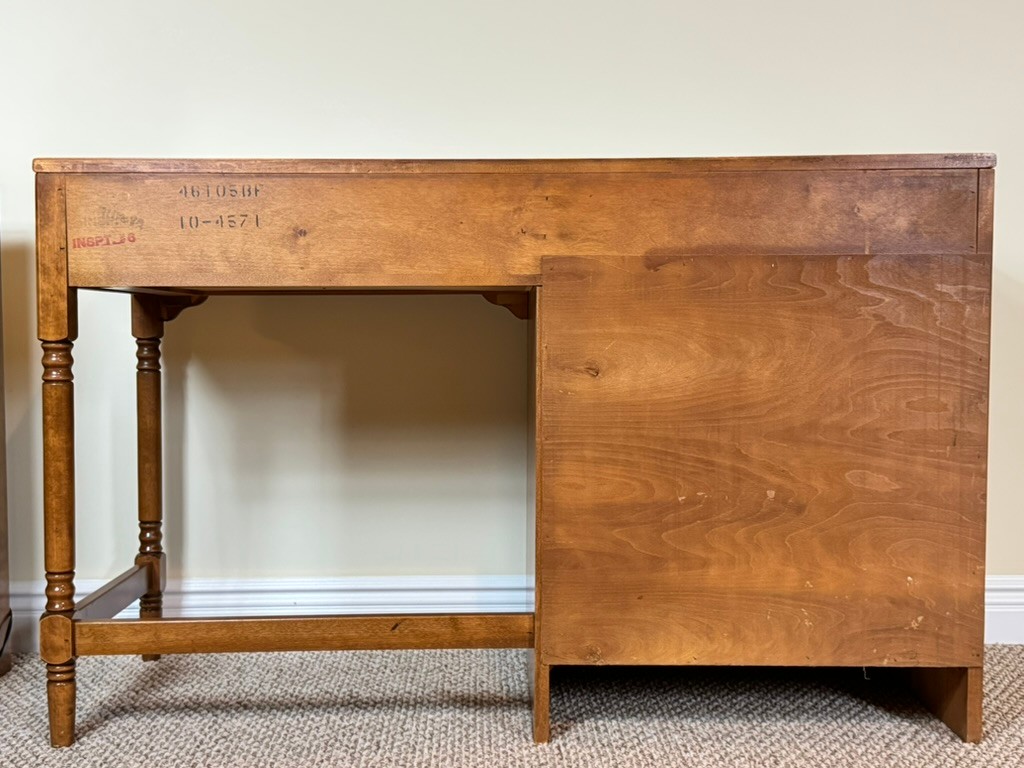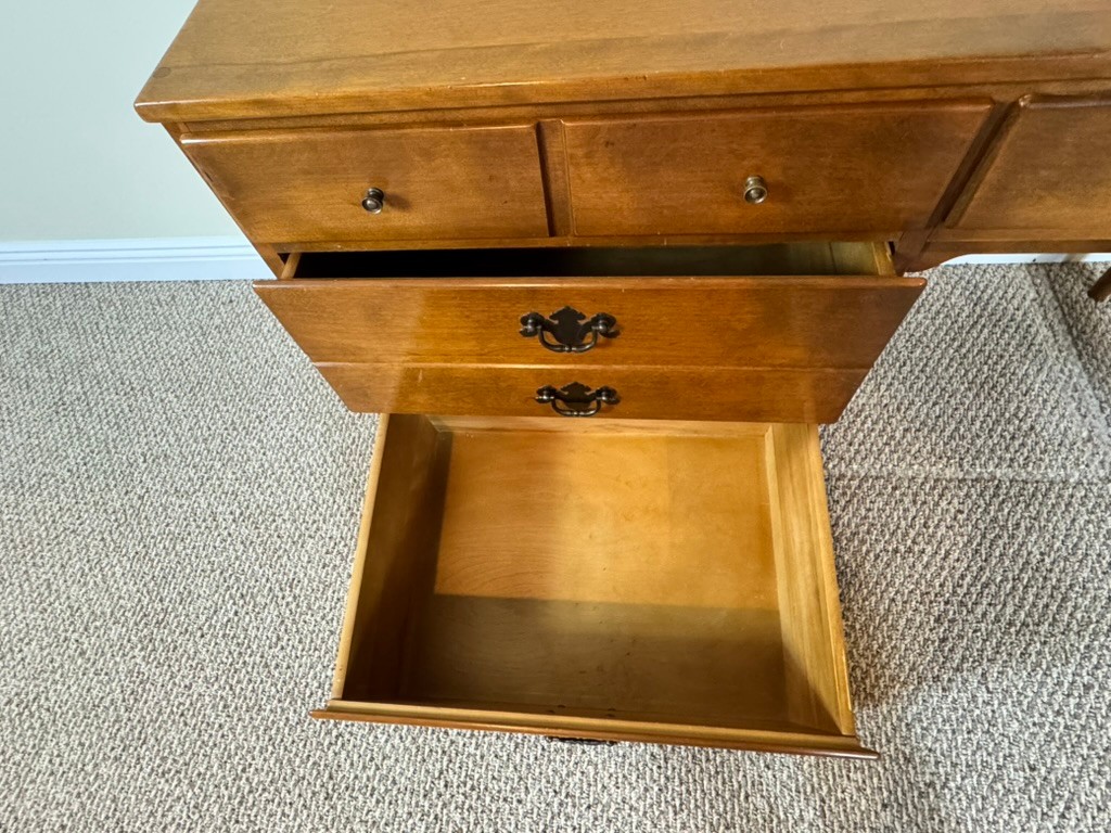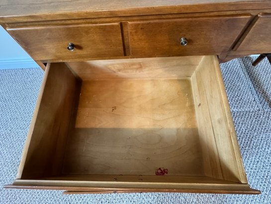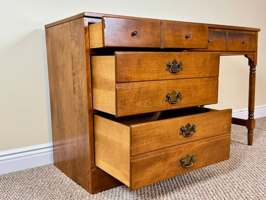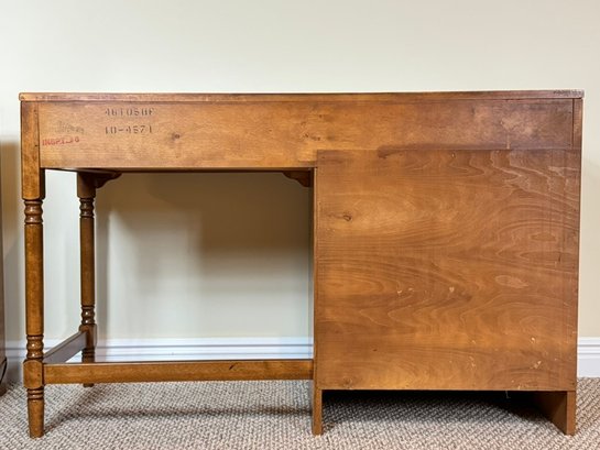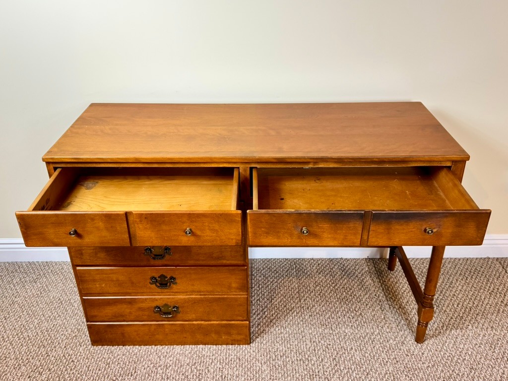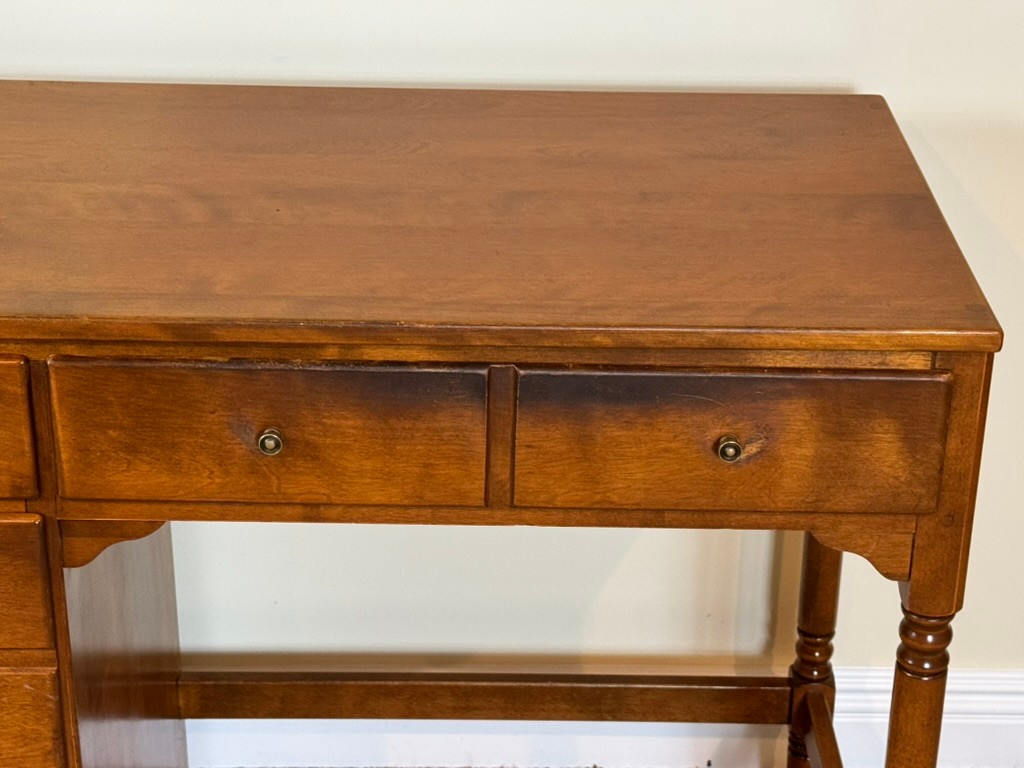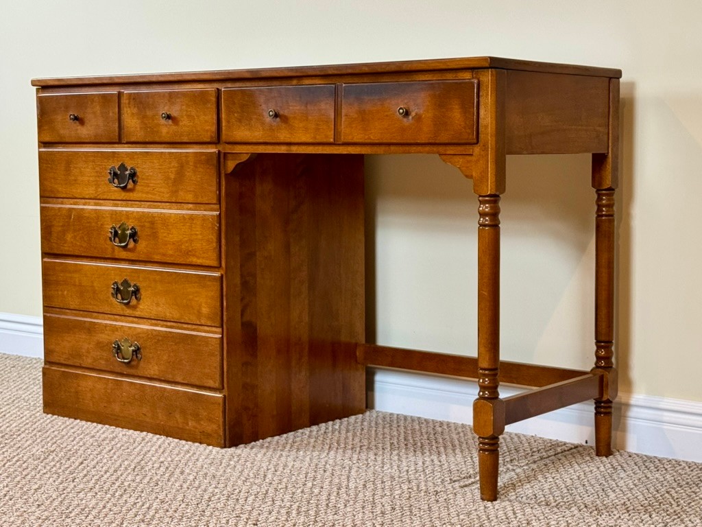 Classic Ethan Allen Early American writing desk crafted from solid maple and birch, finished in a warm honey tone. Clean colonial lines and sturdy construction make this a timeless and highly functional piece.