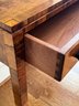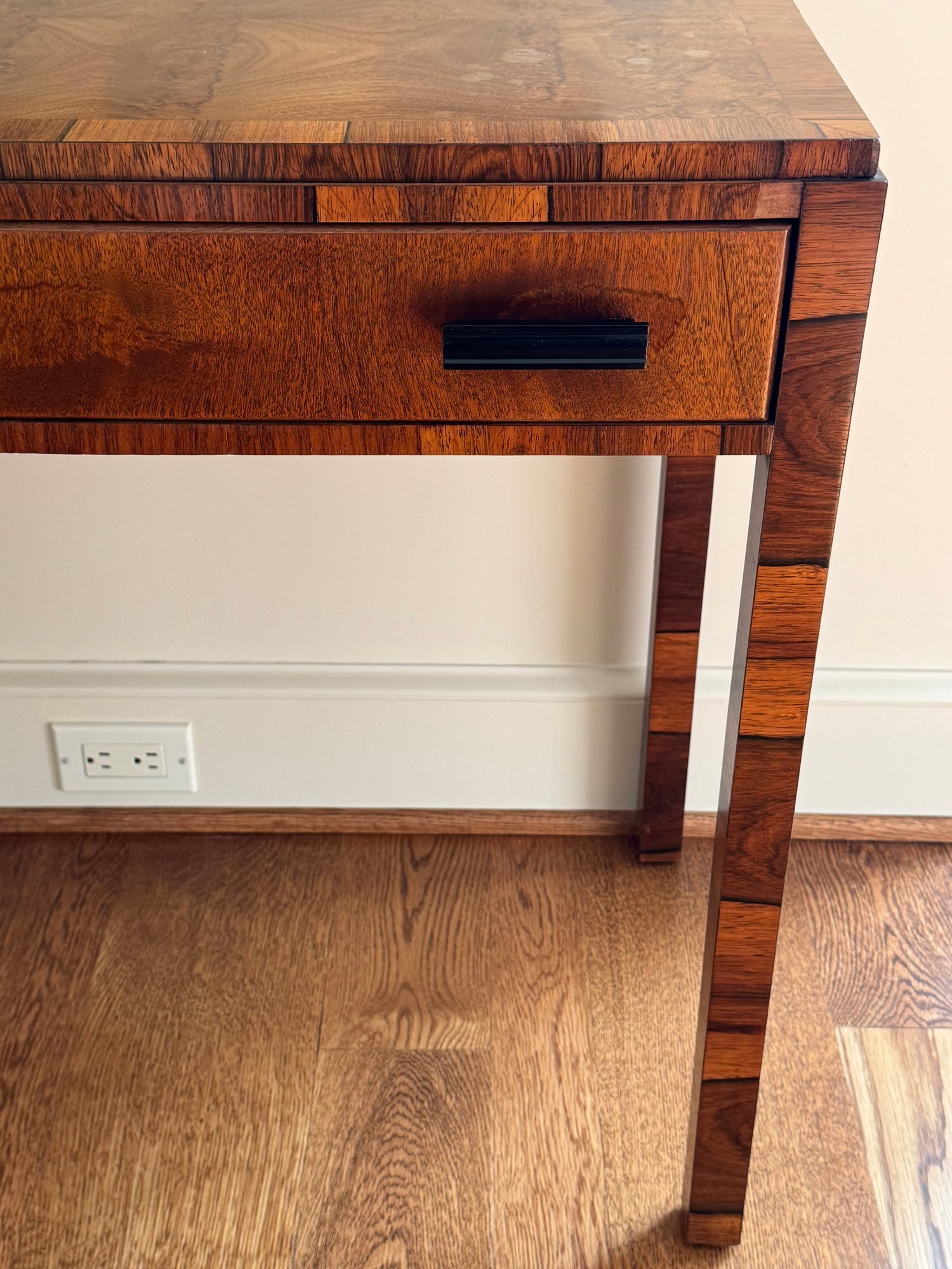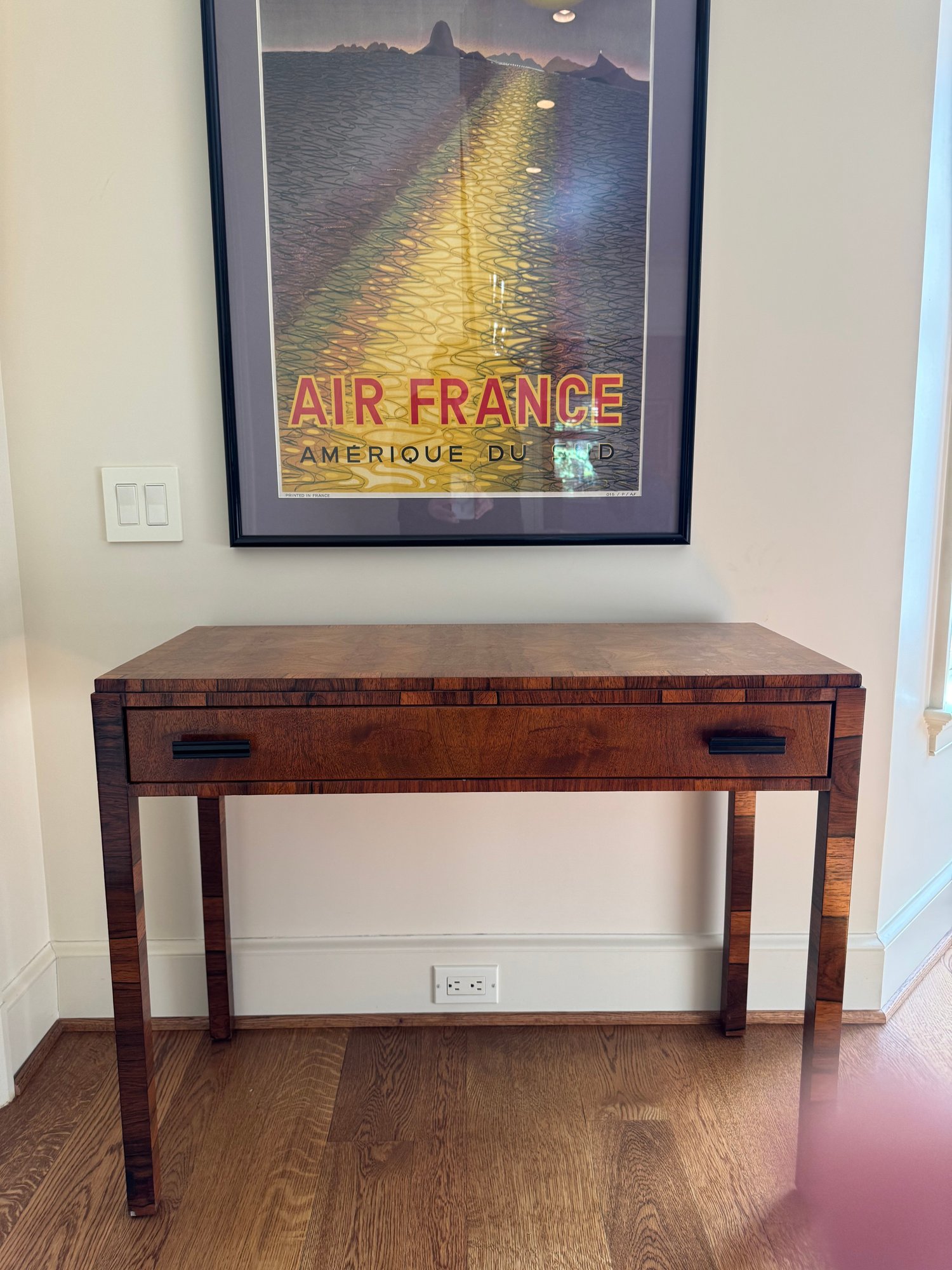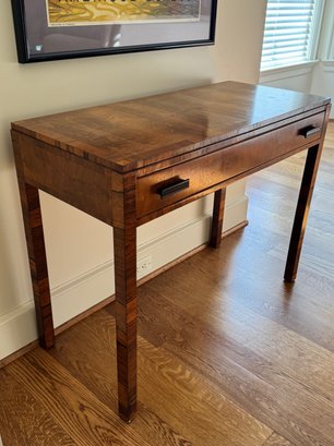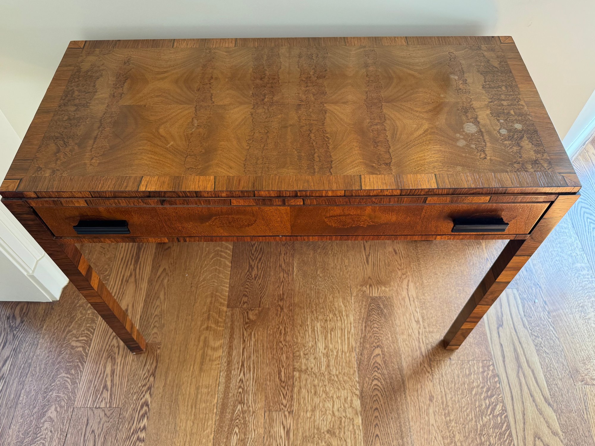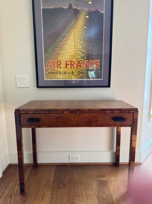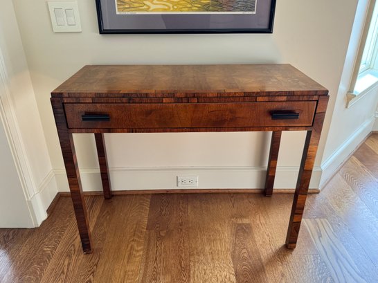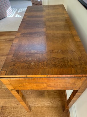 Lovely and petite table that could be used as a desk or decorative console as used in this living room. With one pull out drawer. There is some spotting possibly water marks on the top and small chip on left front leg otherwise in lovely condition. Size 36 L x 16 D x 28.5 H