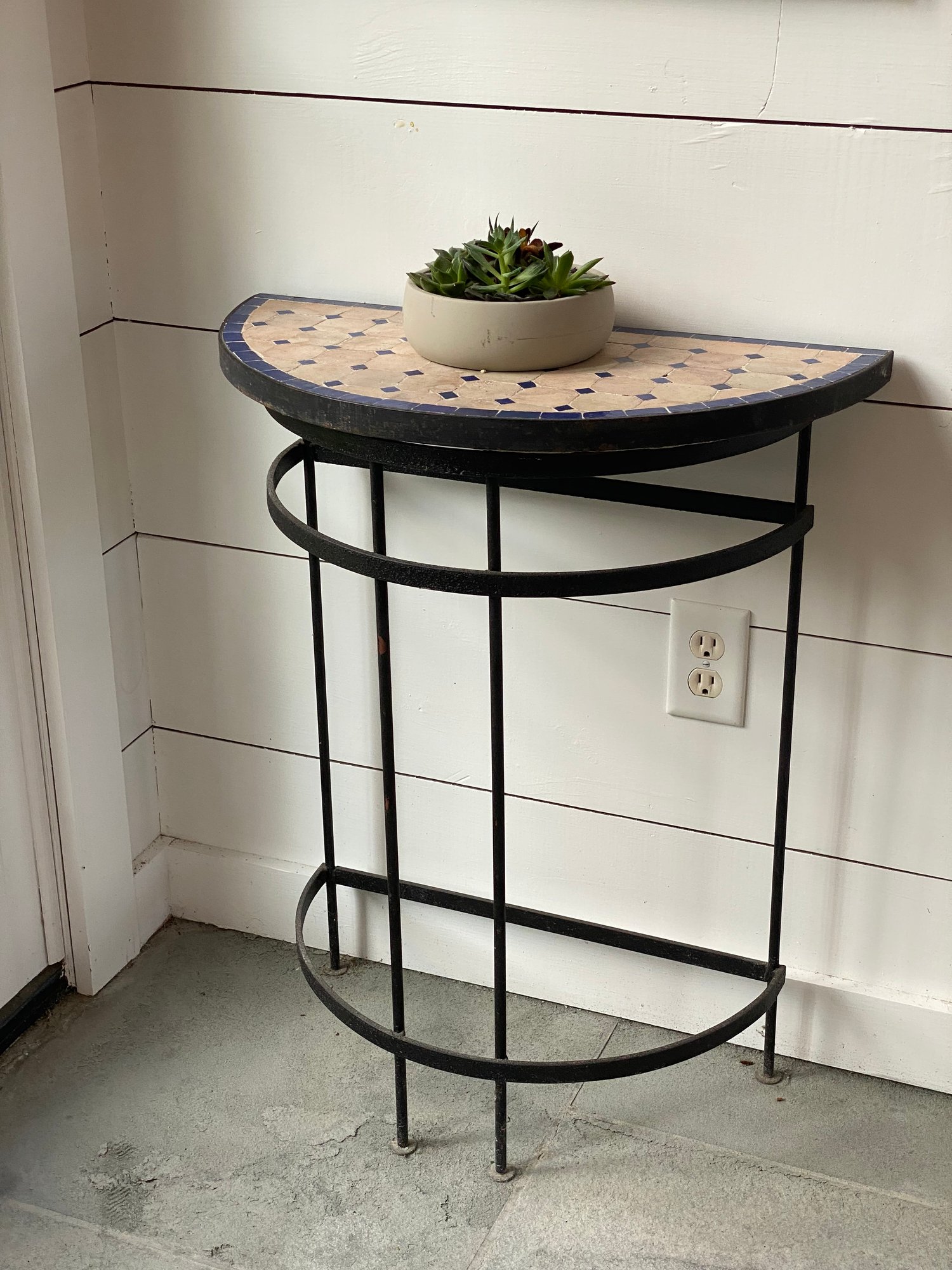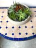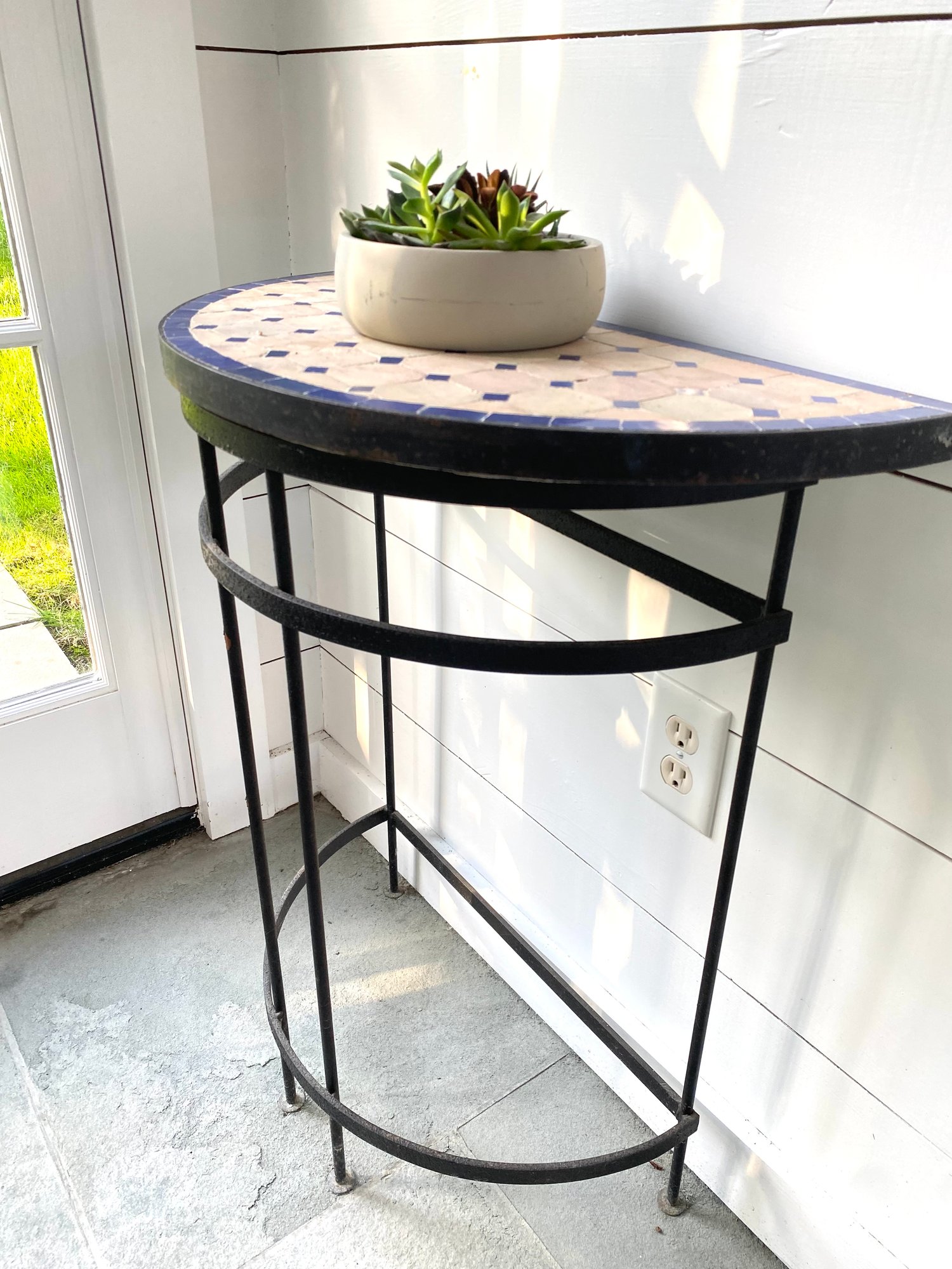 tile top in whites and blue. The mirror is black