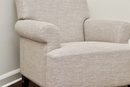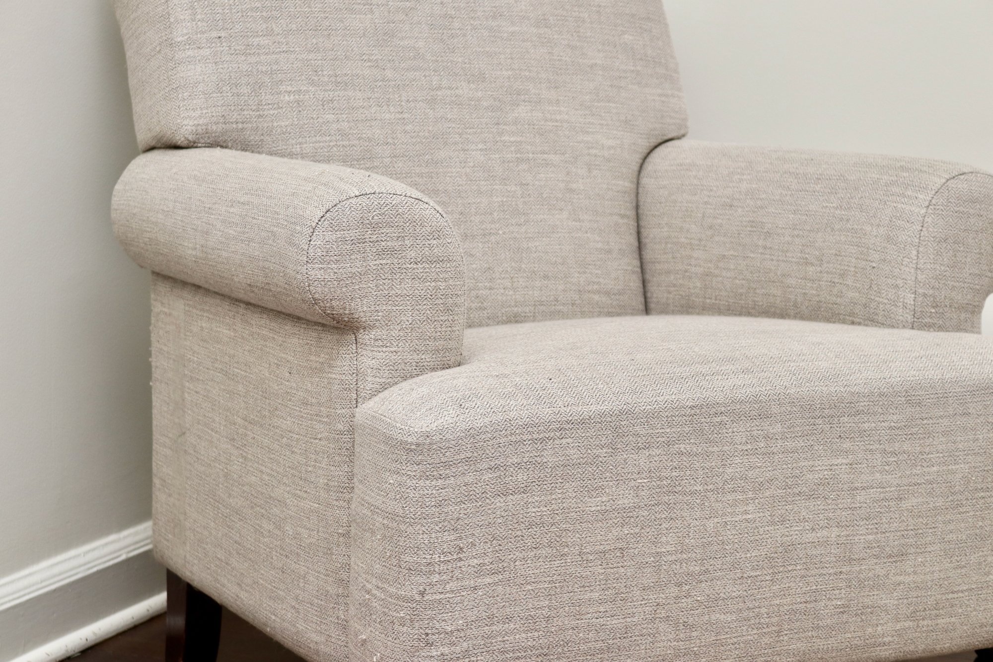 Timeless comfort meets sophisticated style in this beautifully upholstered armchair. Designed with gracefully rolled arms and a tailored silhouette, this neutral-toned chair blends seamlessly into traditional, transitional, or contemporary interiors. The textured chevron fabric offers a refined touch, while the dark-stained turned legs add an extra hint of charm. Perfect as an accent chair or reading nook essential, this piece delivers both visual appeal and everyday comfort.