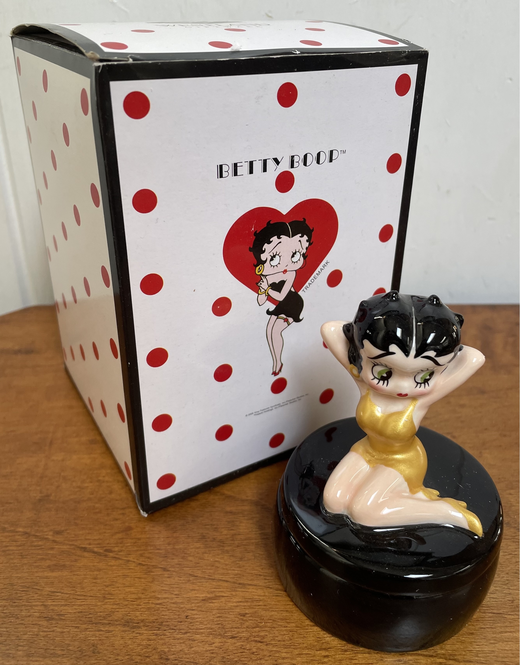This cute Betty Boop trinket box comes in it's original box and was never used. The trinket box is 4" high by 2 3/4" wide. It's in perfect shape.