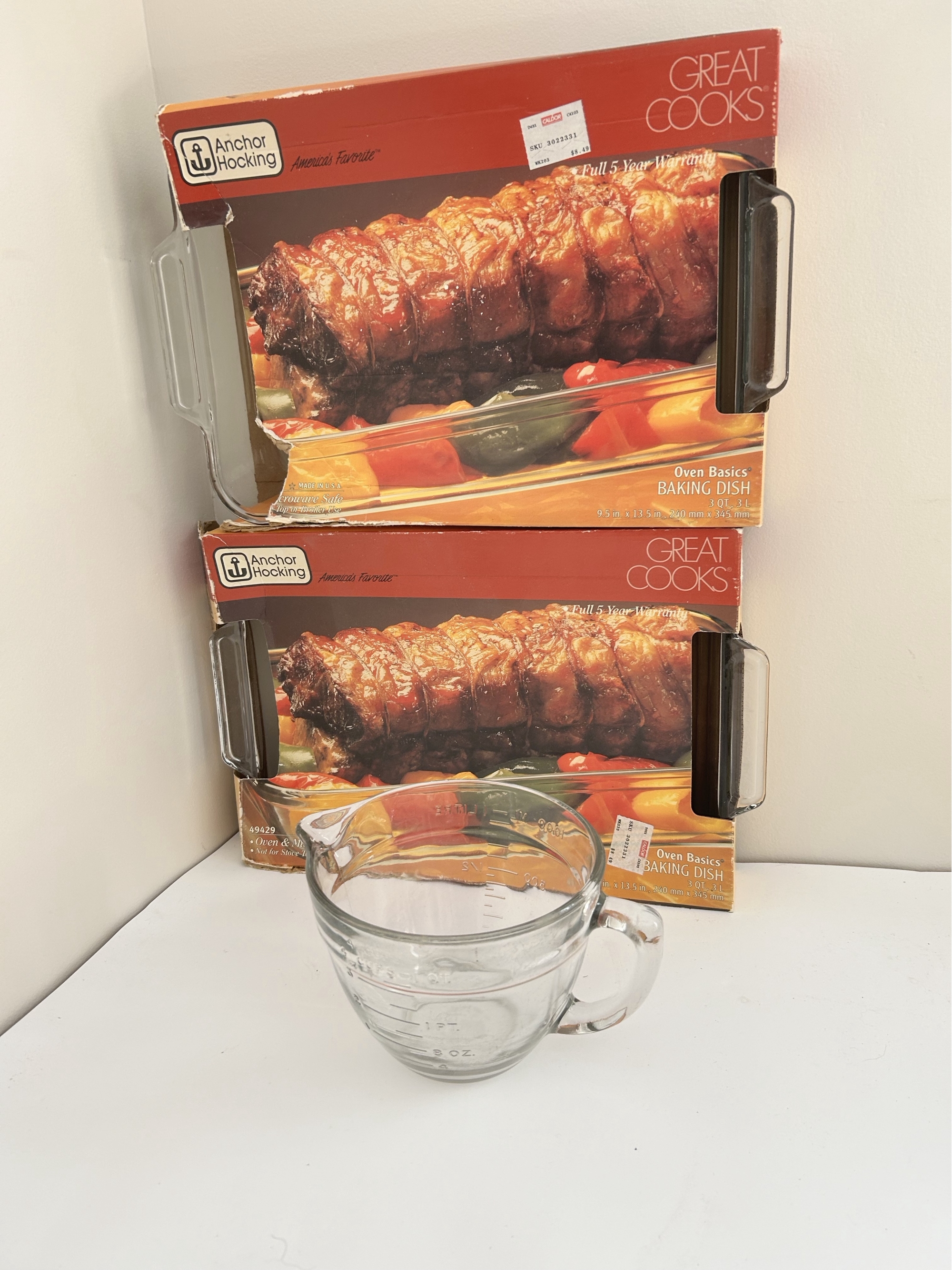 Unopened boxes Anchor Hocking and throwing in what appears to be an unused medium sized Anchor Hocking measuring cup