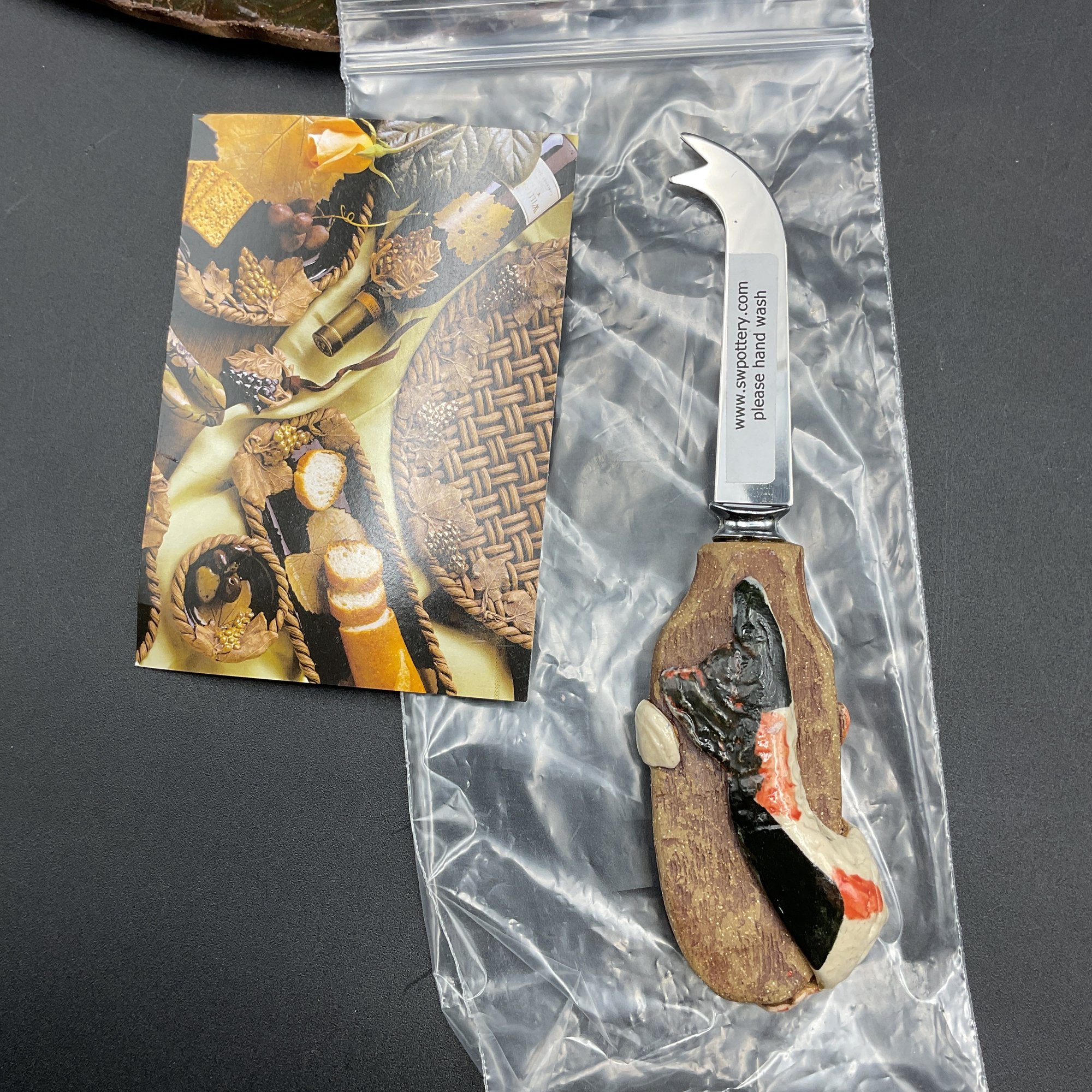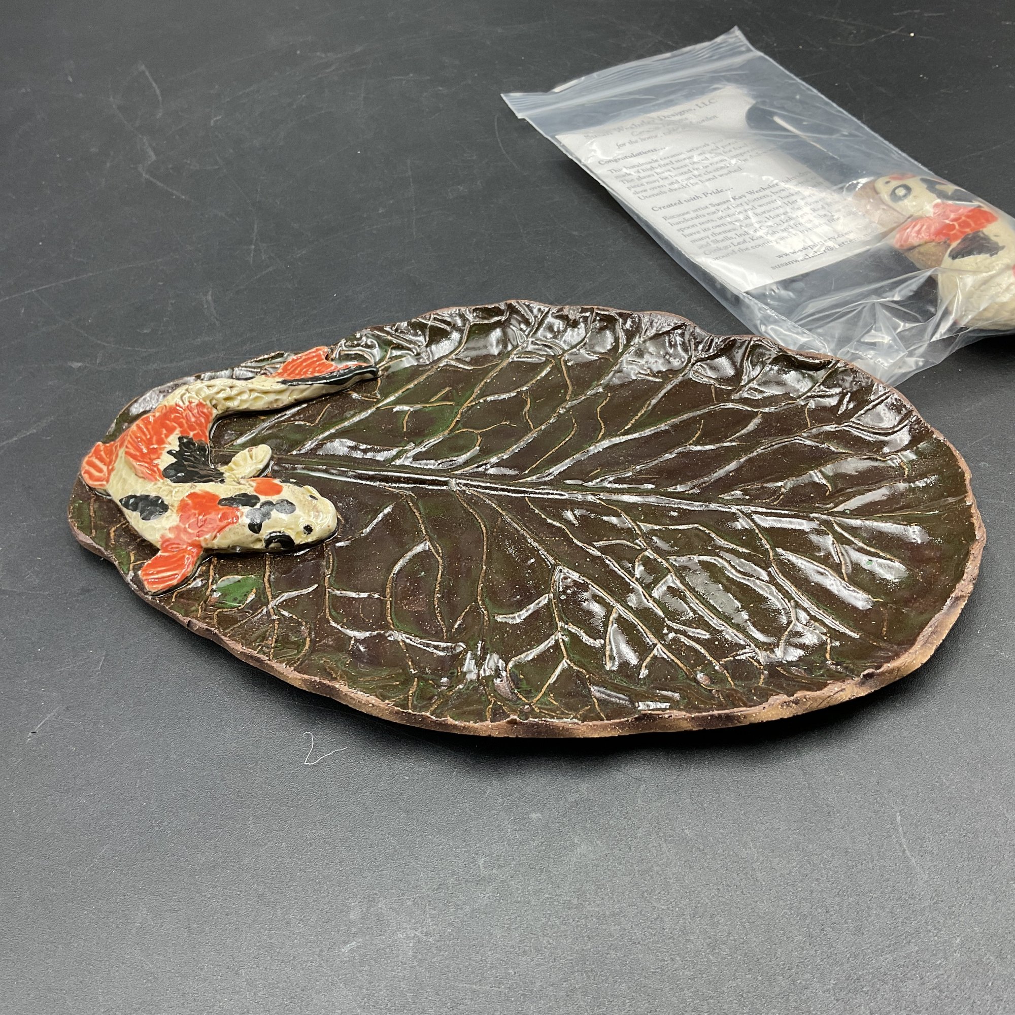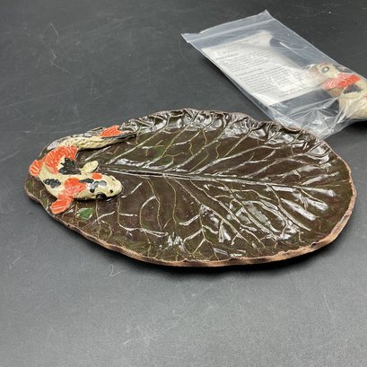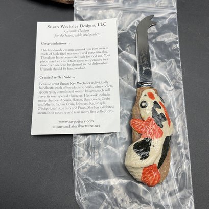 Elegant handmade cheese/appetizer plate with matching knife from Susan Wechsler Designs, plate signed on the bottom. Features a Koi fish motif on both pieces. All in excellent condition with original paperwork and sticker on knife shows unused condition.