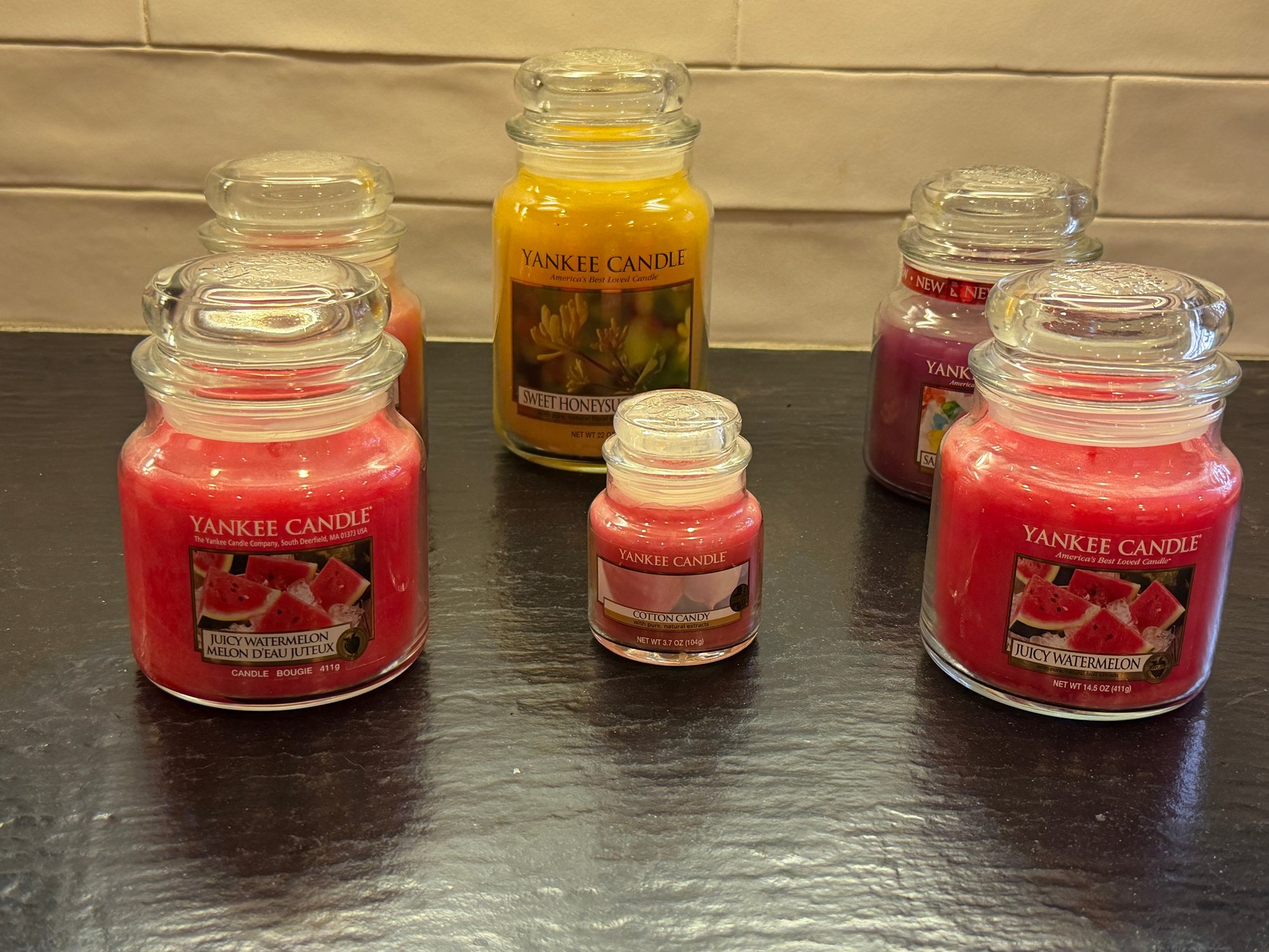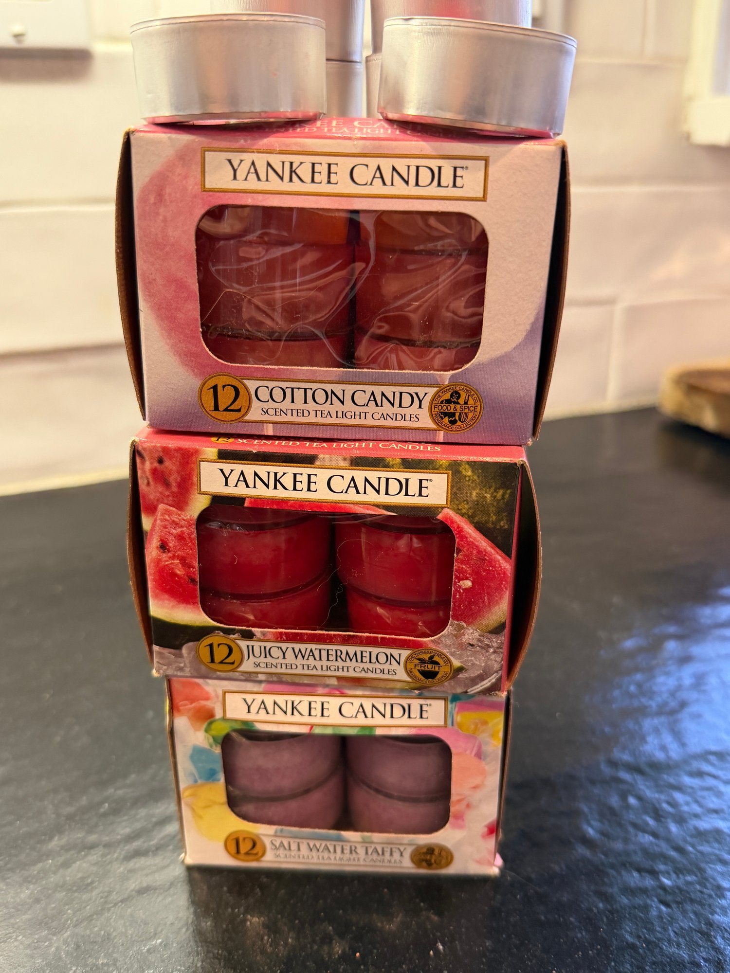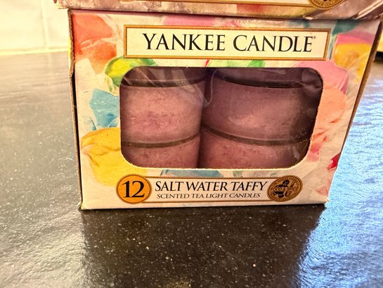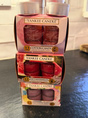 Three boxes Yankee Candle Tea light candles, Cotton Candy, Juicy Watermelon & Salt Watter Tafft