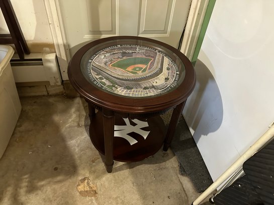 This table is 21 1/2" round by 22 1/2 high. It has a single drawer and tempered glass top with yankee stadium pictured on top and yankee logo on bottom shelf
