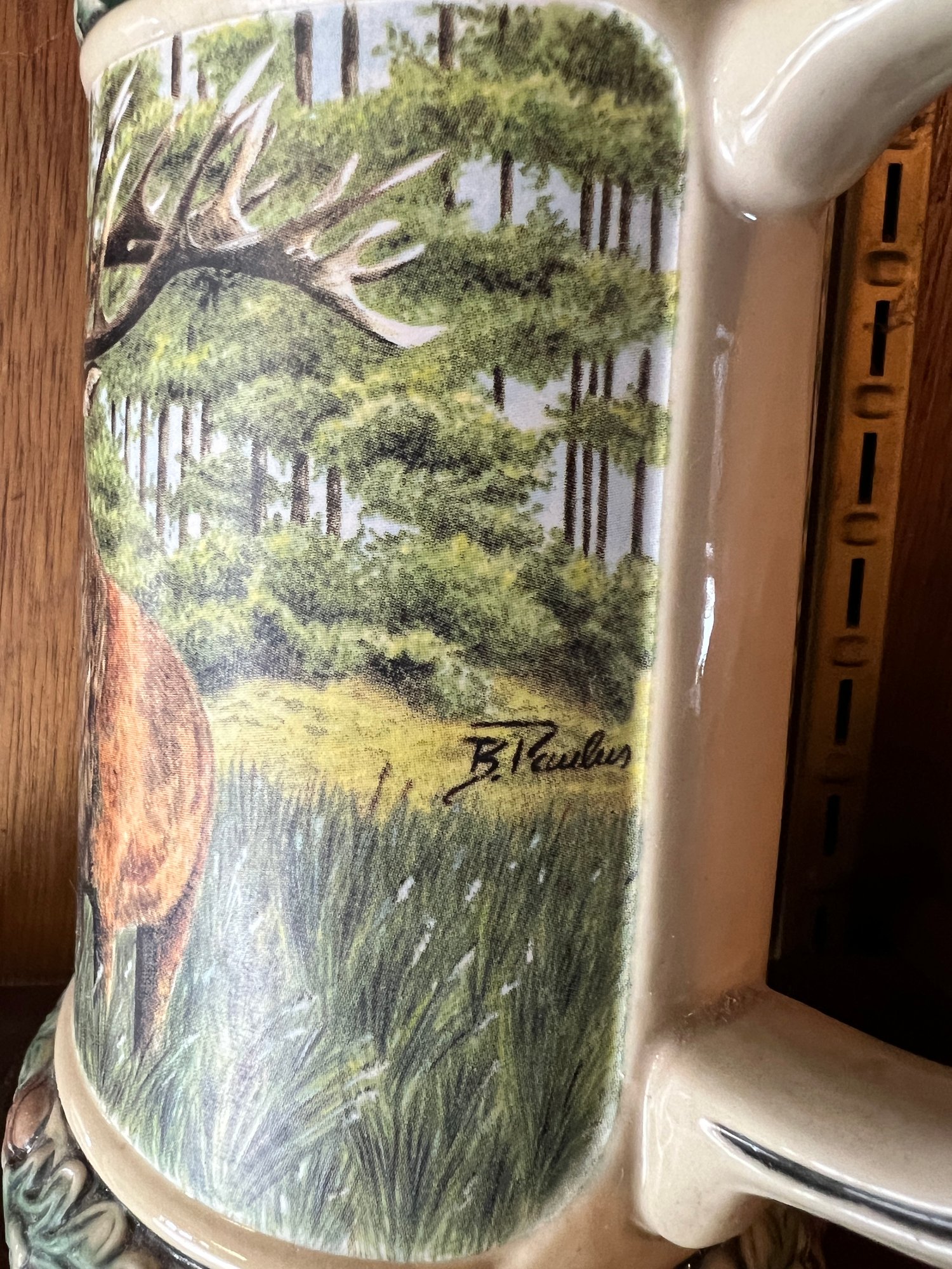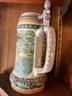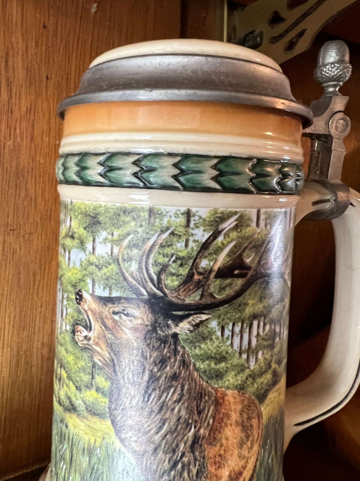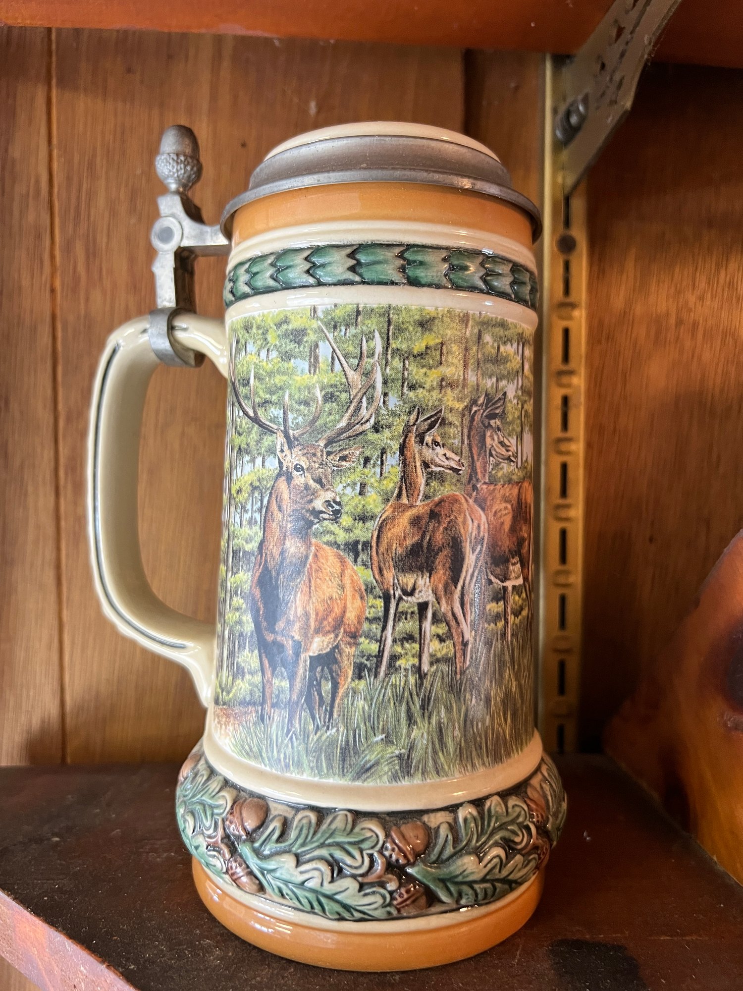 German style pewter lidded beer stein featuring a stag and deer design with an acorn and oak leaf motif border and acorn finial on the stein lid.
