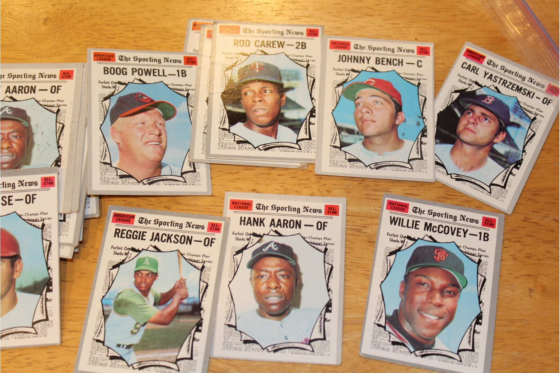 1970 Topps Series as follows, 6 Yankees, 11 White Sox, 13 Twins, 17 Tigers, 16 Senators, 4 Royals, 17 Red Sox, 35 Reds, 16 Pirates, 9 Seattle Pilots!, 8 Phillies, 21 Padres, 13 Orioles, 7 Mets, 17 Giants, 12 Indians, 9 Dodgers, 9 Expos, 8 Cubs, 12 Cardinals, 13 Braves, 18 Astros, 7 Angels, 13 A's, 7 Checklists, 5 Leader Cards, 18 Rookies series, 27 Team Cards, 13 Play-off cards, 39 Sporting News Specials See lead photo.