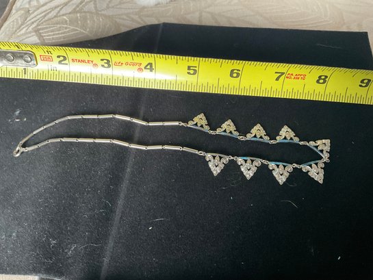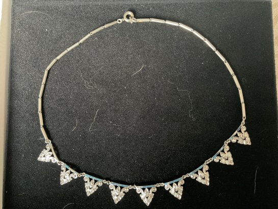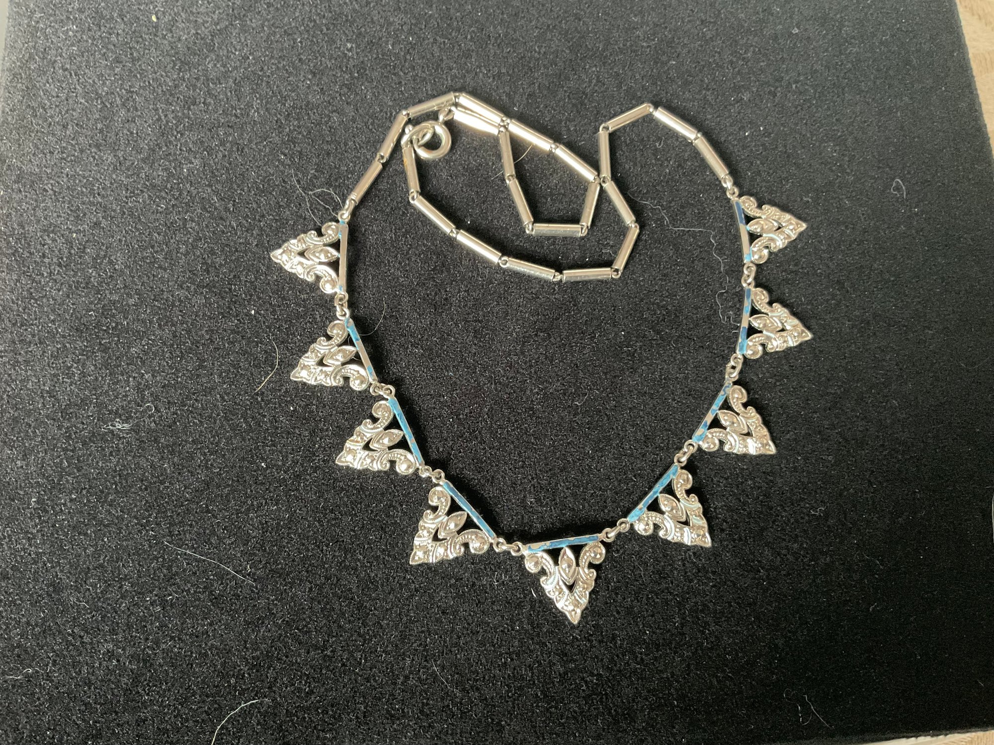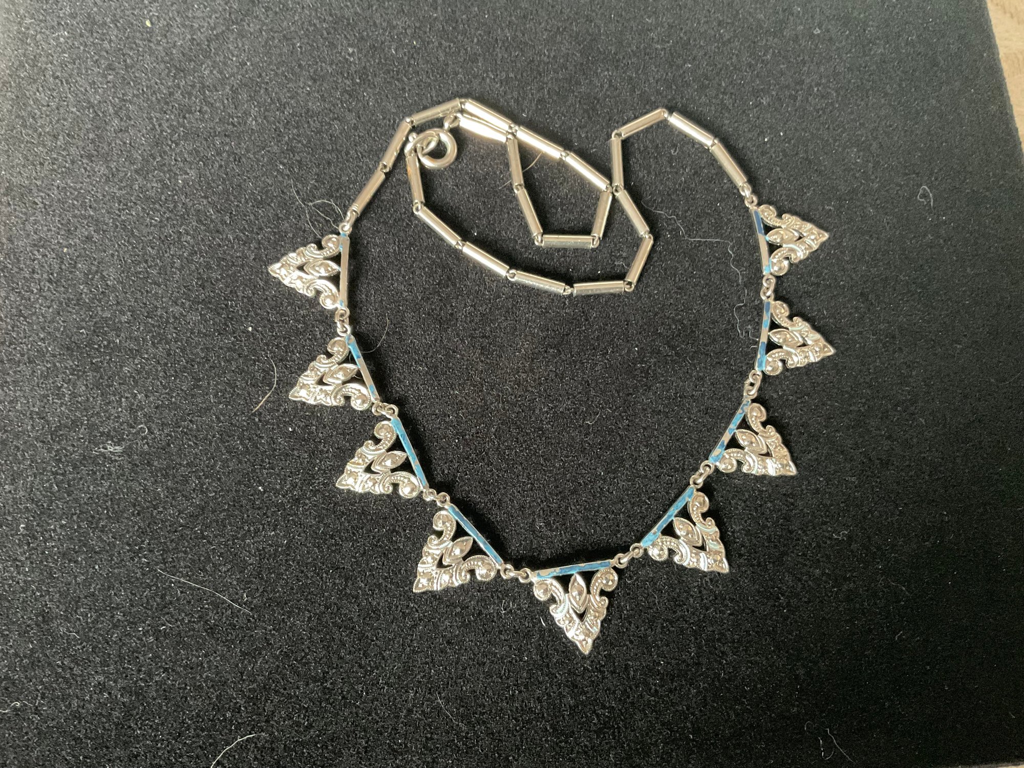 Exquisite vintage sterling silver necklace featuring intricate filigree triangular drops/panels accented with sparkling marcasite stones and vivid blue enamel inlay (likely guilloche-style for that subtle engine-turned glow). The chain consists of connected hexagonal silver links with a secure clasp, leading to a bold, dangling lower section of openwork triangles edged in marcasite and filled with rich blue enamel for contrast and elegance. Timeless Art Deco/Edwardian-inspired design—excellent pre-owned condition with intact enamel, secure stones, and beautiful patina.