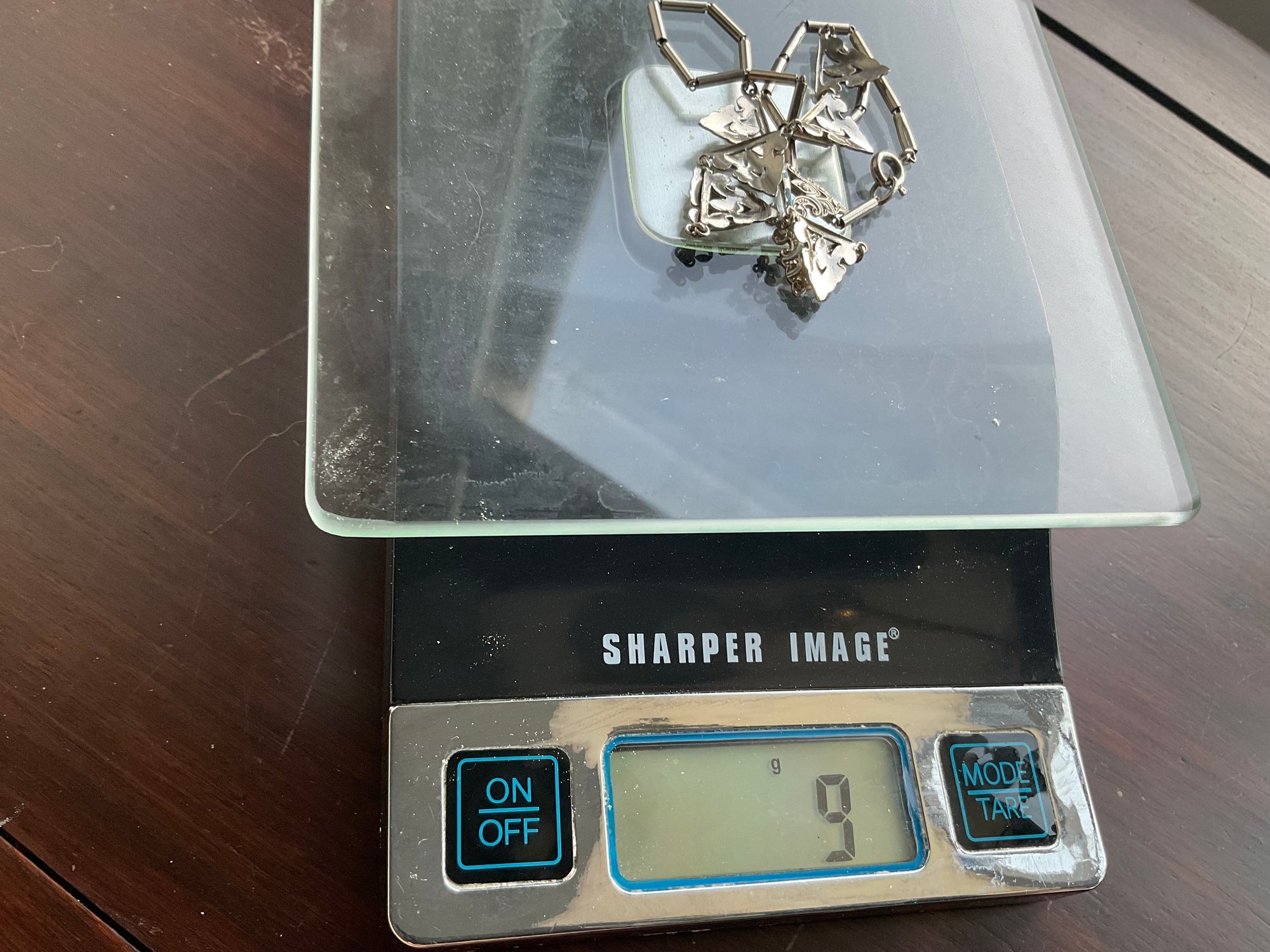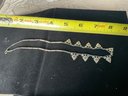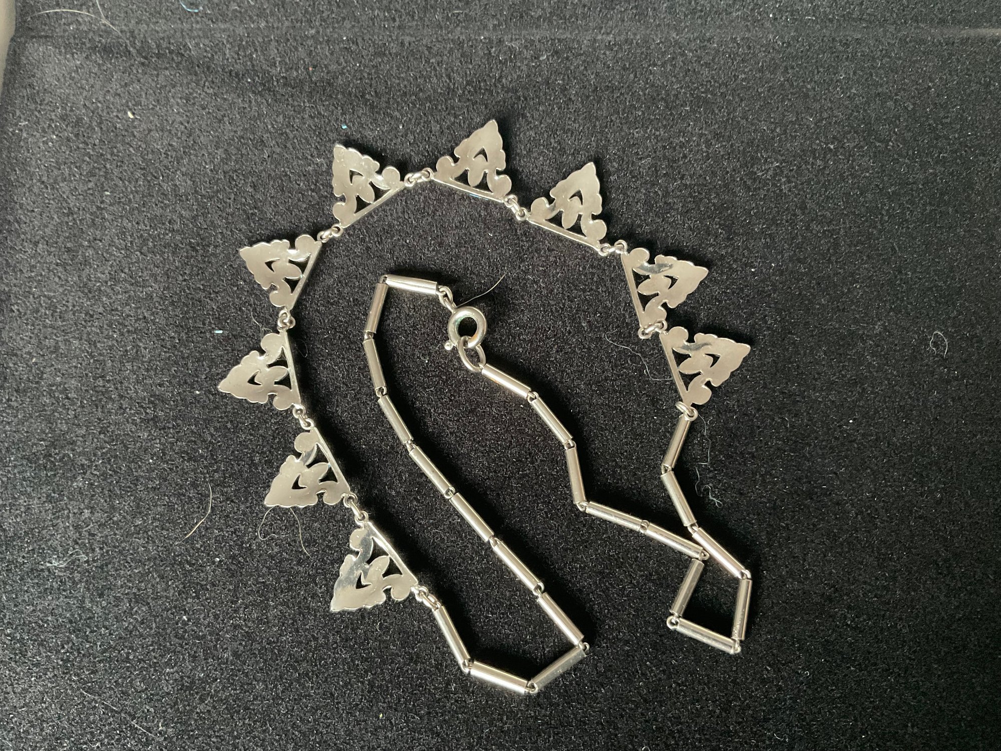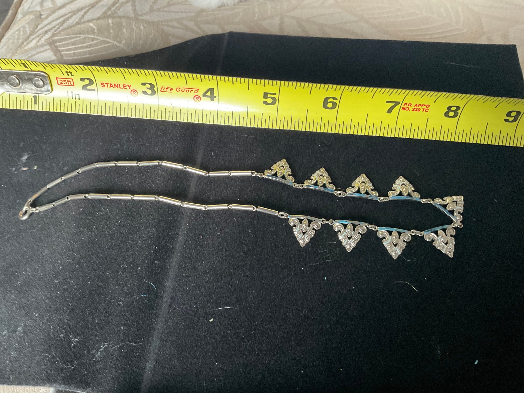 Exquisite vintage sterling silver necklace featuring intricate filigree triangular drops/panels accented with sparkling marcasite stones and vivid blue enamel inlay (likely guilloche-style for that subtle engine-turned glow). The chain consists of connected hexagonal silver links with a secure clasp, leading to a bold, dangling lower section of openwork triangles edged in marcasite and filled with rich blue enamel for contrast and elegance. Timeless Art Deco/Edwardian-inspired design—excellent pre-owned condition with intact enamel, secure stones, and beautiful patina.