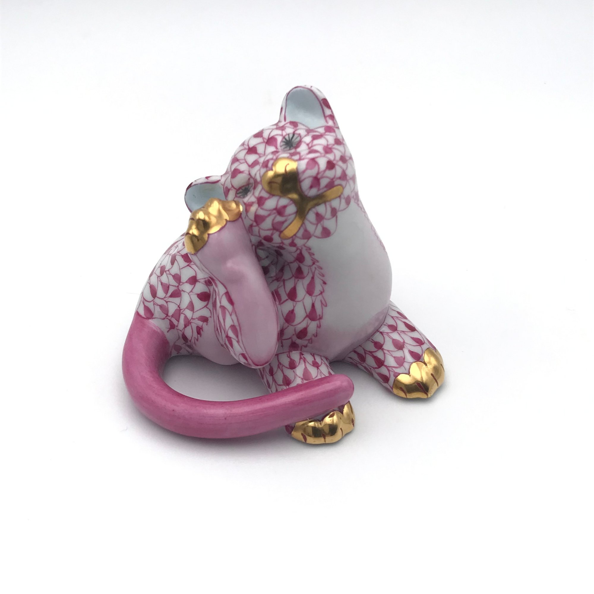 A charming and authentic Herend porcelain figurine, hand-painted in the renowned Pink Fishnet (SVHP) pattern. This delightful piece depicts a cat in a playful, grooming pose, with one paw raised near its face and its long tail curled around its body. The figurine features beautiful 24k gold accents on the paws, ears, and facial features, highlighting the exceptional artistry. The tail is a solid, vibrant pink.