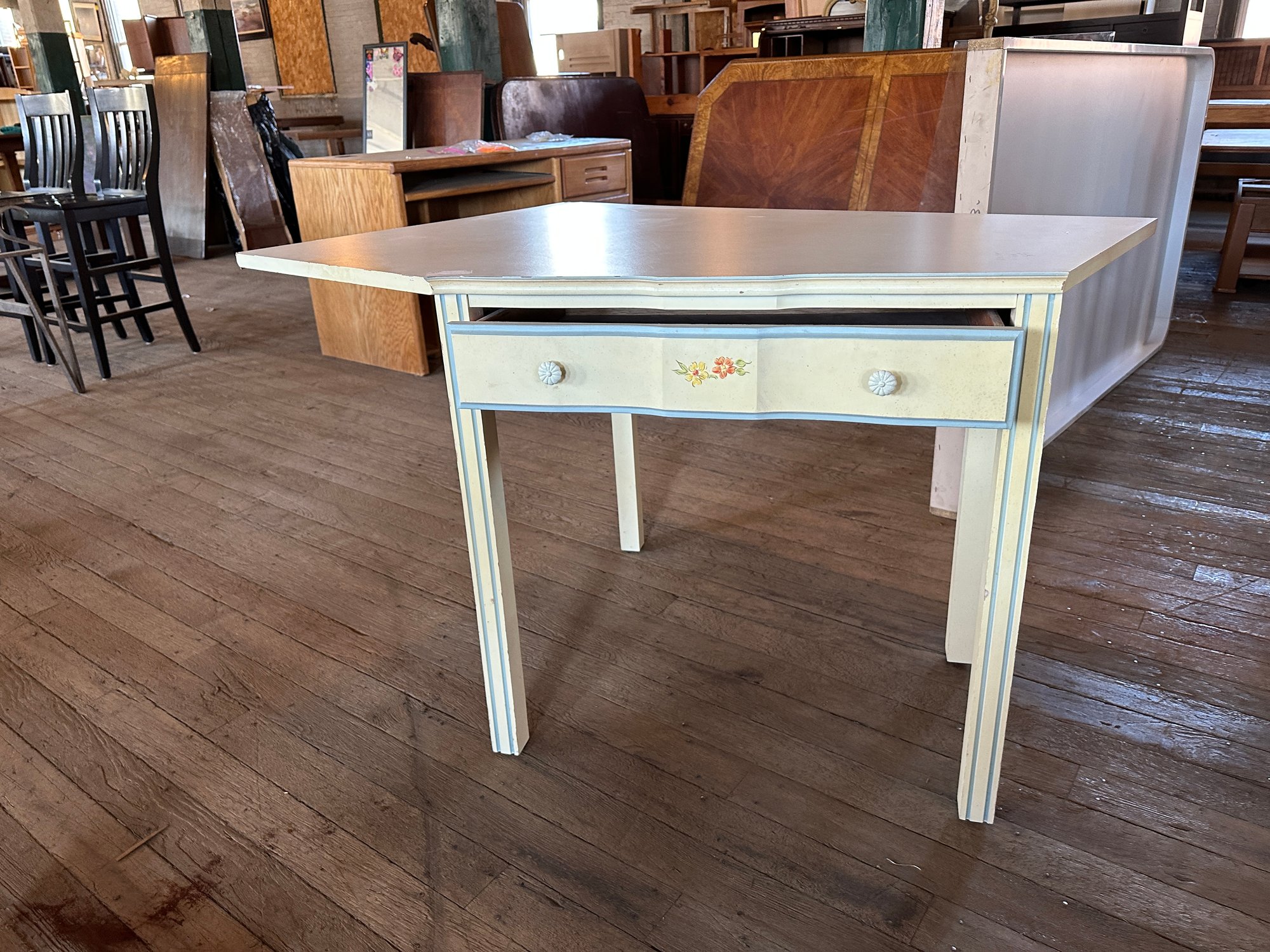 painted cream with blue trim. I was going to call this a corner desk but then I realized that it was just extended 44 x30 x 30