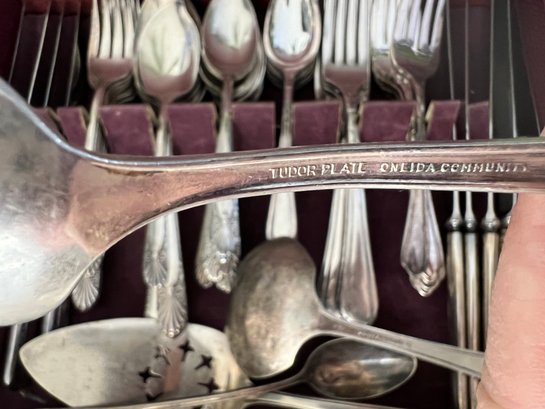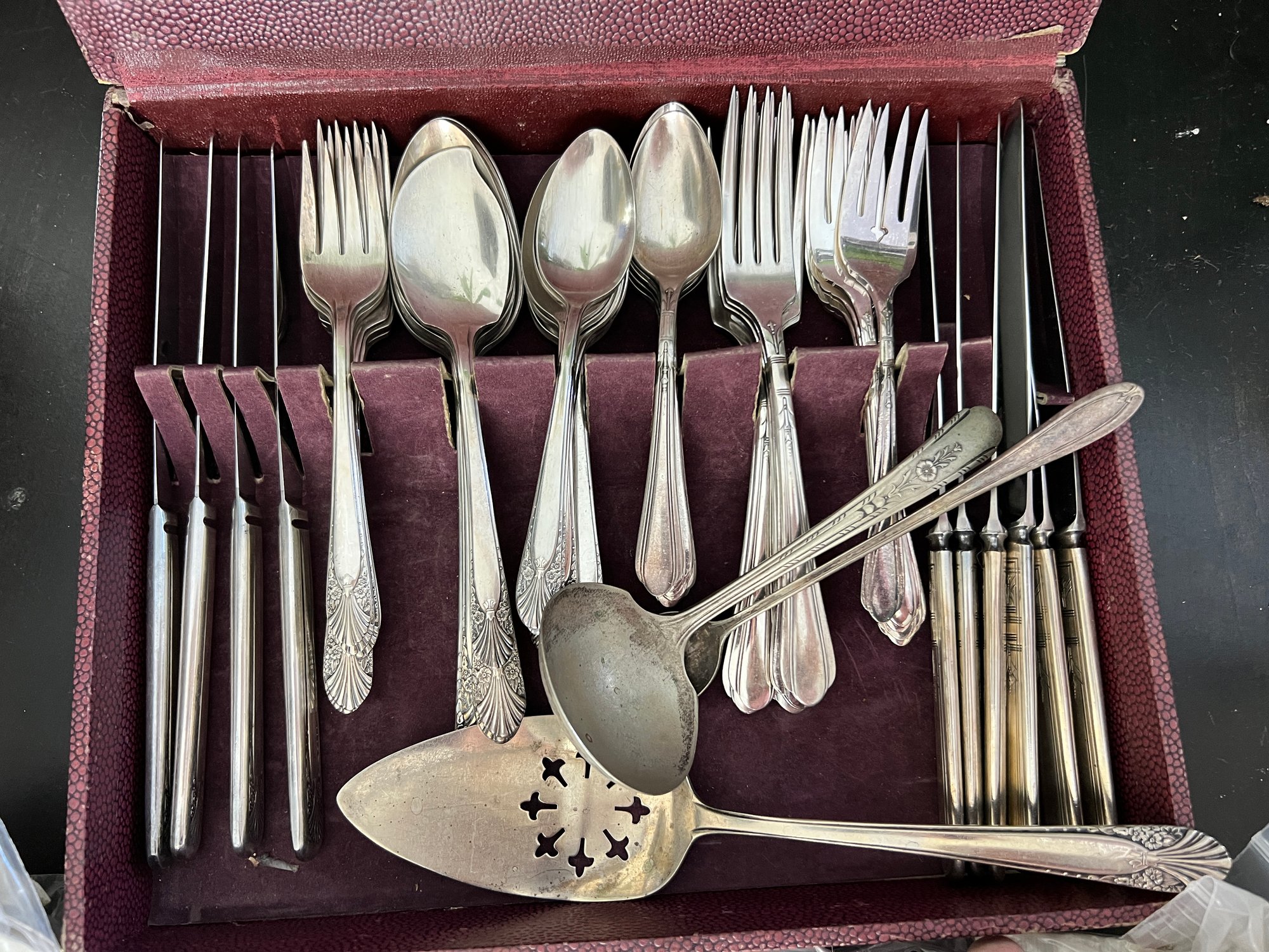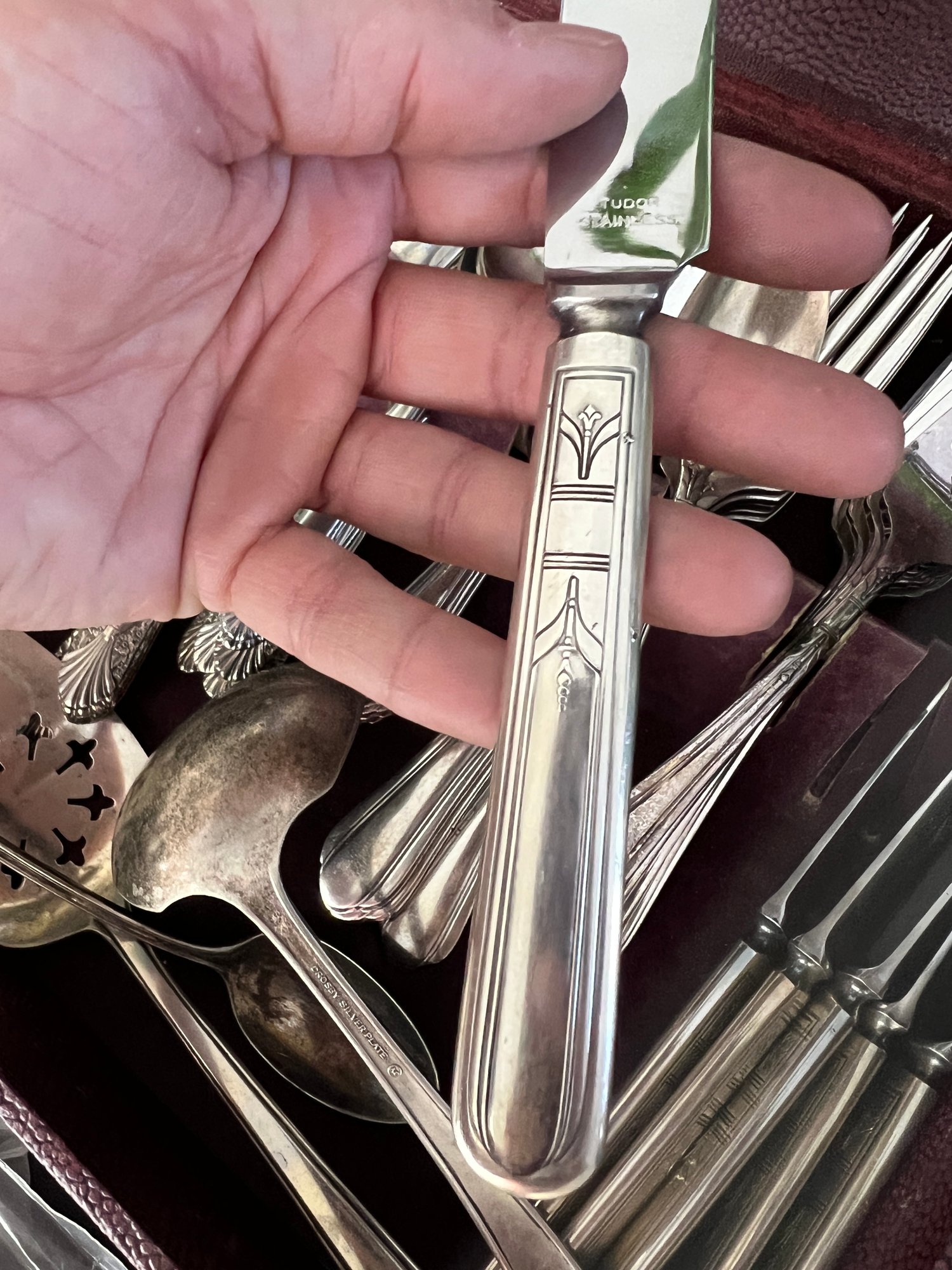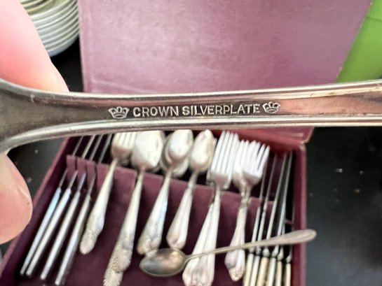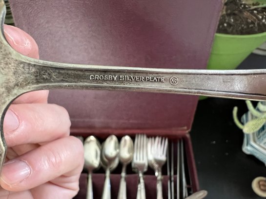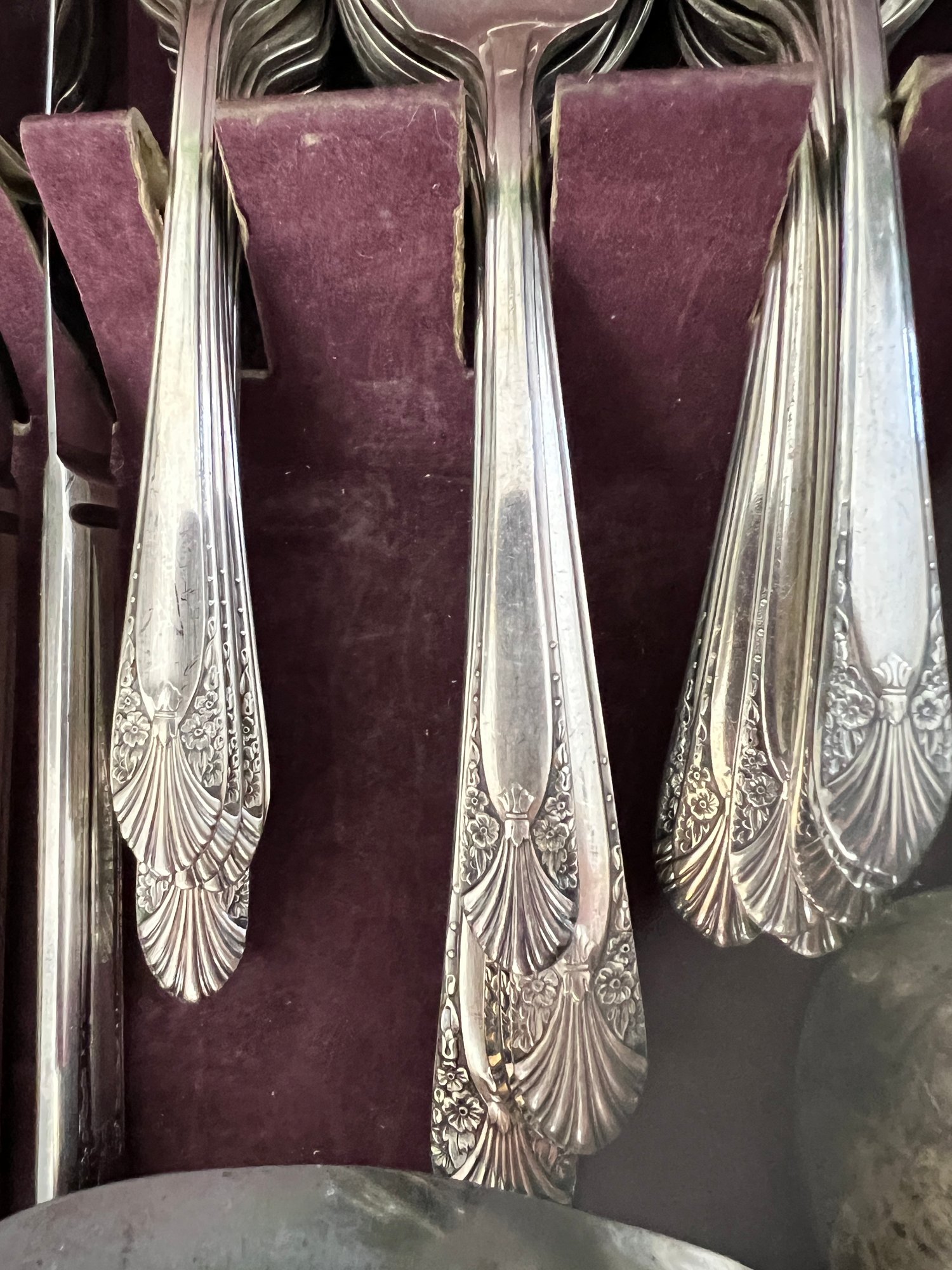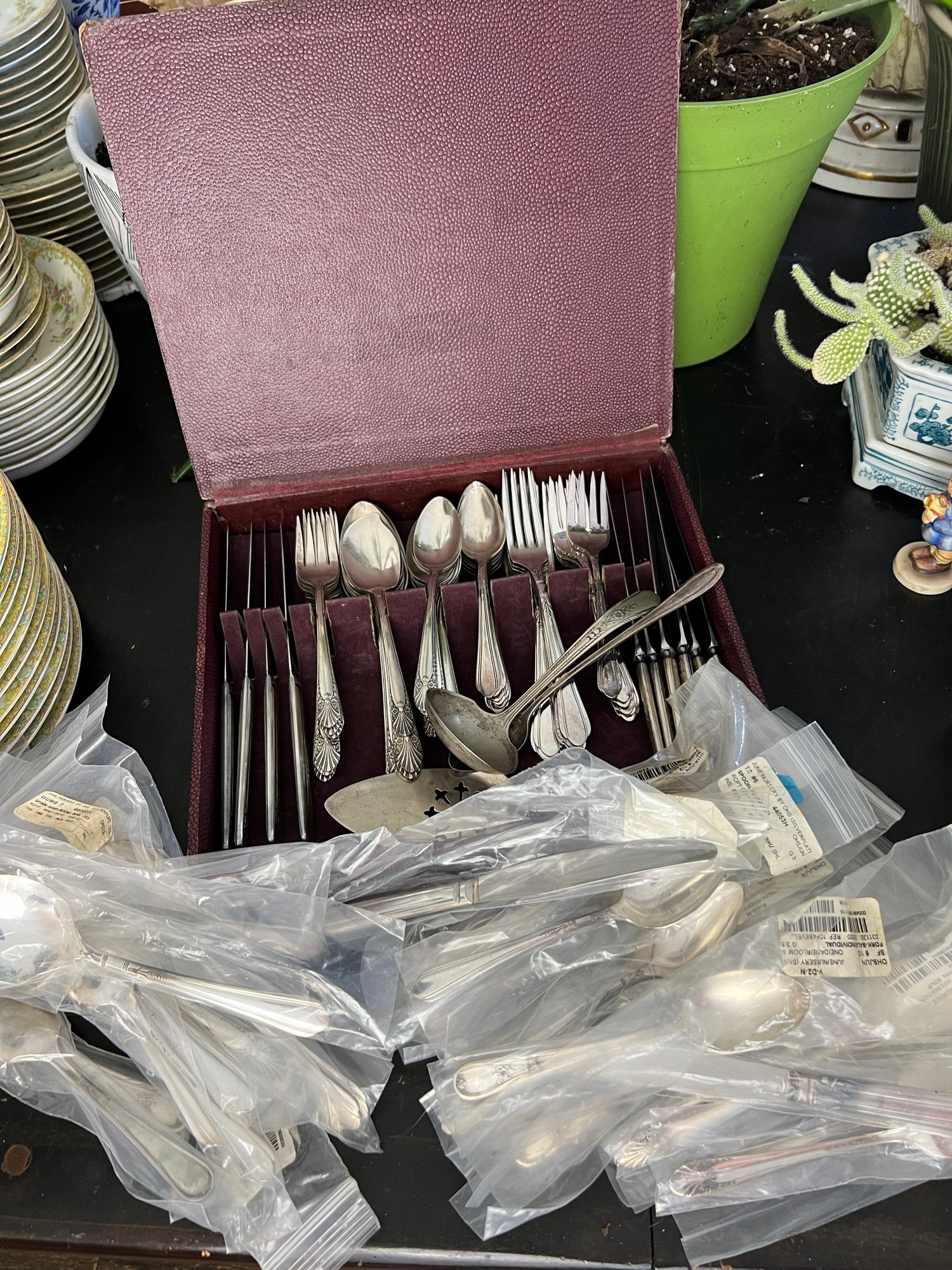 Wonderful extensive grouping of antique to vintage silver plate flatware - some of it shown in the case (included) and others as shown in their original plastic sleeves. Pieces include Crosby, Crown and Tudor by Oneida.