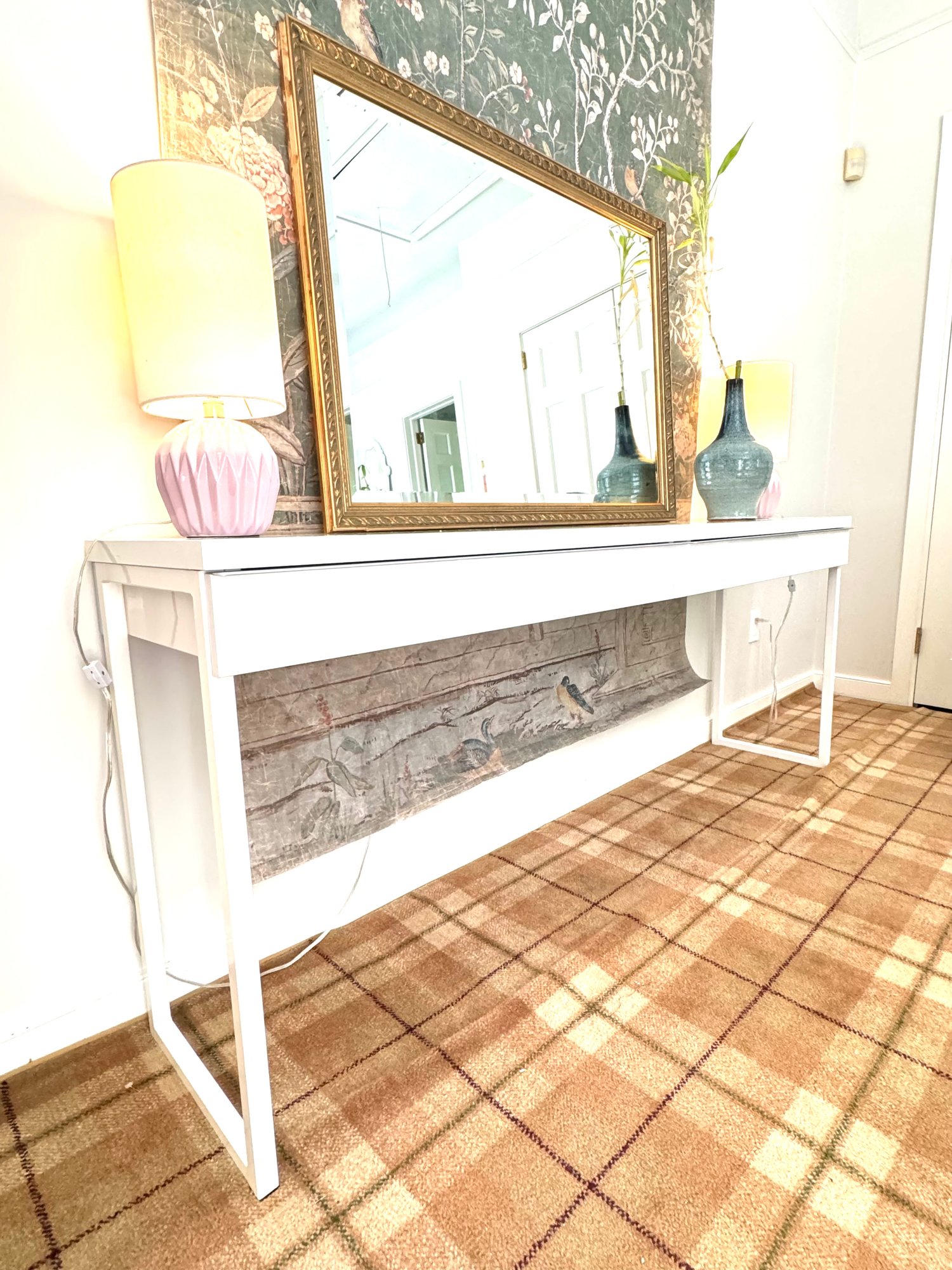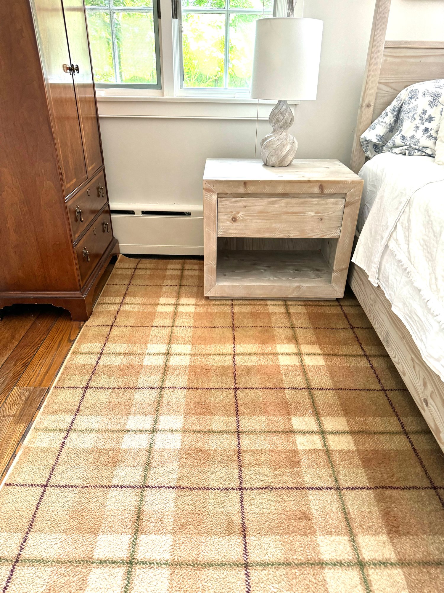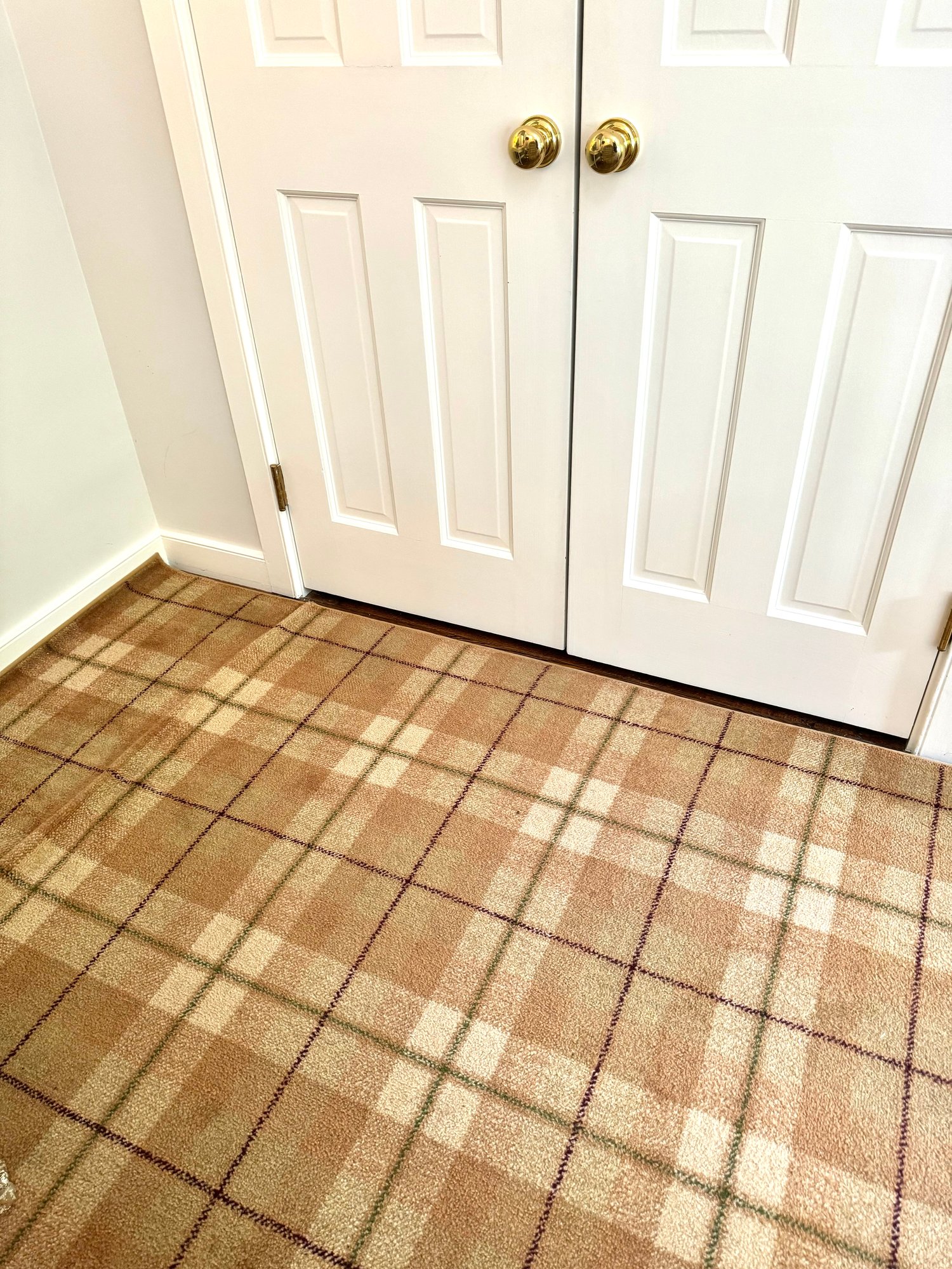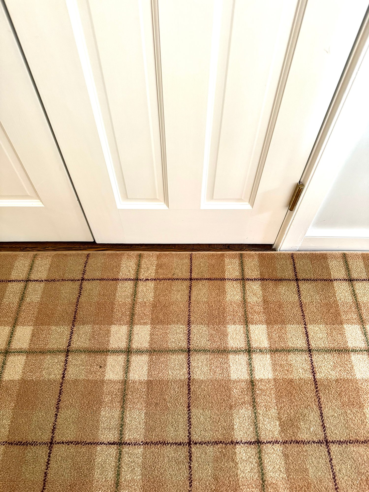 This very fab carpet is a wonderful plaid pattern in neutral tones. Overall this carpet is in very good condition as has been in a guest room with lite use. Note that there is an area where it has a fold due to its size in the room and unsure whether this will flatten out and a small ring spot approx 1”. Otherwise it’s a very stylish carpet and perfect for large family rooms where furniture would cover fold should it