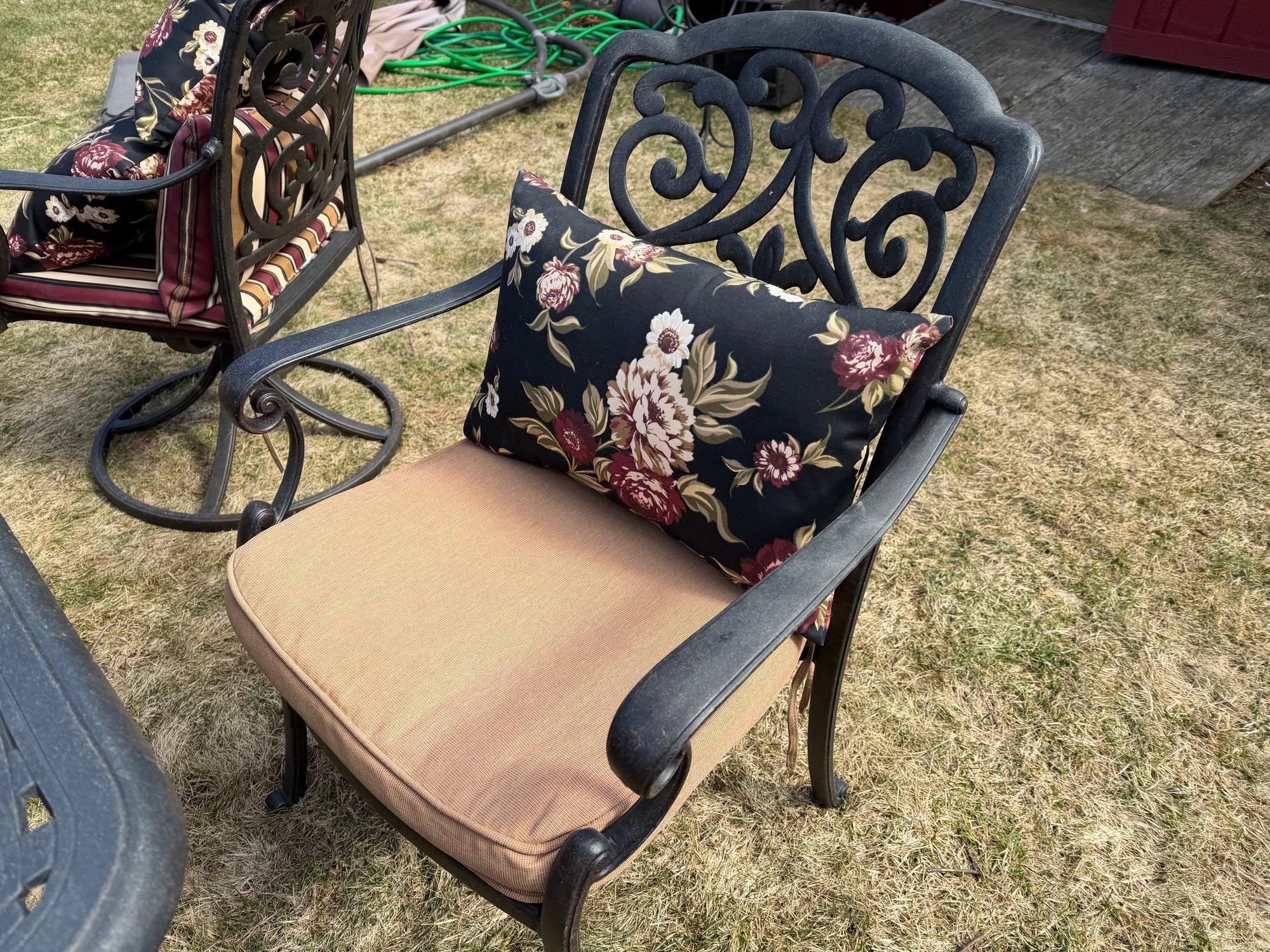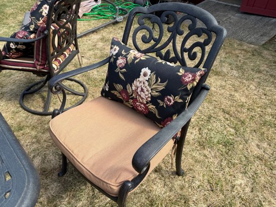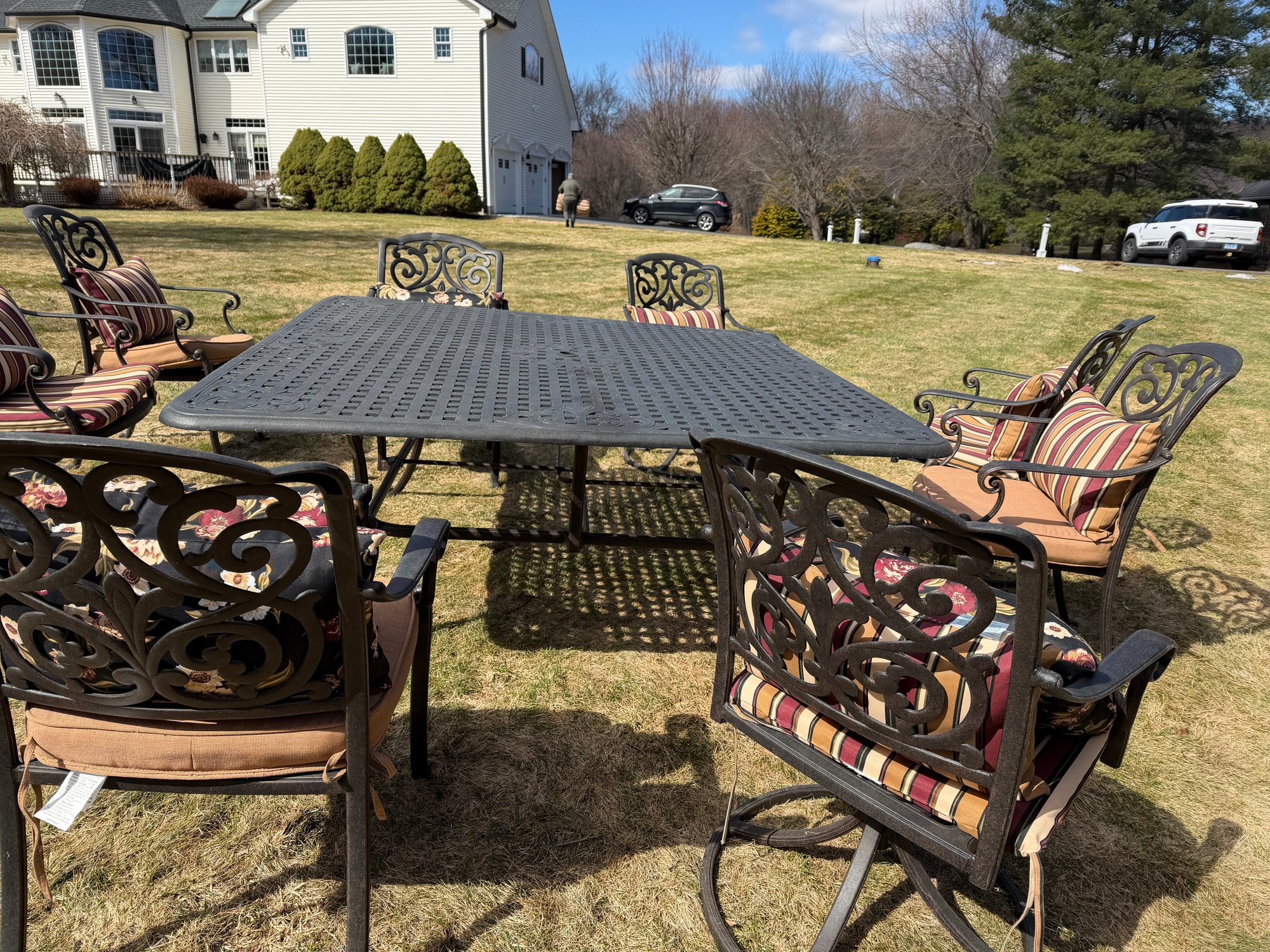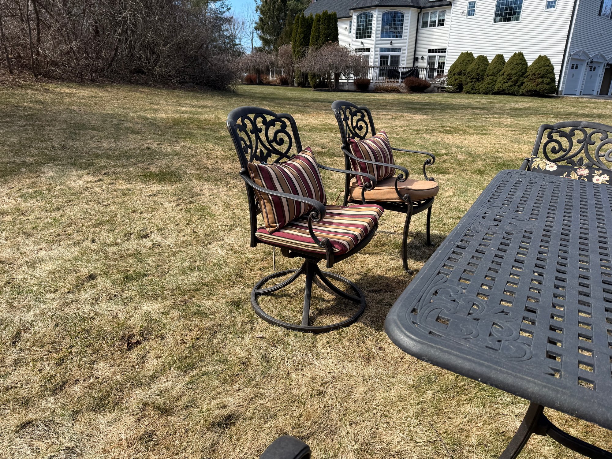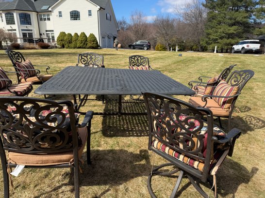 4 chairs swivel and rock, the other 4 are stationary legs. Really good quality in excellent condition. The cushions are by Plow and Hearth. top comes off base for travel