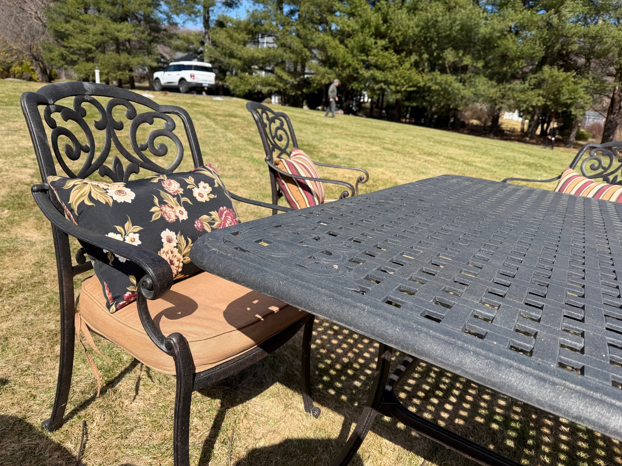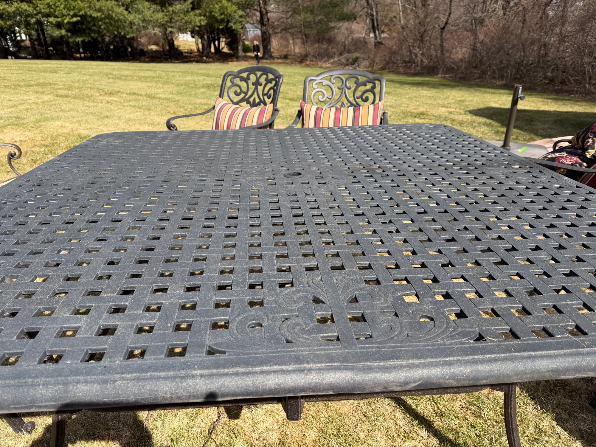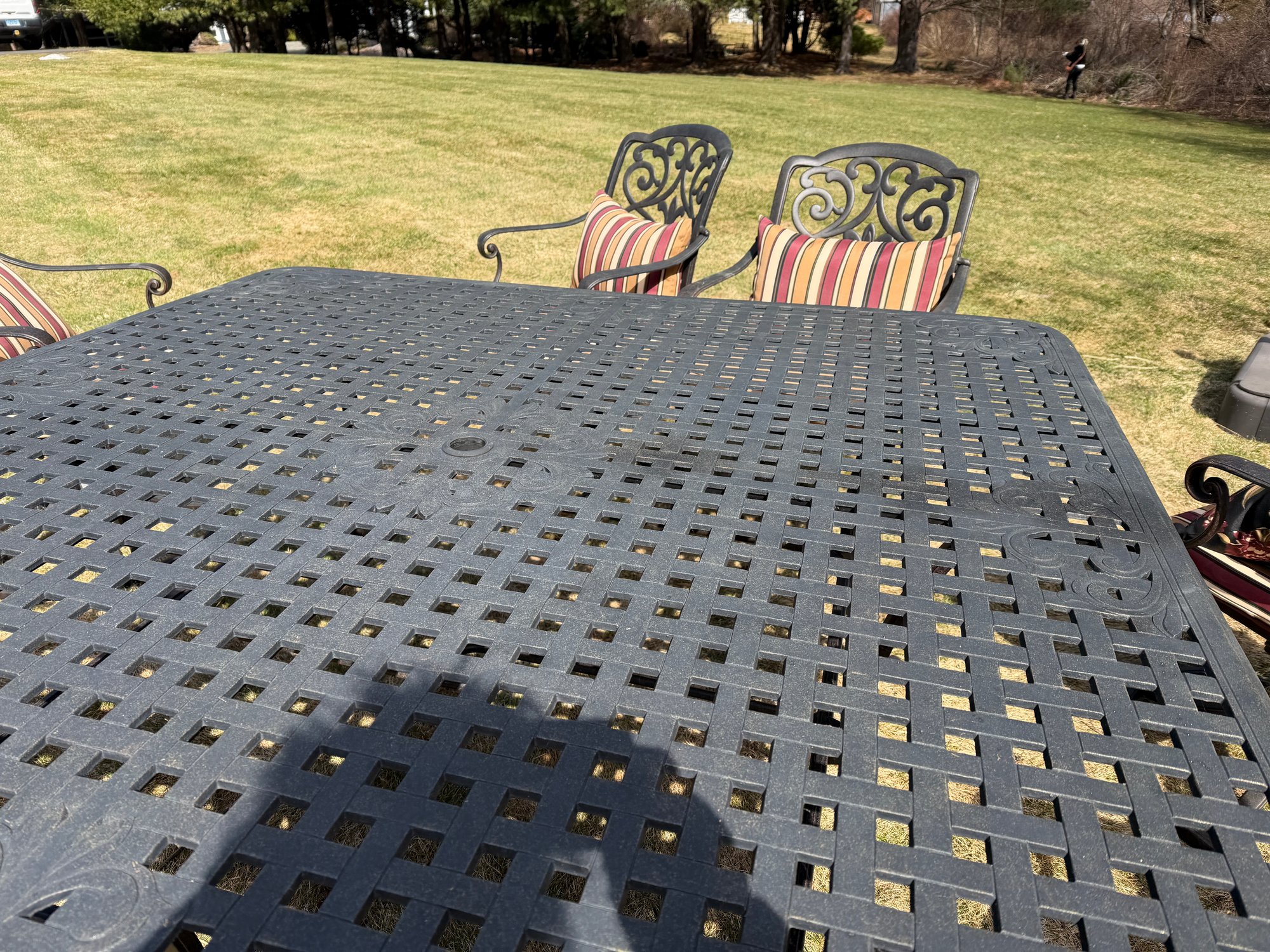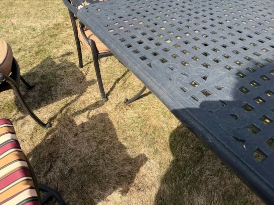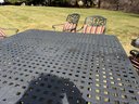4 chairs swivel and rock, the other 4 are stationary legs. Really good quality in excellent condition. The cushions are by Plow and Hearth. top comes off base for travel