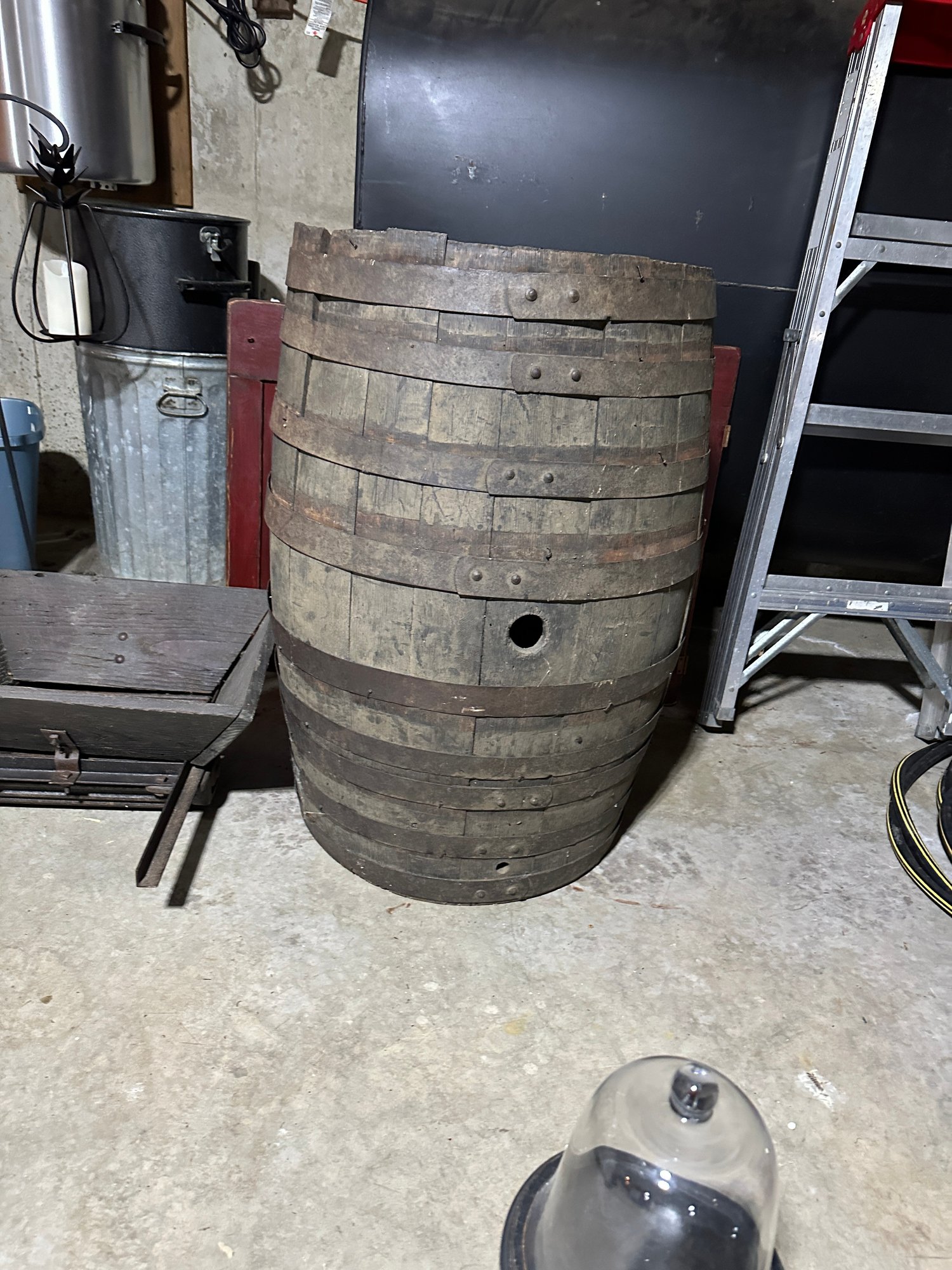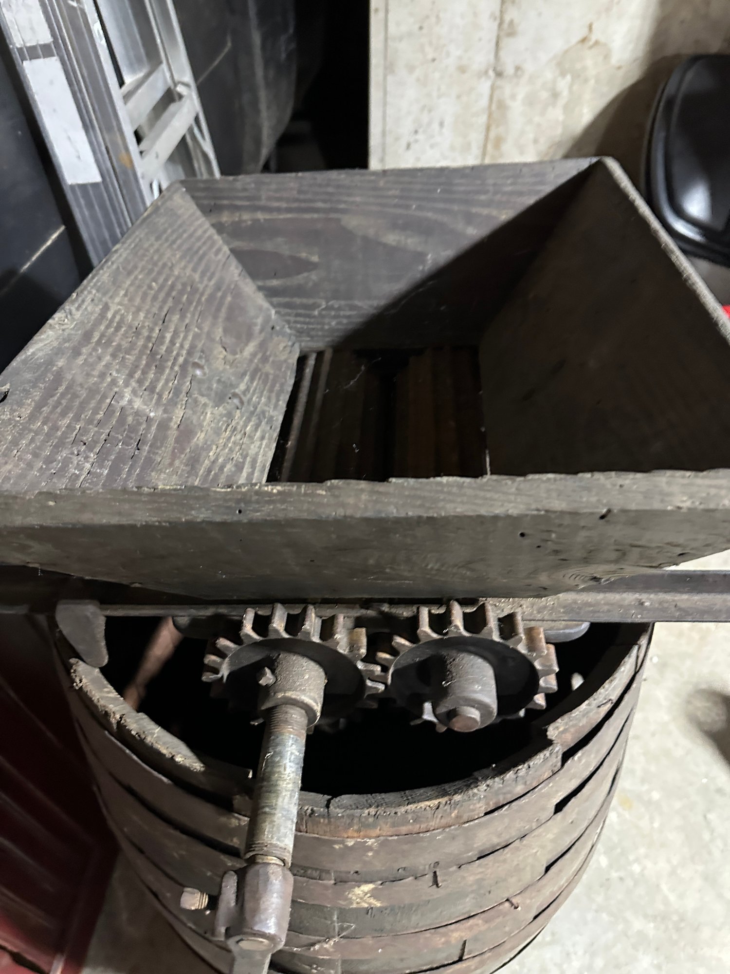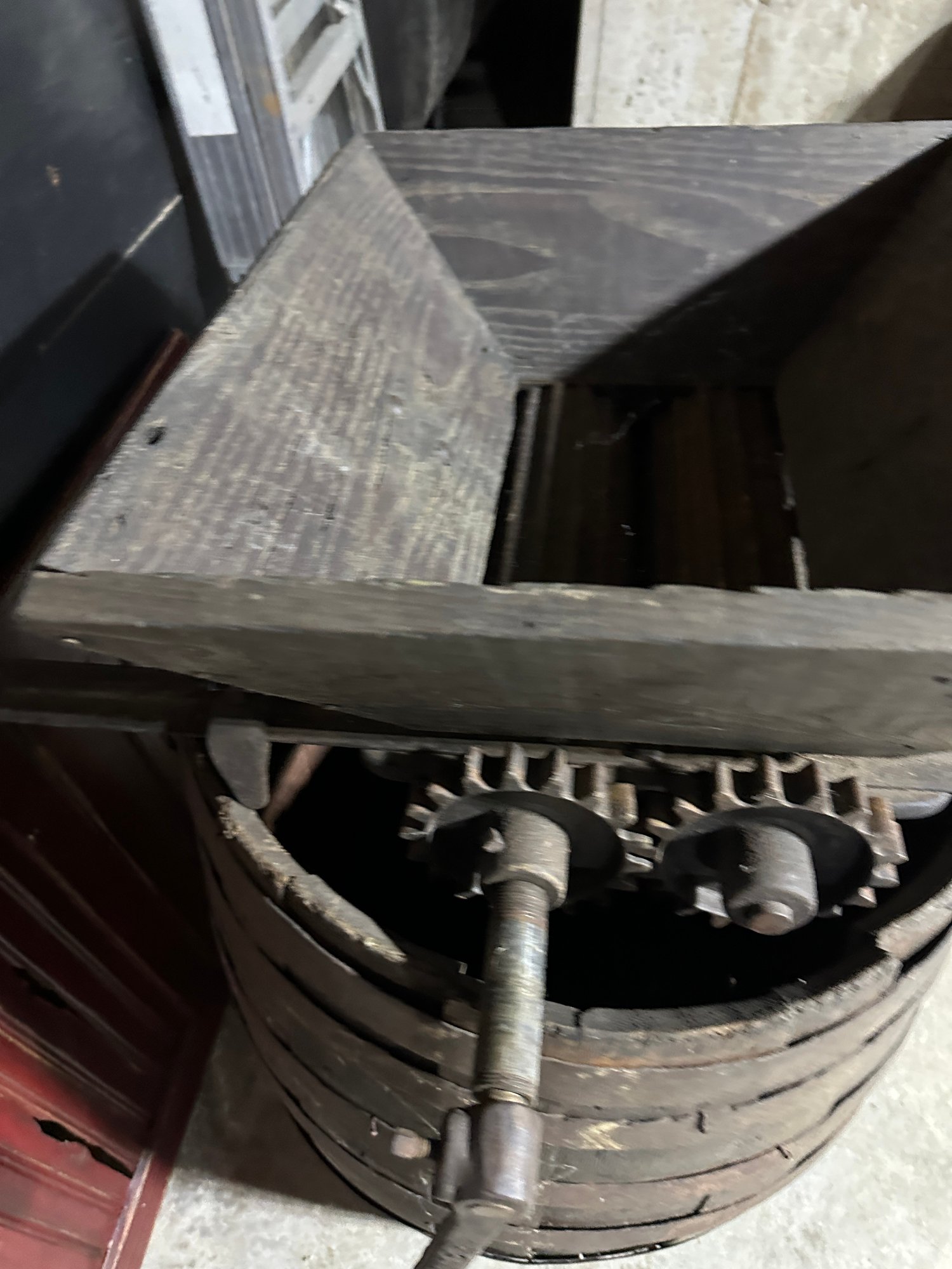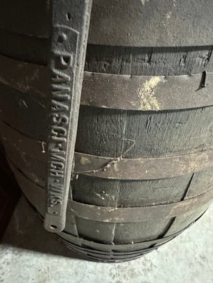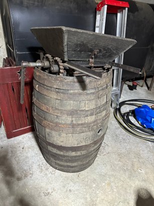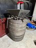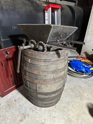 cider press has turn handle with Panasci Mfg. Co. stamped Barrel is 53"h and 21" wide at top
