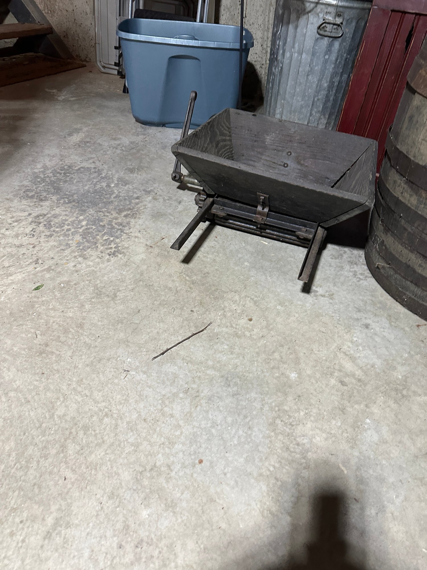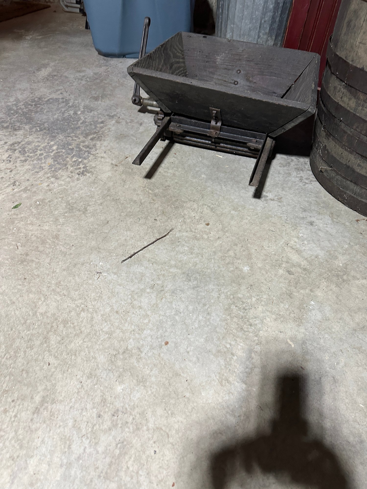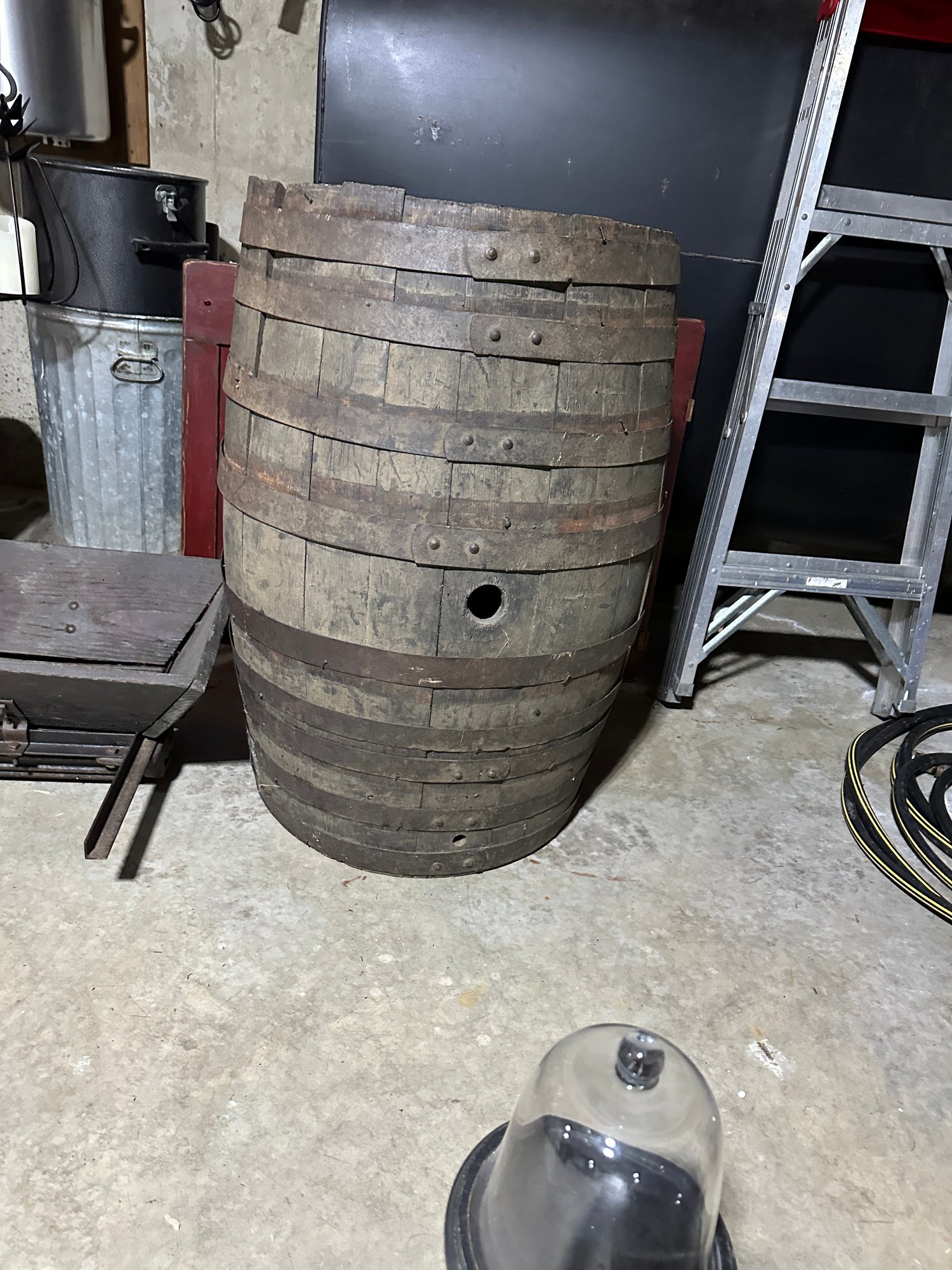 cider press has turn handle with Panasci Mfg. Co. stamped Barrel is 53"h and 21" wide at top