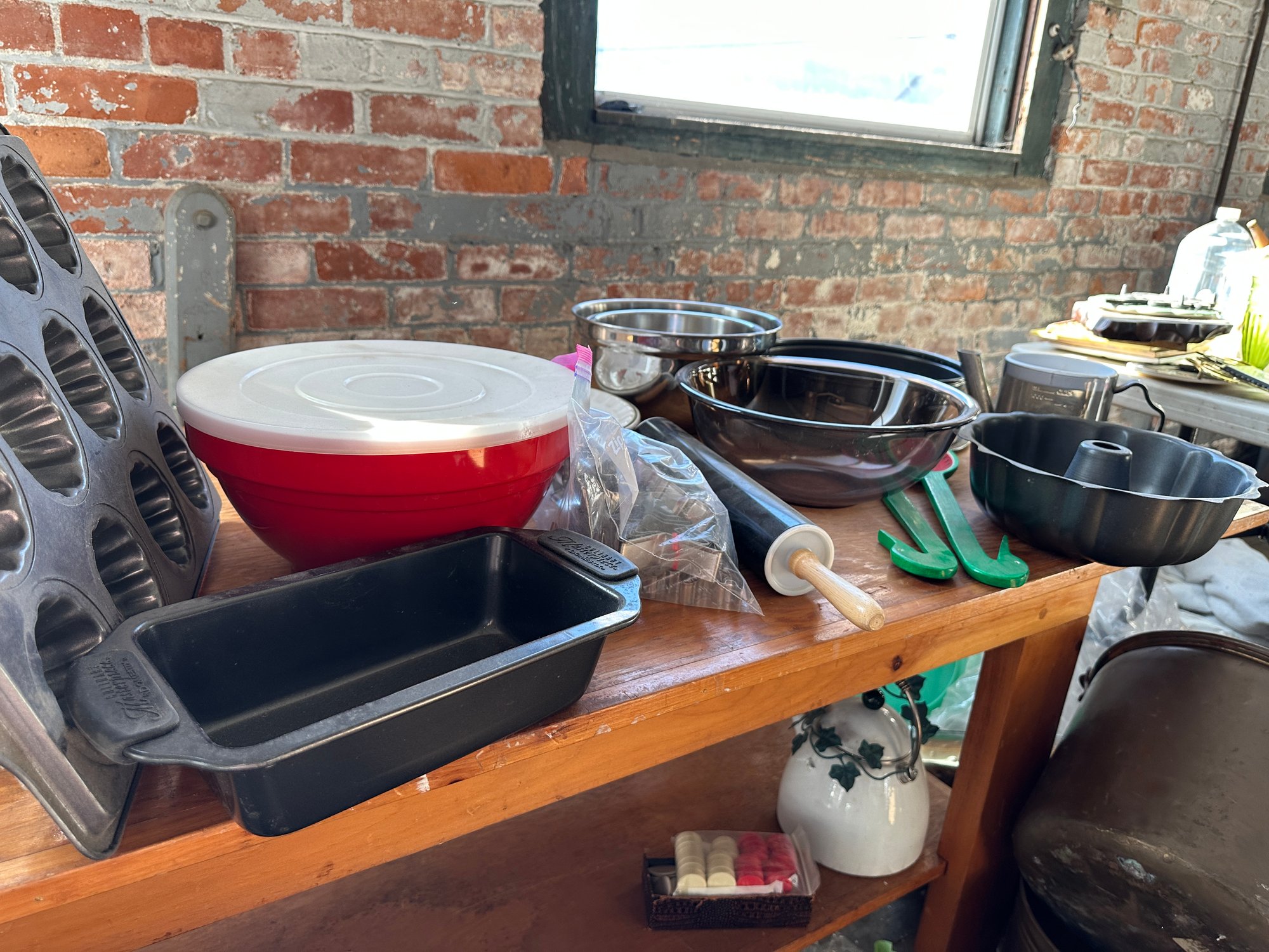 muffin tin, loaf pan, rolling pin, cookie cutters, mixing bowls, spring form pan, bundt pan and gravy separator, ceramic pie plate