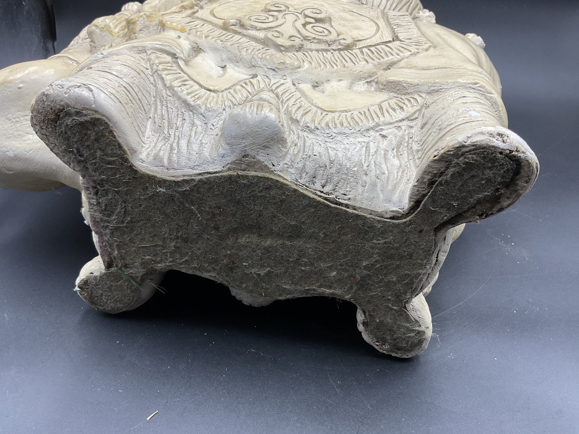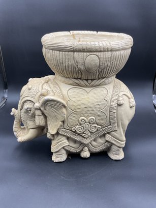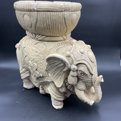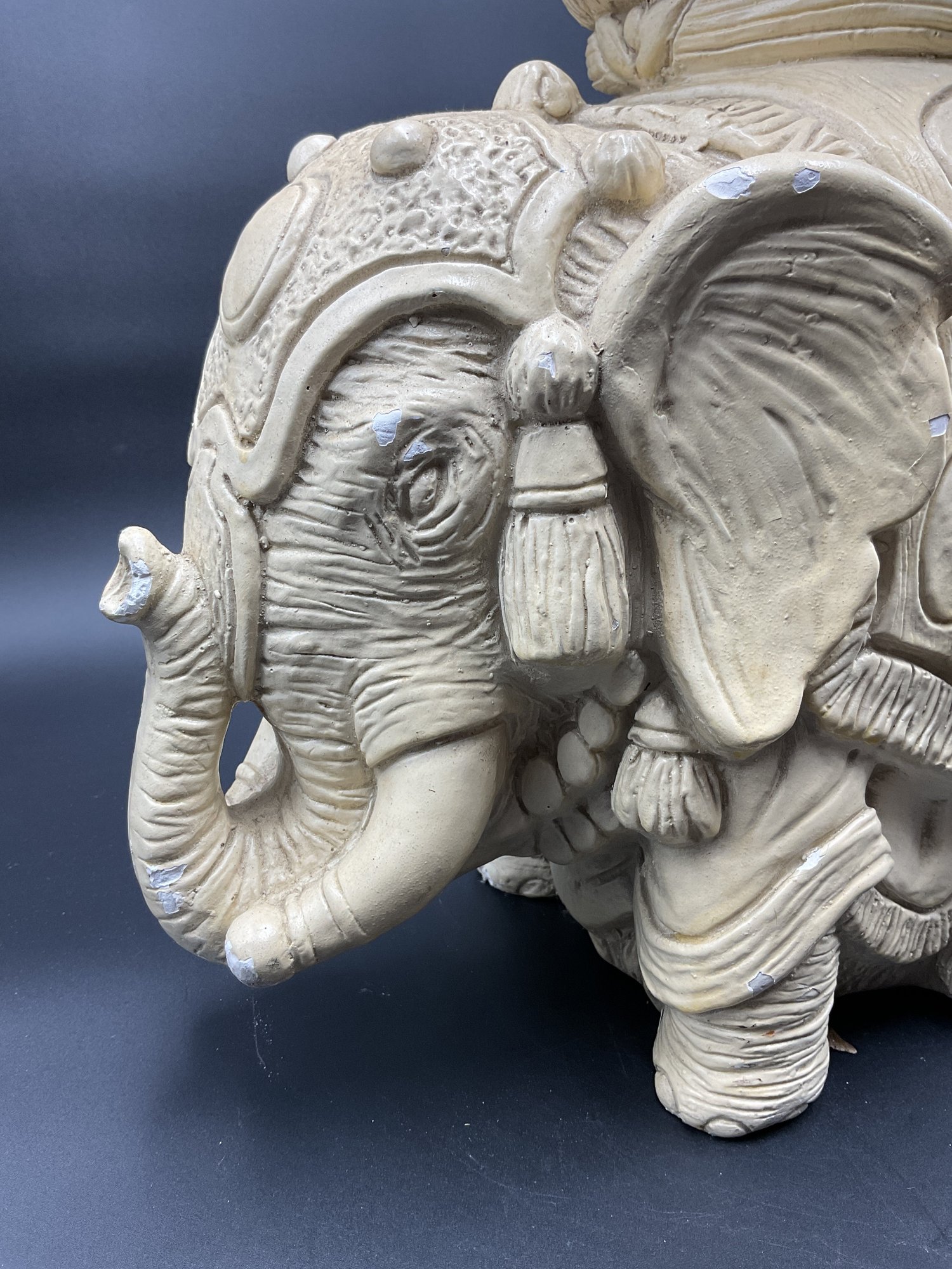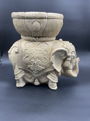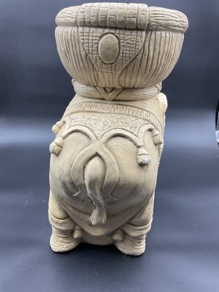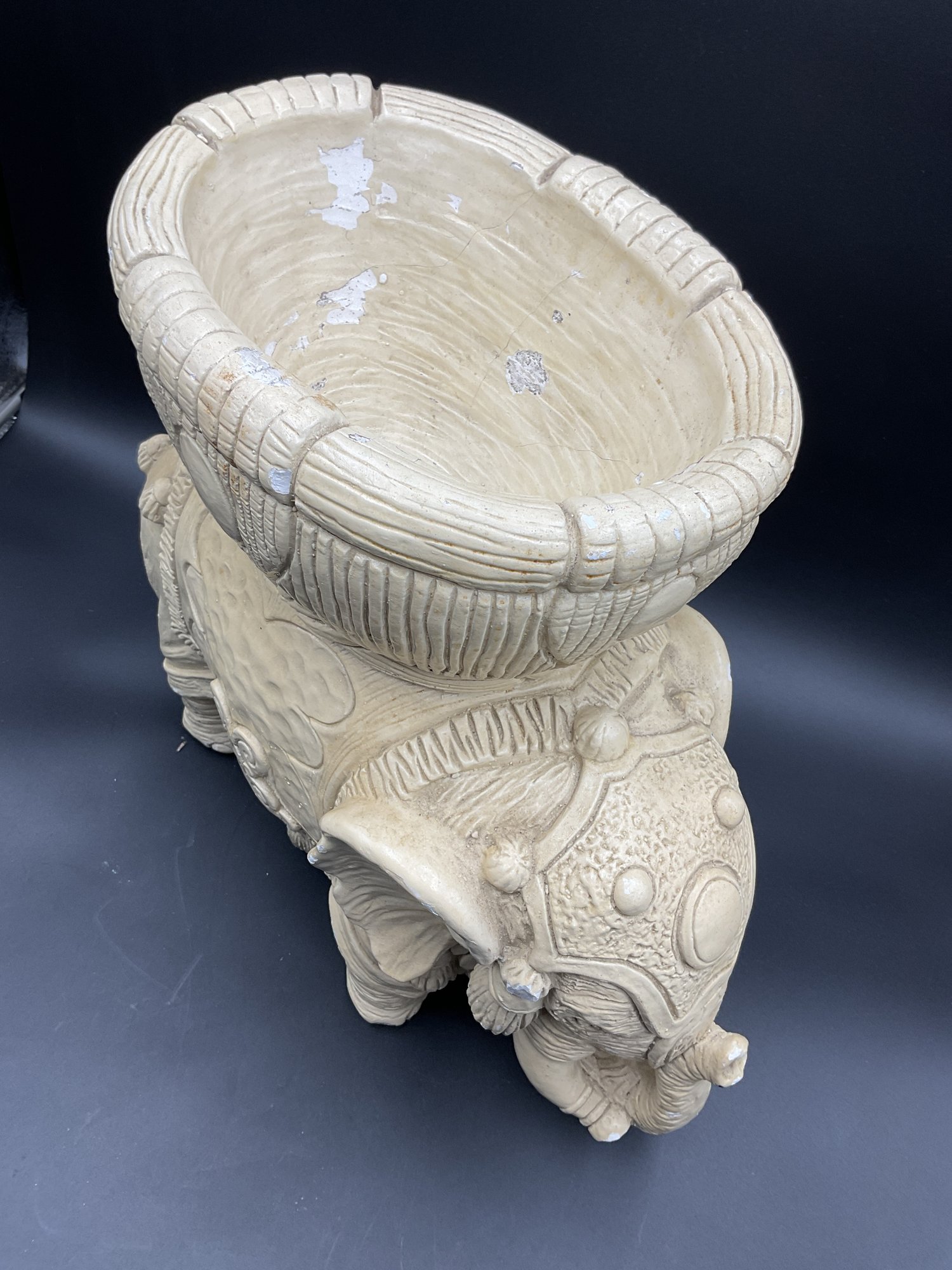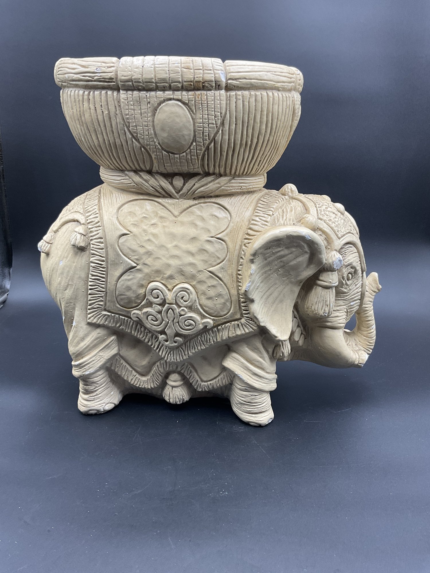 Amazing Indian style elephant planter in Plaster of Paris, for indoor use only. This has some chips to paint and one tusk has a chip to the end. See photos for details. Believed to be mid-century vintage, is in great condition for its age, and has a fantastic vibe. Very heavy!