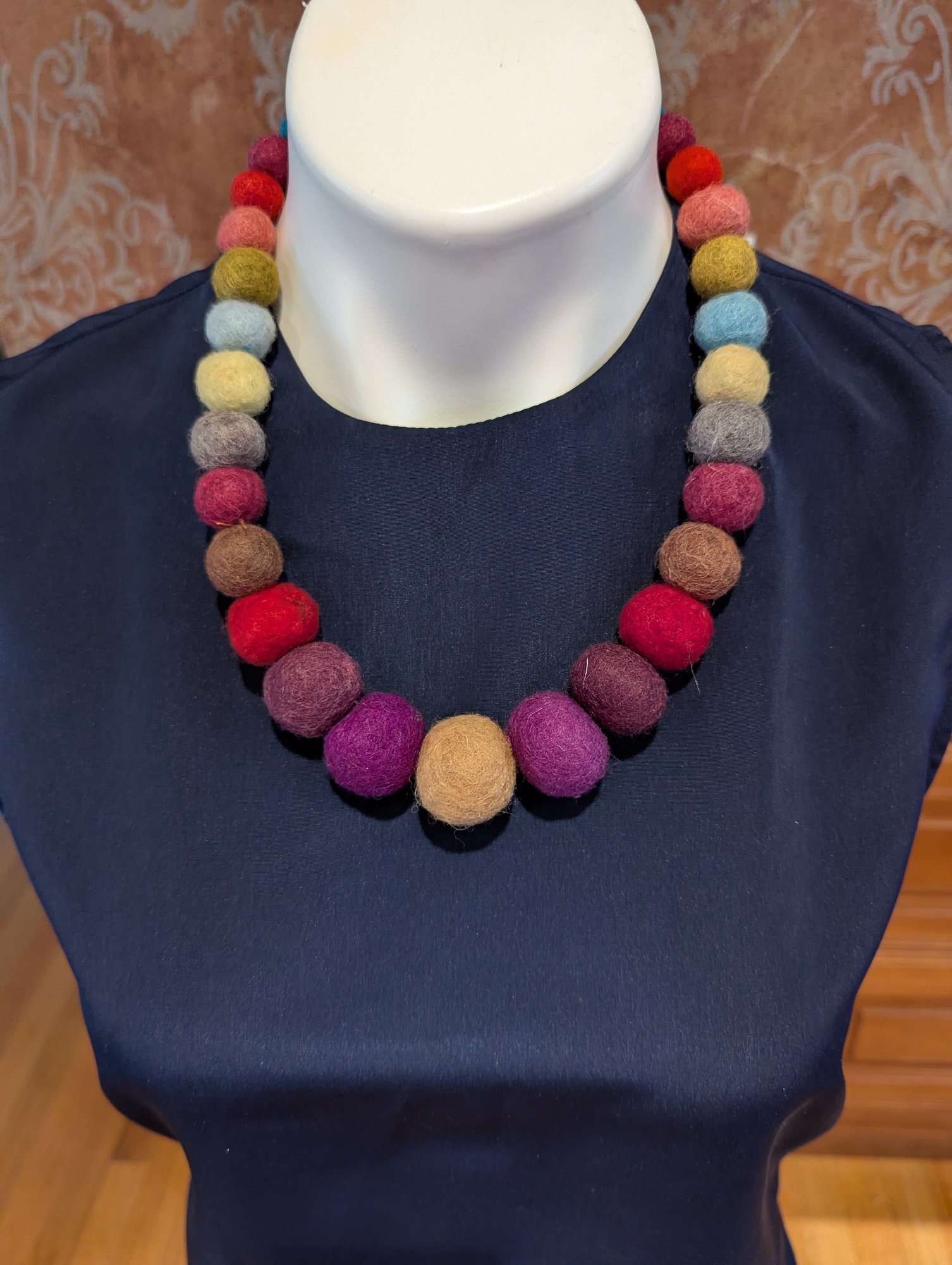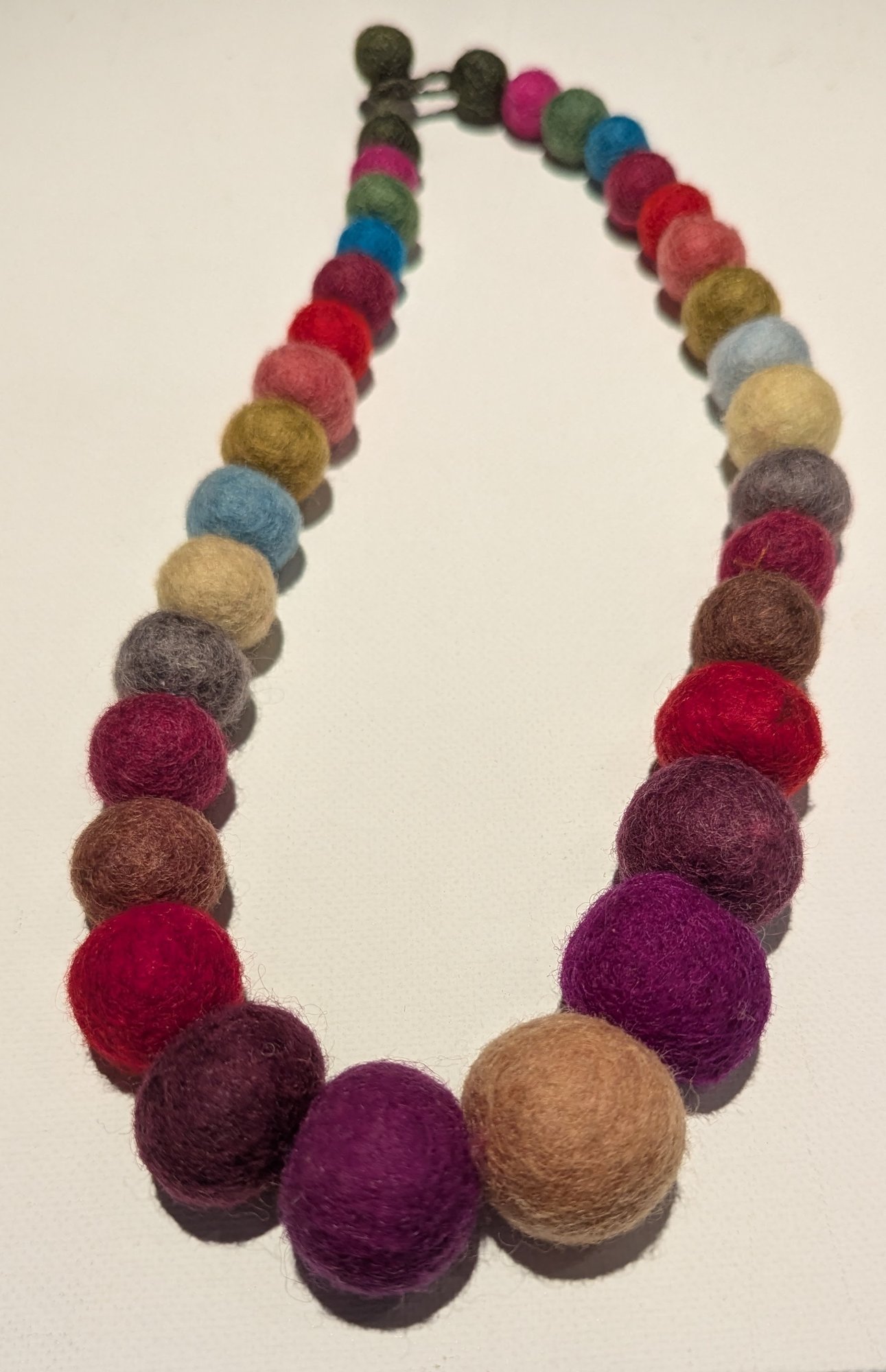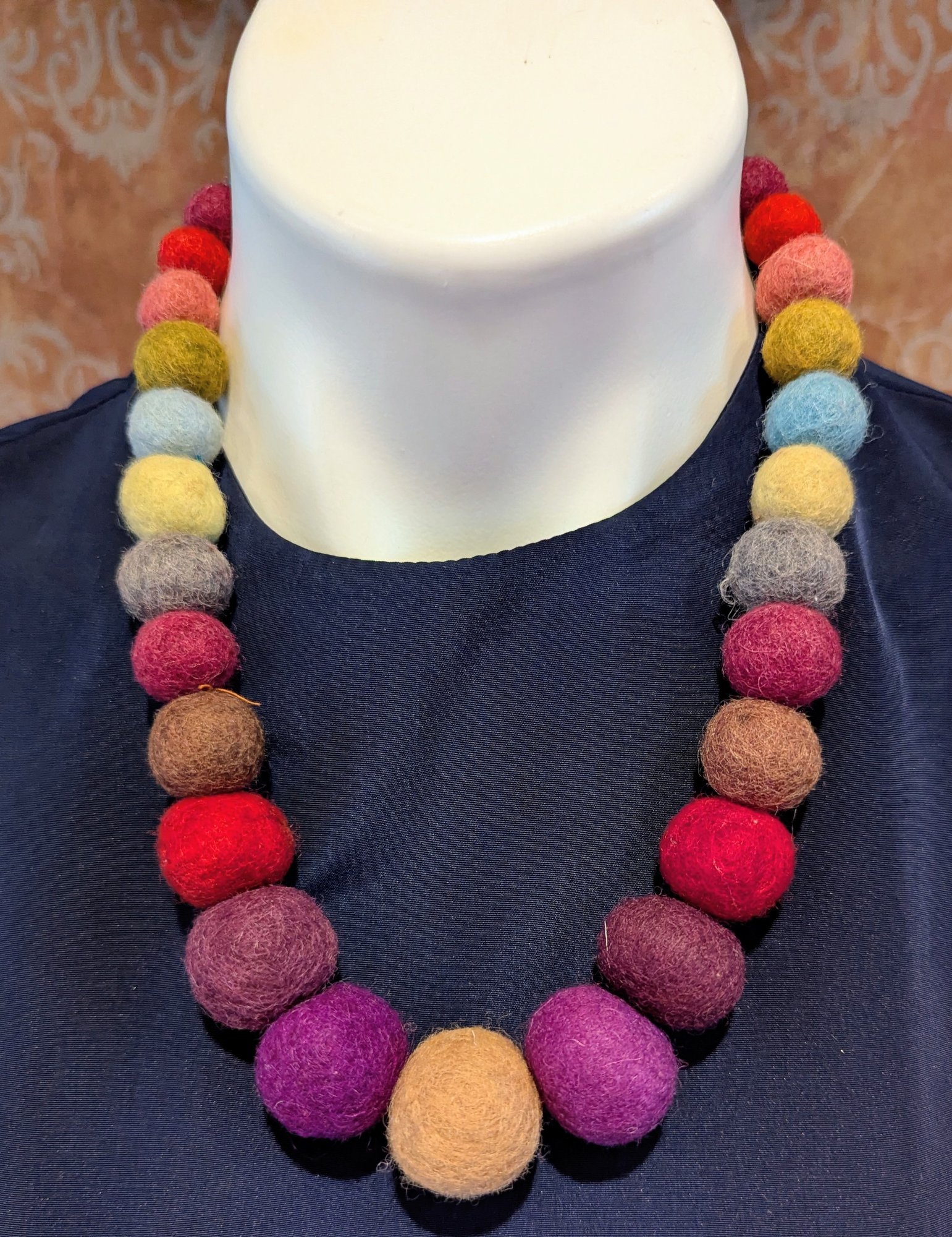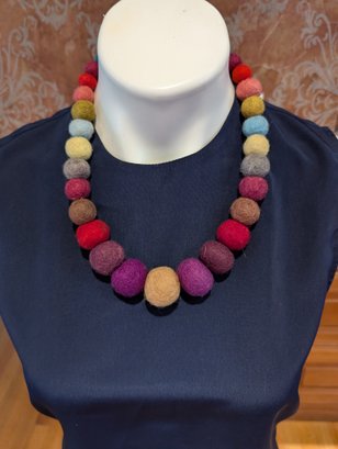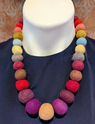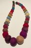 This is a vibrant and unique handcrafted necklace featuring a continuous strand of large, spherical felted wool beads. The beads are wet-felted from natural wool fibers, giving them a soft, textured, and lightweight feel.