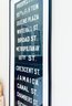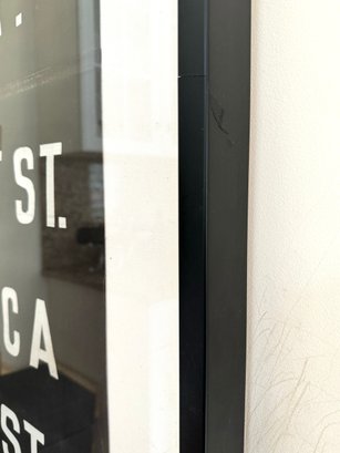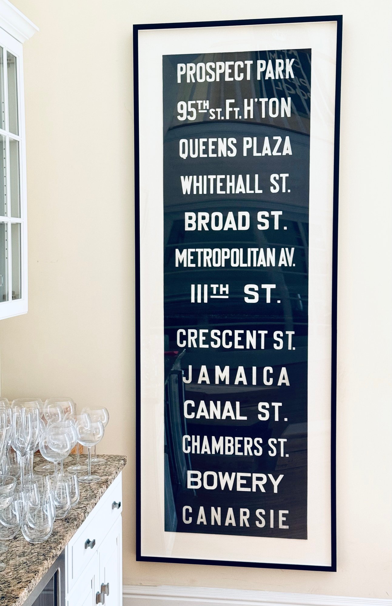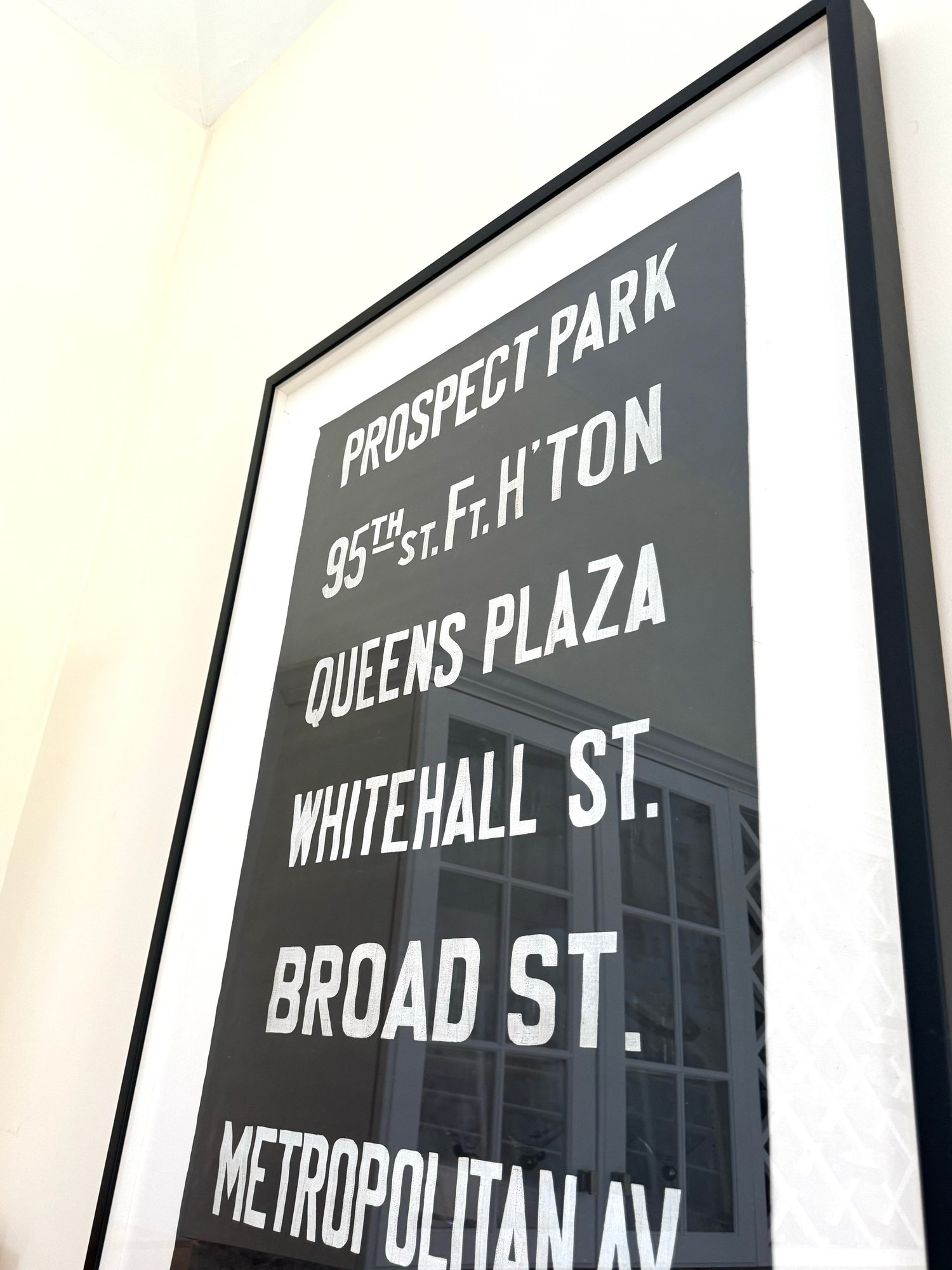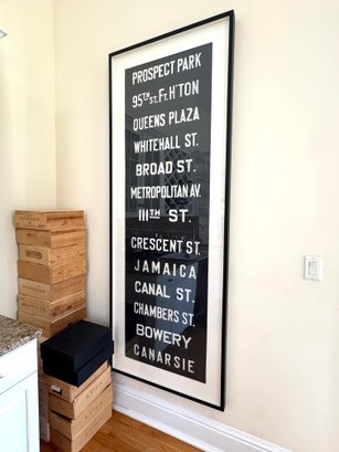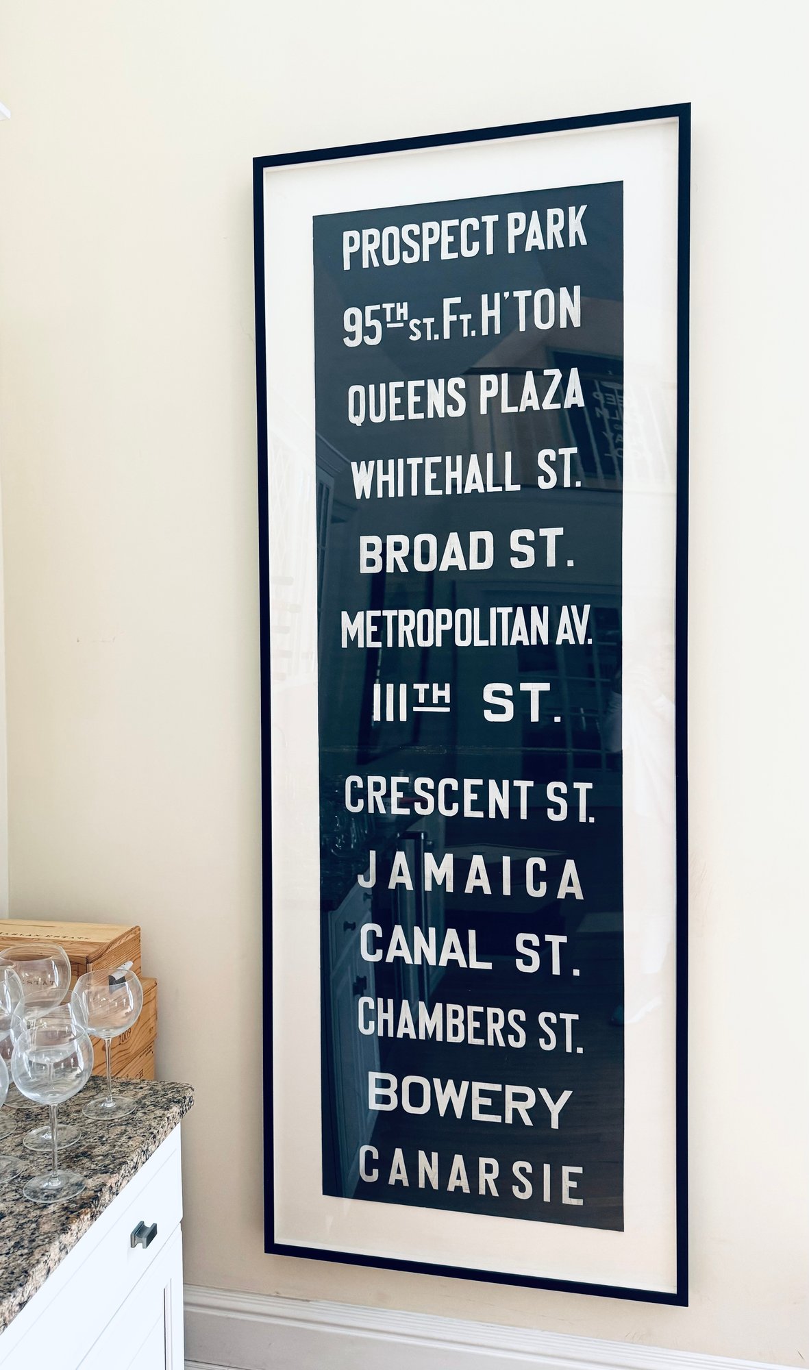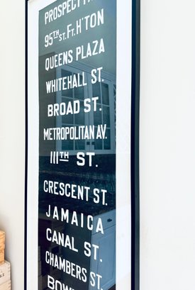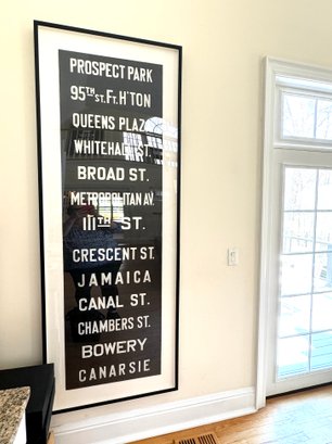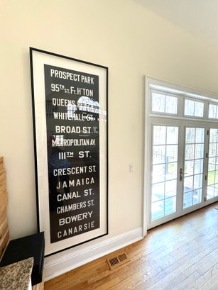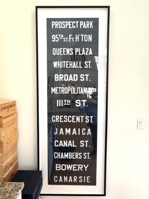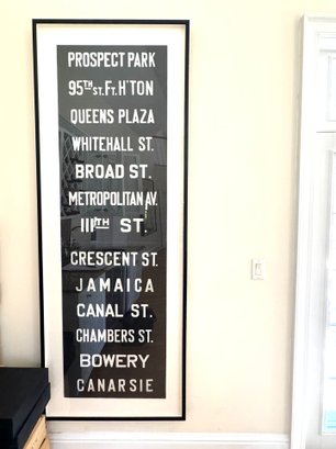 This very special C 1920's NYC 'Prospect Park/Canarsie NYC Destination Sign' memorabilia comes from the original subway rolls that appeared at each stop on the New York subways. This was placed at the top of the rolling signs on subway trains and trolleys. Printed on canvas and framed floating on a linen backing under glass. They have become rare to find as one piece which makes it even more special. Condition overall in frame is very good with minor frame wear. Size 88.5 H x 33 W x 2