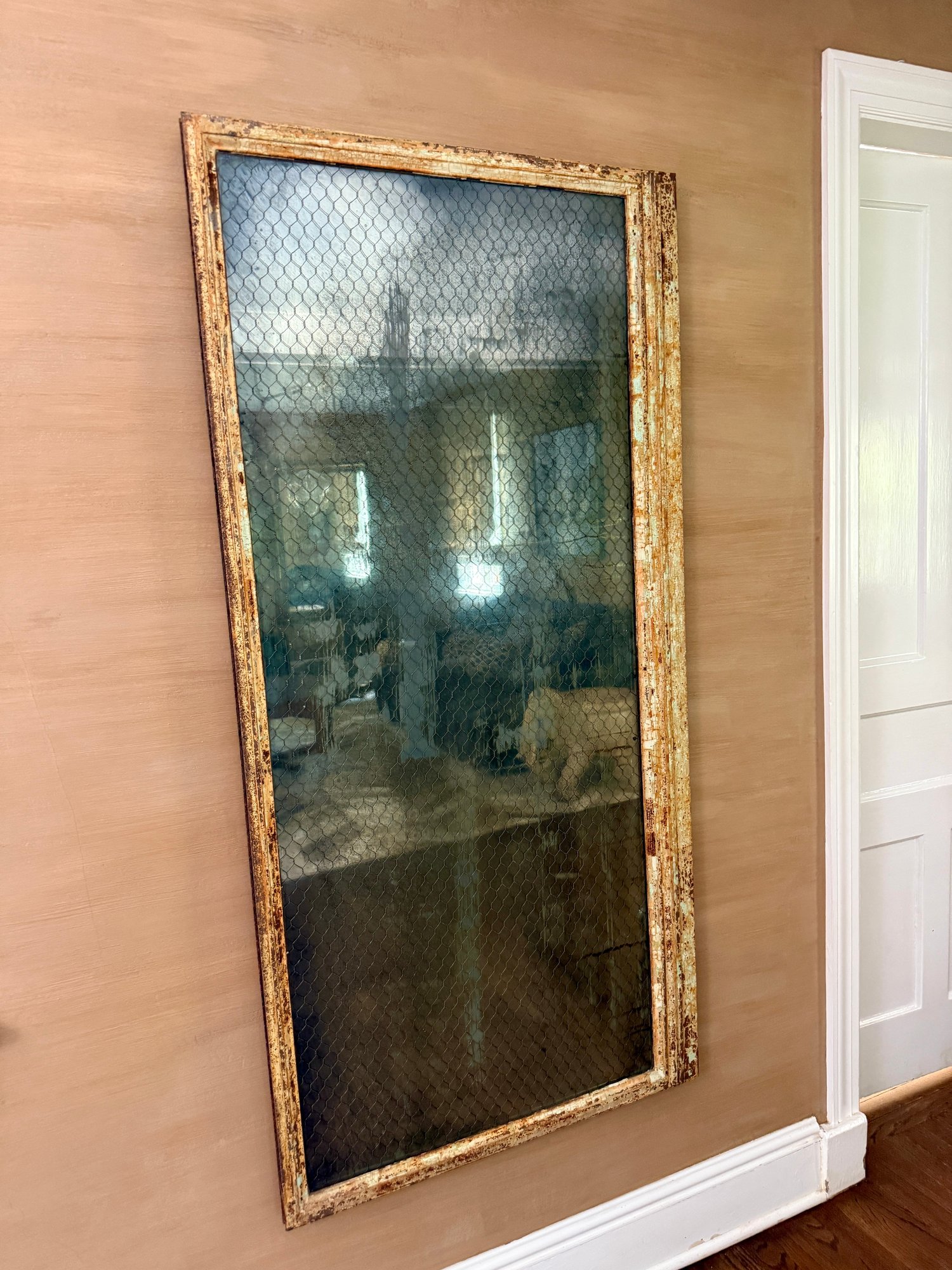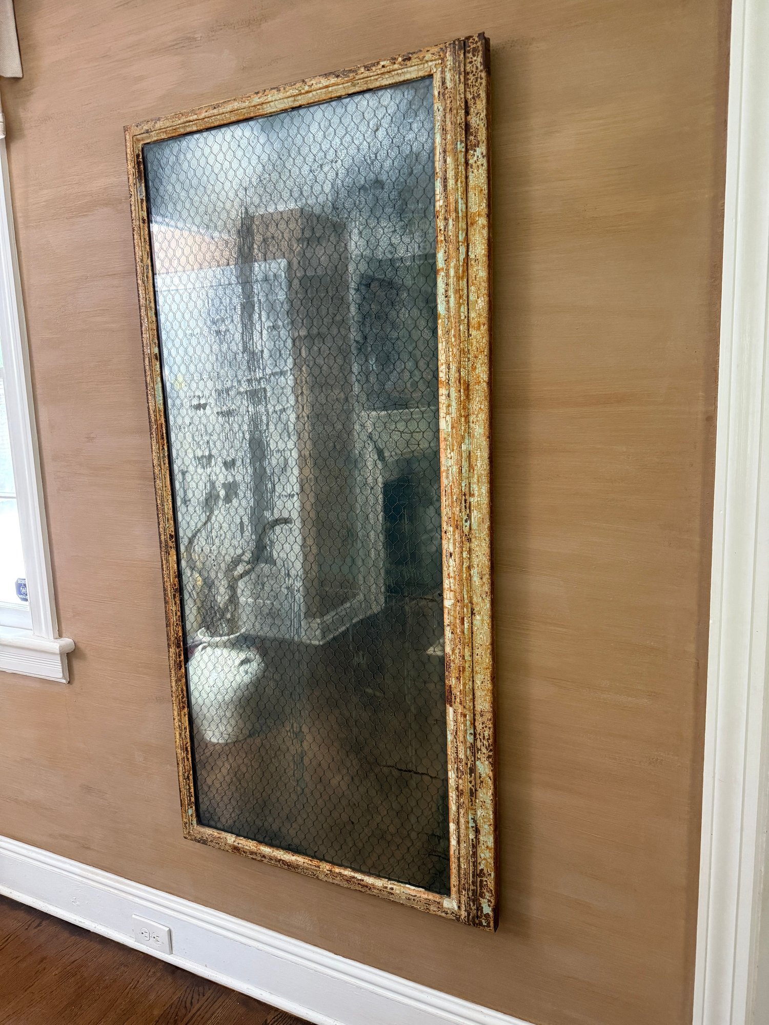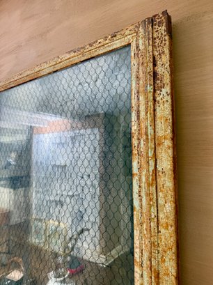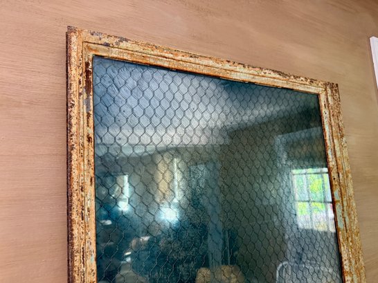 Chicken wire over mirrored glass. Metal frame. Heavy.