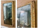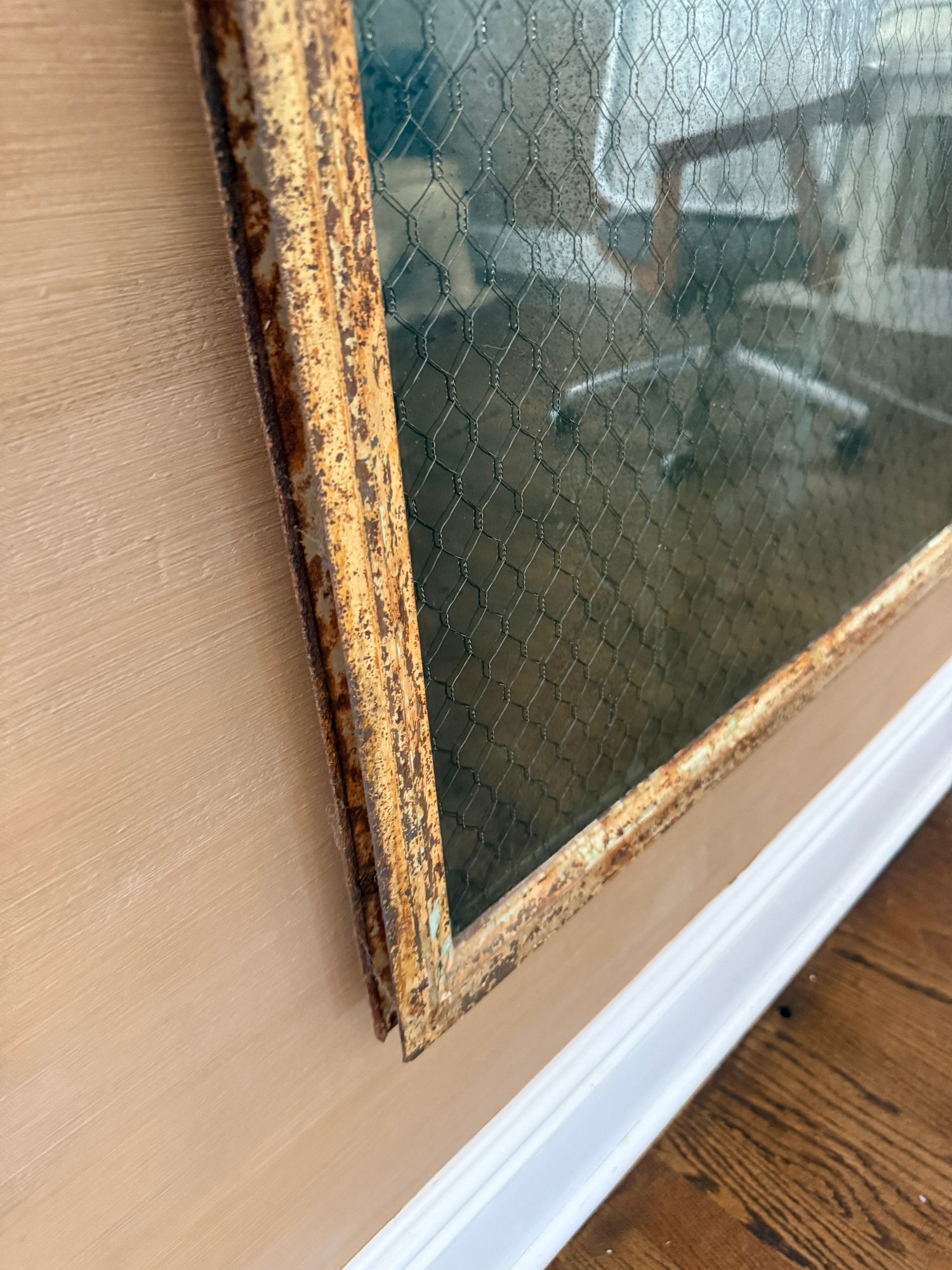 Chicken wire over mirrored glass. Metal frame. Heavy.