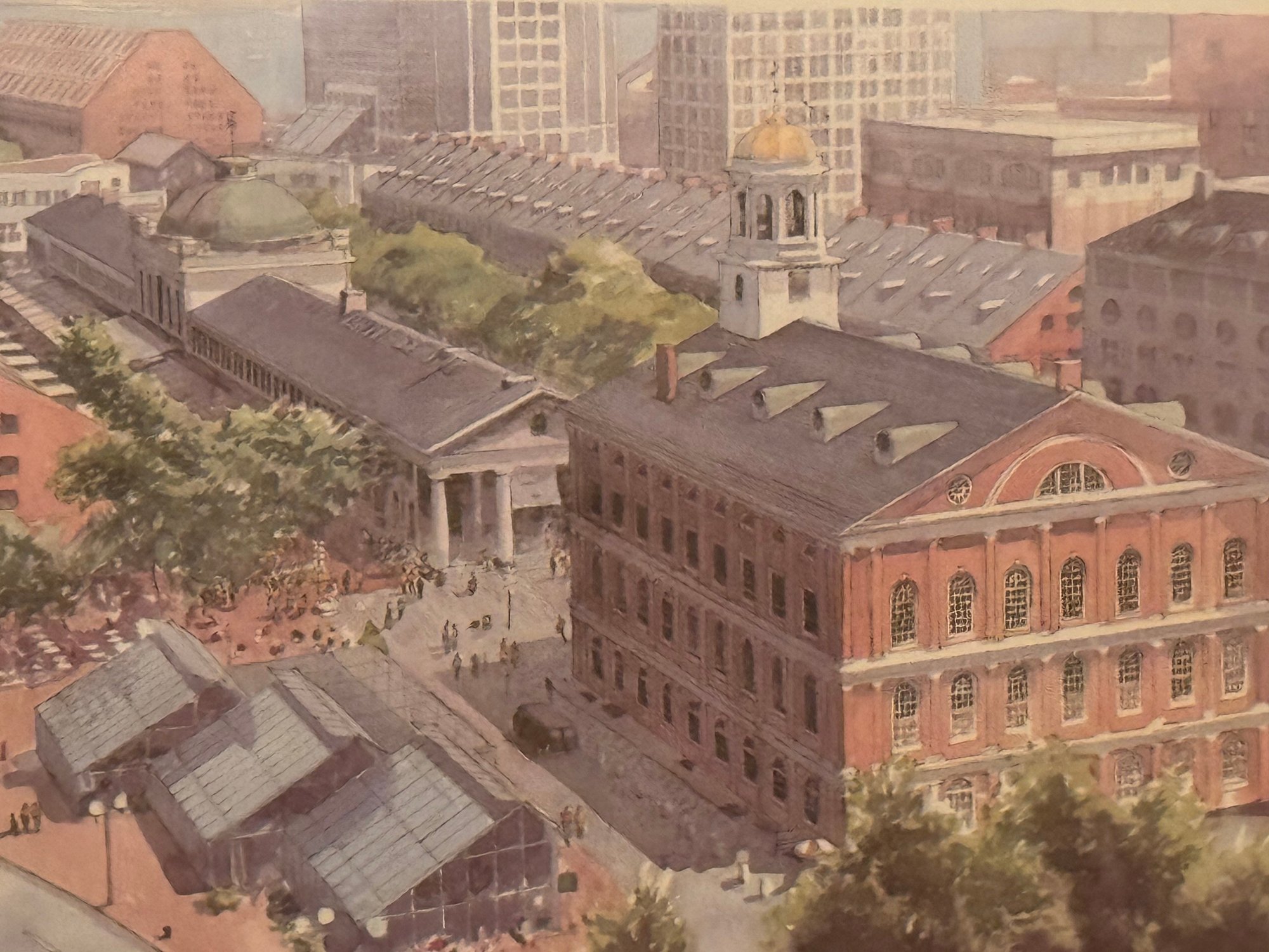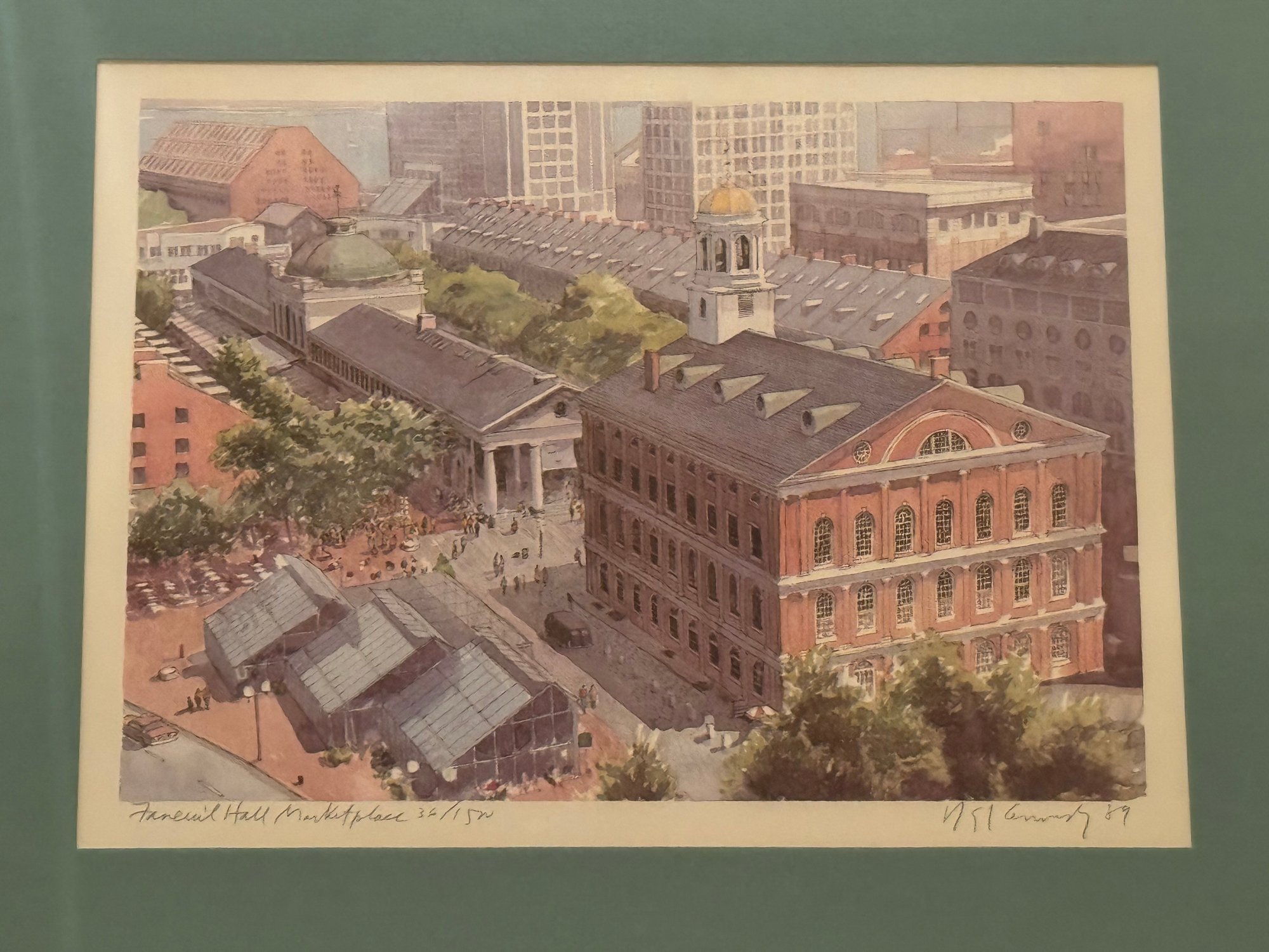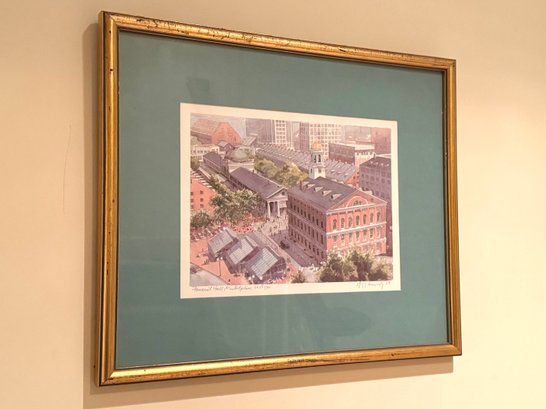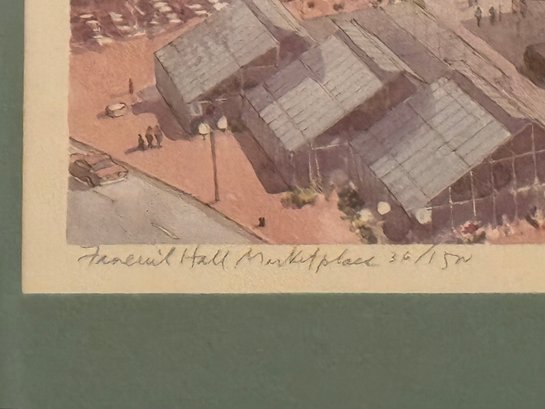 This image is a print of Faneuil Hall Marketplace in Boston, Massachusetts. The print is titled "Faneuil Hall Market Place" and is a pencil-signed print by Robert E. Kennedy.