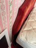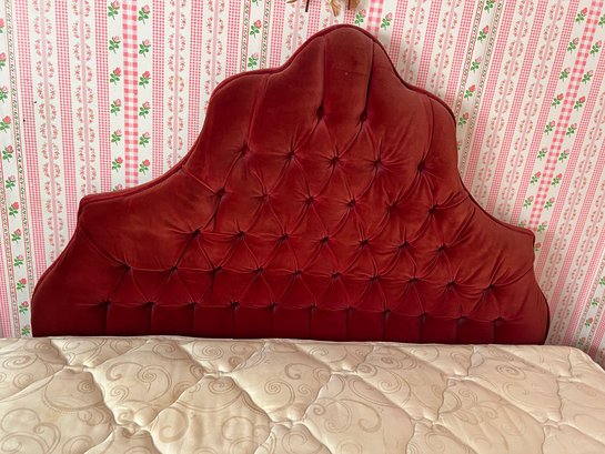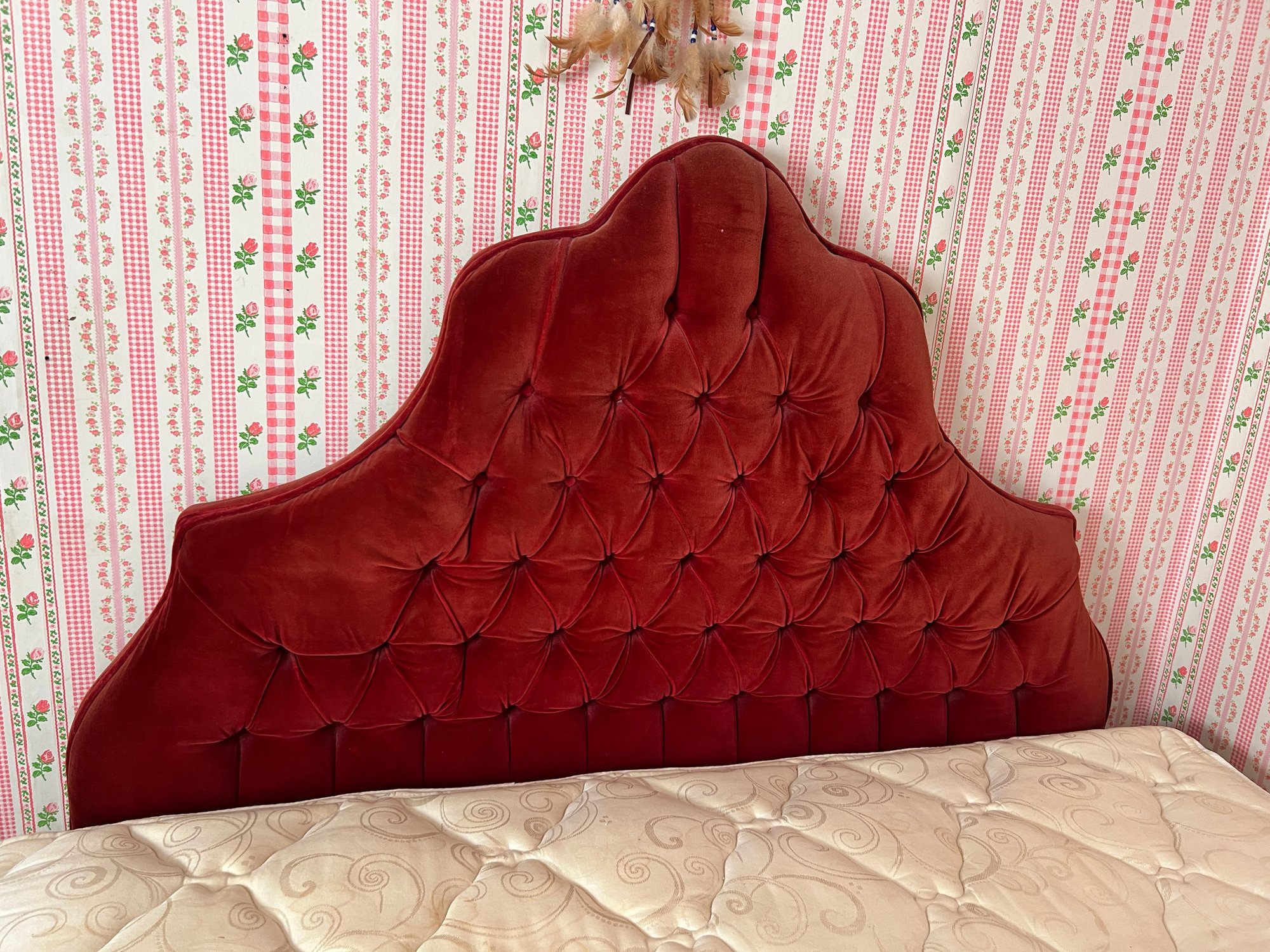 Moroccan inspired 1970s red velveteen tufted headboard for a full-size bed. It is shown on a queen size bed which also works. This listing is just for the headboard - not a frame. It simply sits on the wall behind the bed.