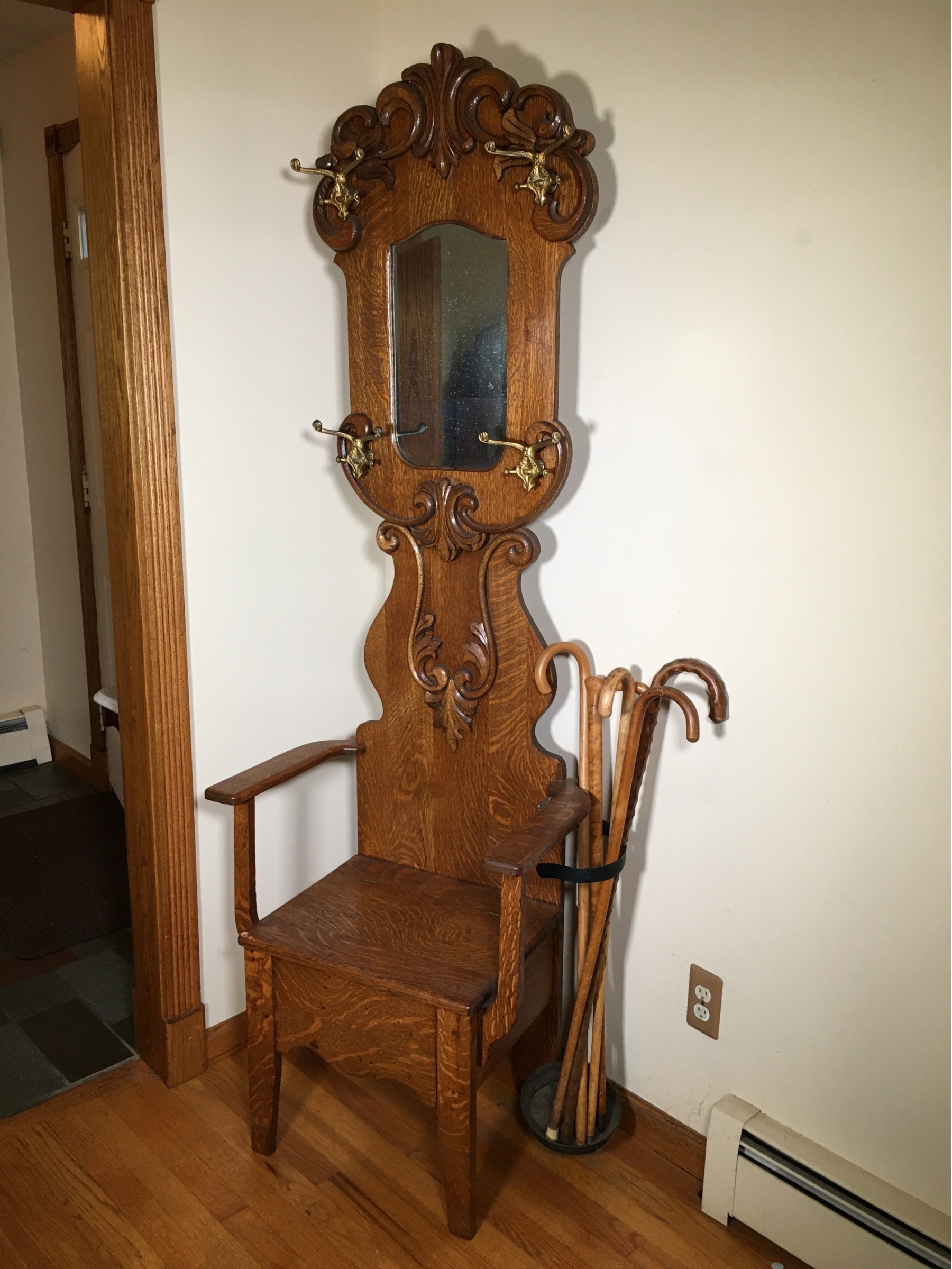 79" x 28-1/2" x 16" . . .BOUGHT AT ANTIQUE SHOW IN MILFORD FOR $975 IN THE 1990'S . . . . . COMES WITH SOME ANTIQUE CANES / WALKING STICKS. . . .TALL PIECE . . . OVER SIX AND A HALF FEET TALL . . .NICE HOOKS. . .NICE FINISH .THE WHOLE THING IS GREAT . . . . . .AMAZING COLOR AND DETAILS . . . . . . . .another great sale . . .lots of interesting items . . . .lots of antique Victorian oak furniture, tools, camping items, artwork, housewares, electronics . . .plus a 2004 Mini Cooper S & a 2009 Yamaha CS Scooter (sold as their own auctions) . . .something for everyone. . . .YOU SHOULD NOT MISS THIS SALE. . . .Thank You