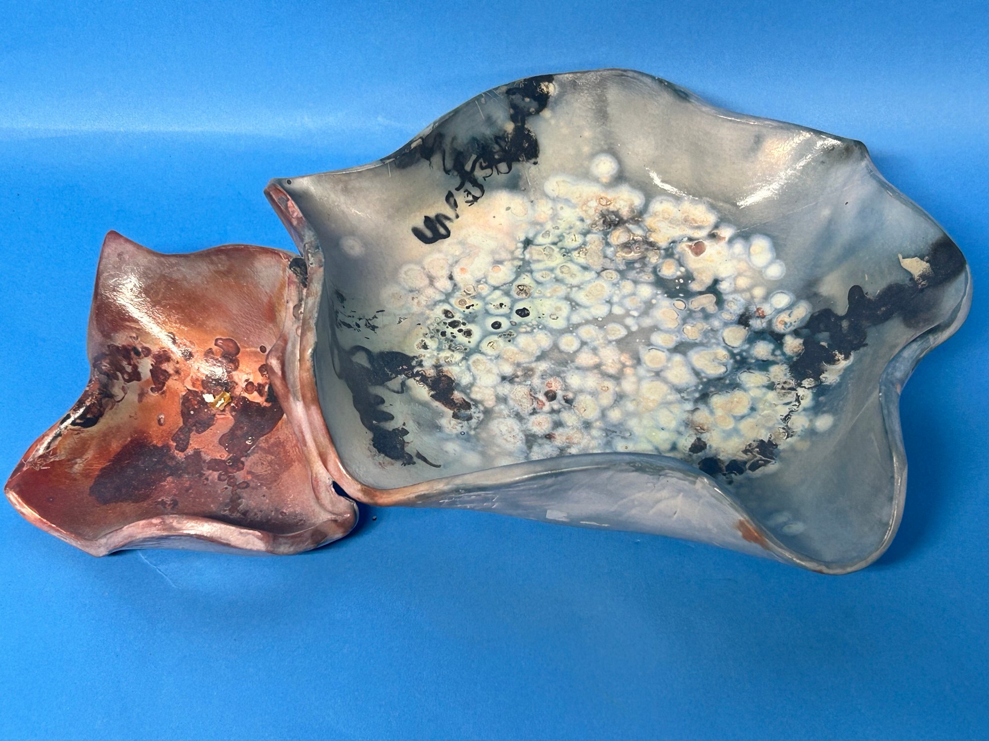 Beautiful two sectional interpretation. Spotted orange & white matte glazing finish..