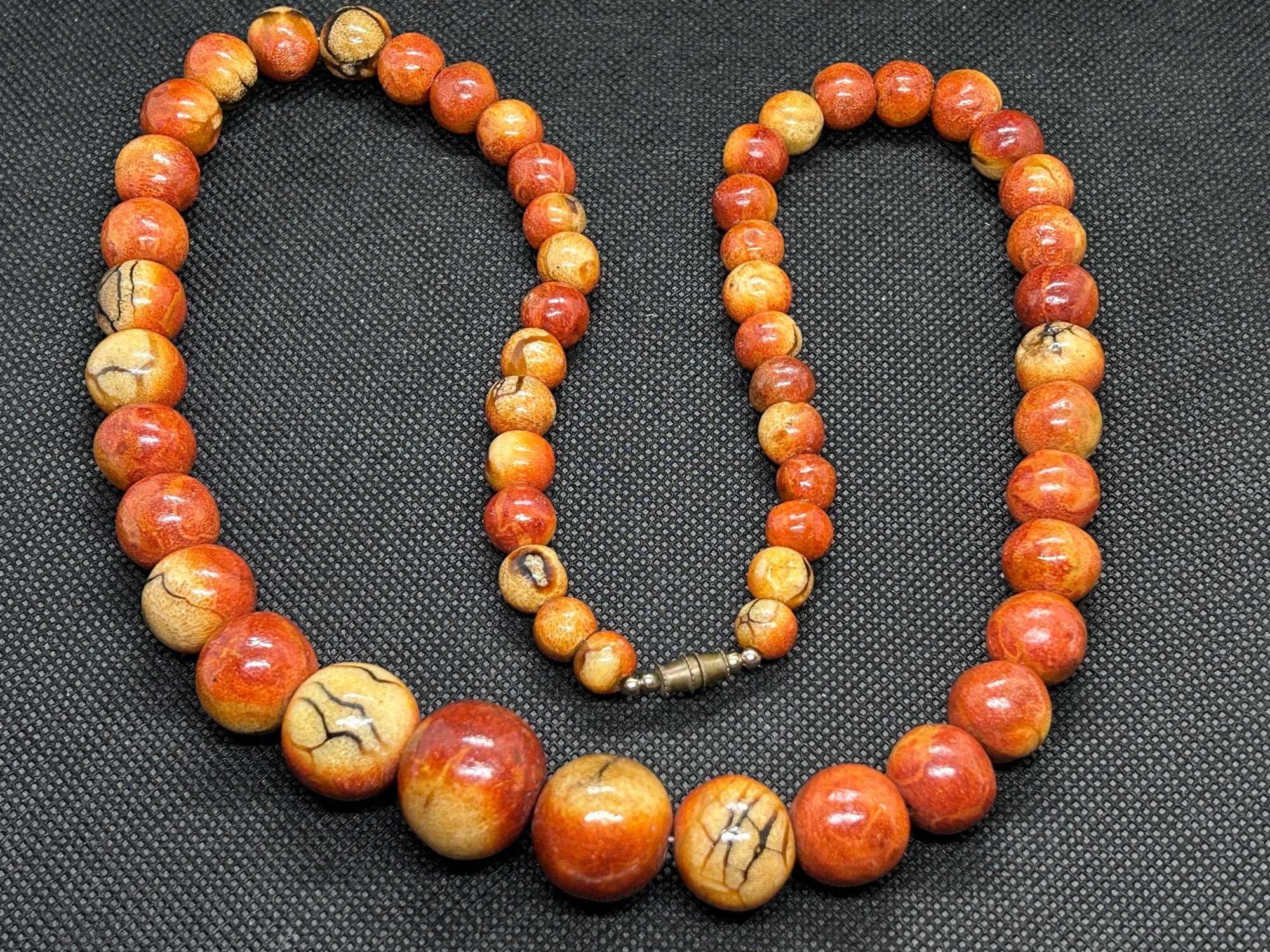 A rarely seen material makes this large vintage runway necklace really pop . . .natural APPLE SPONGE CORAL beads in graduating scale. Highly collectible, in very good condition.