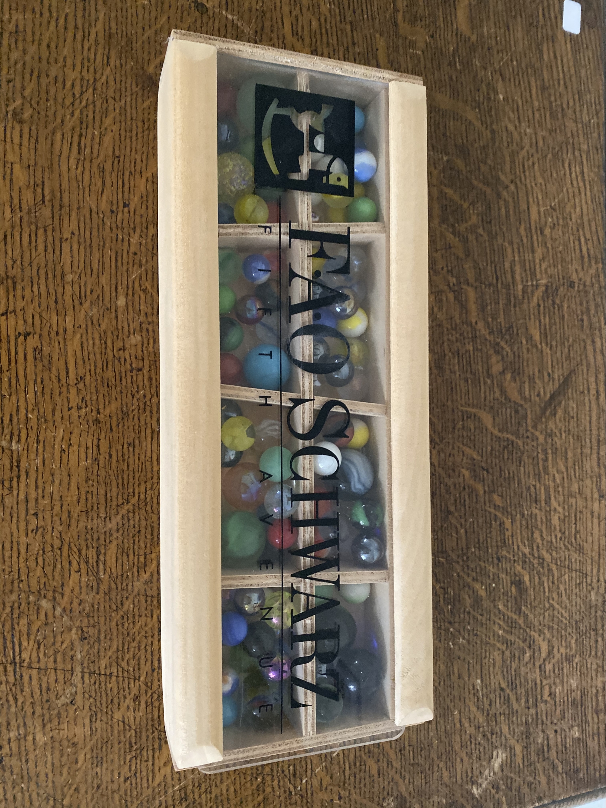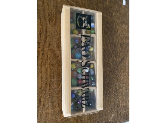 Set of marbles in wooden compartmentalized box with clear sliding top. From FAO Schwartz.