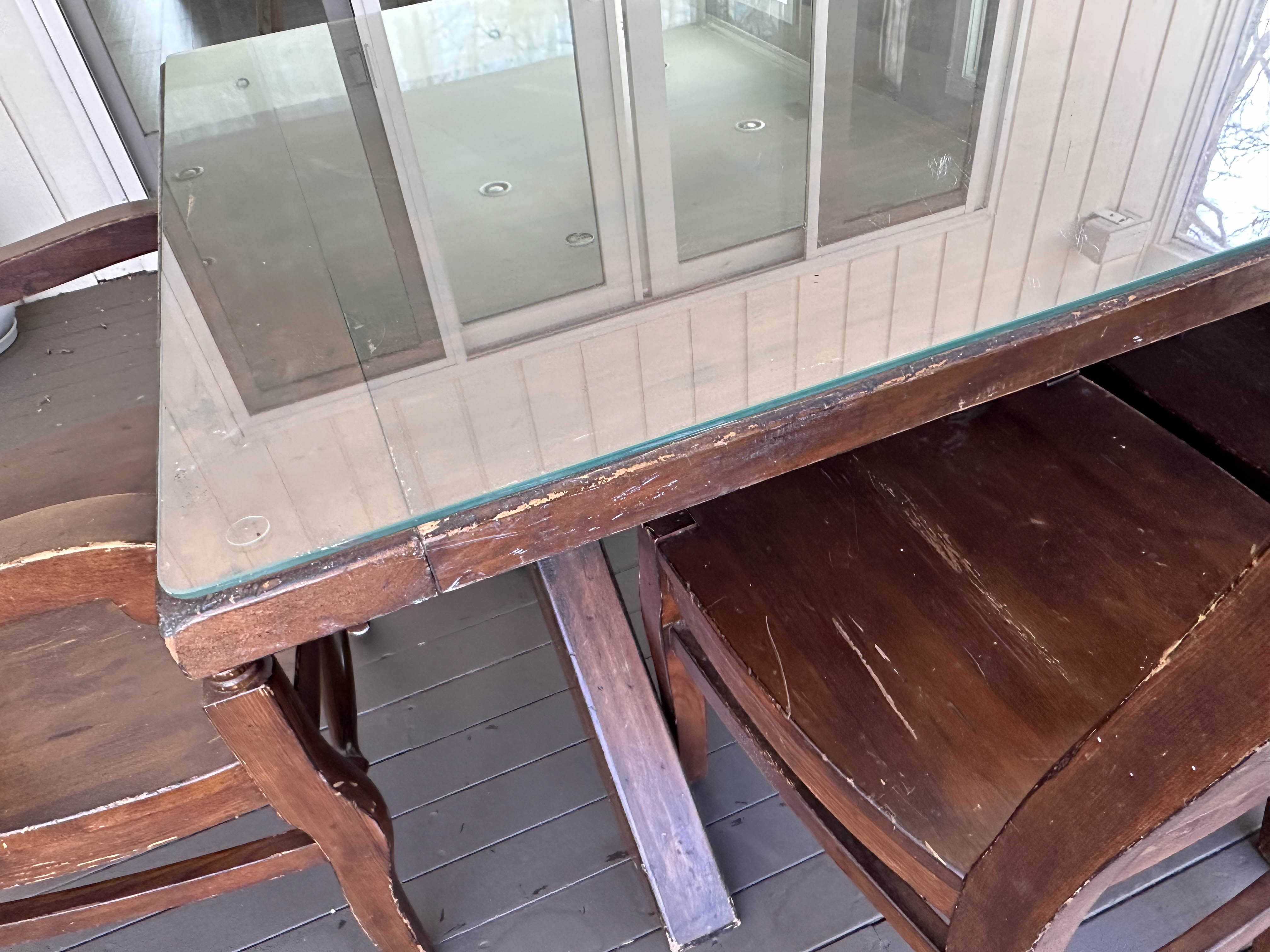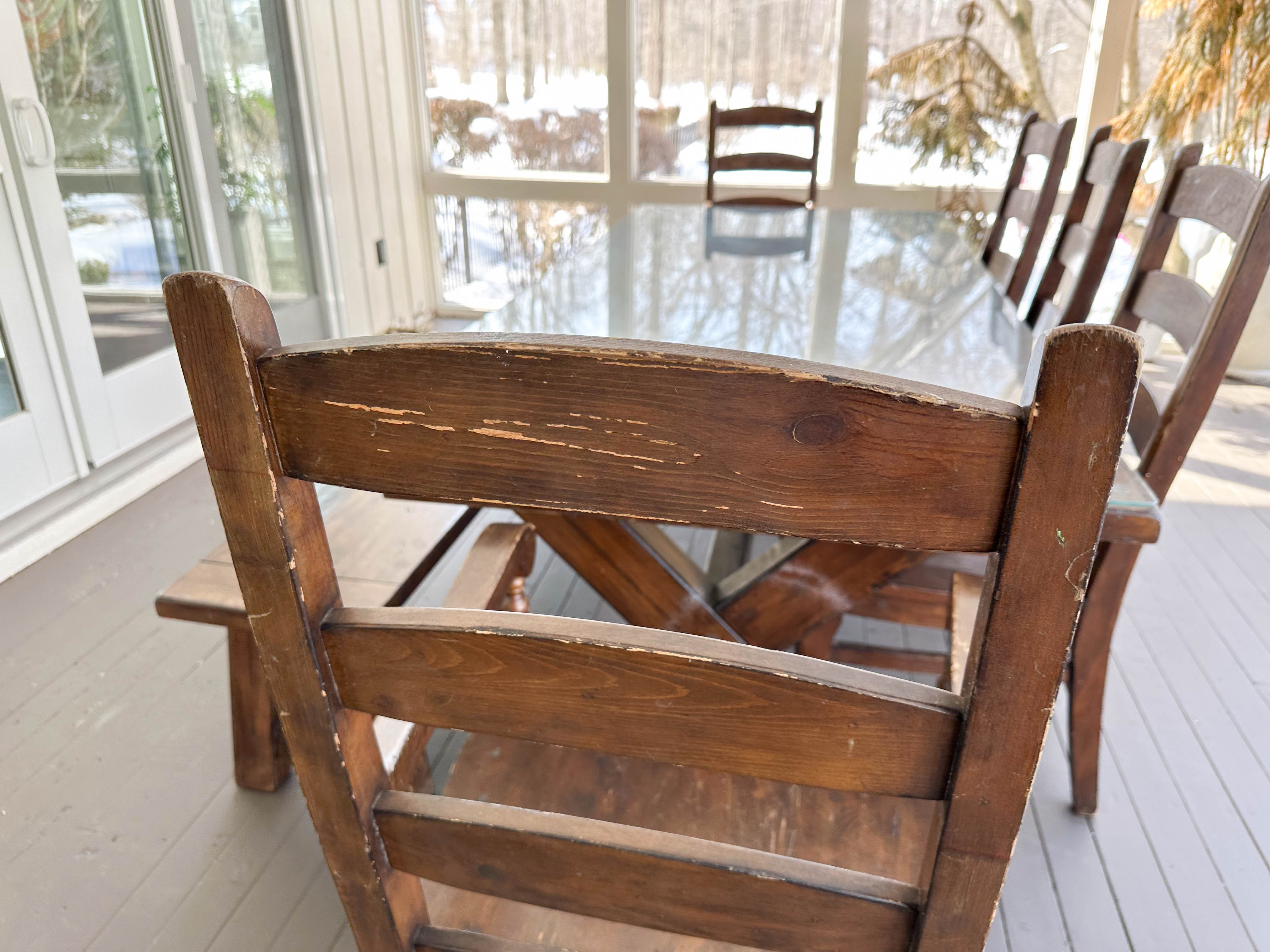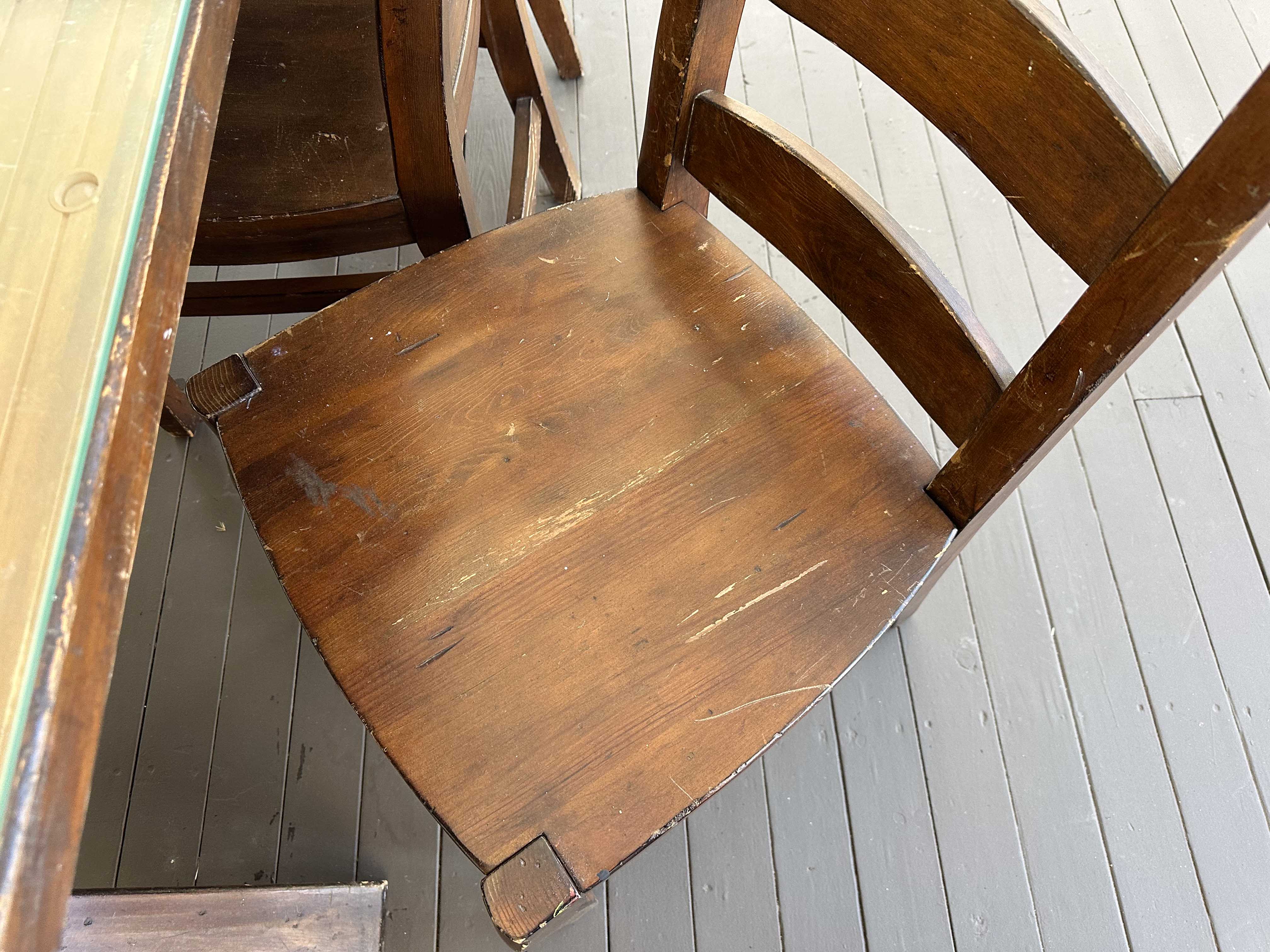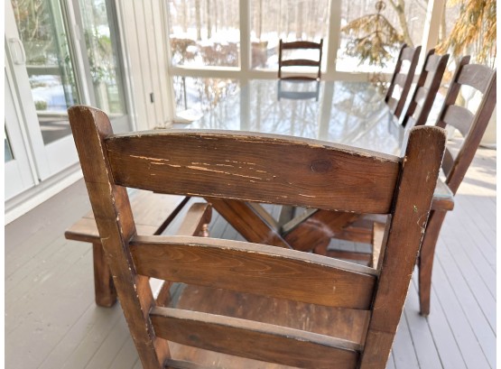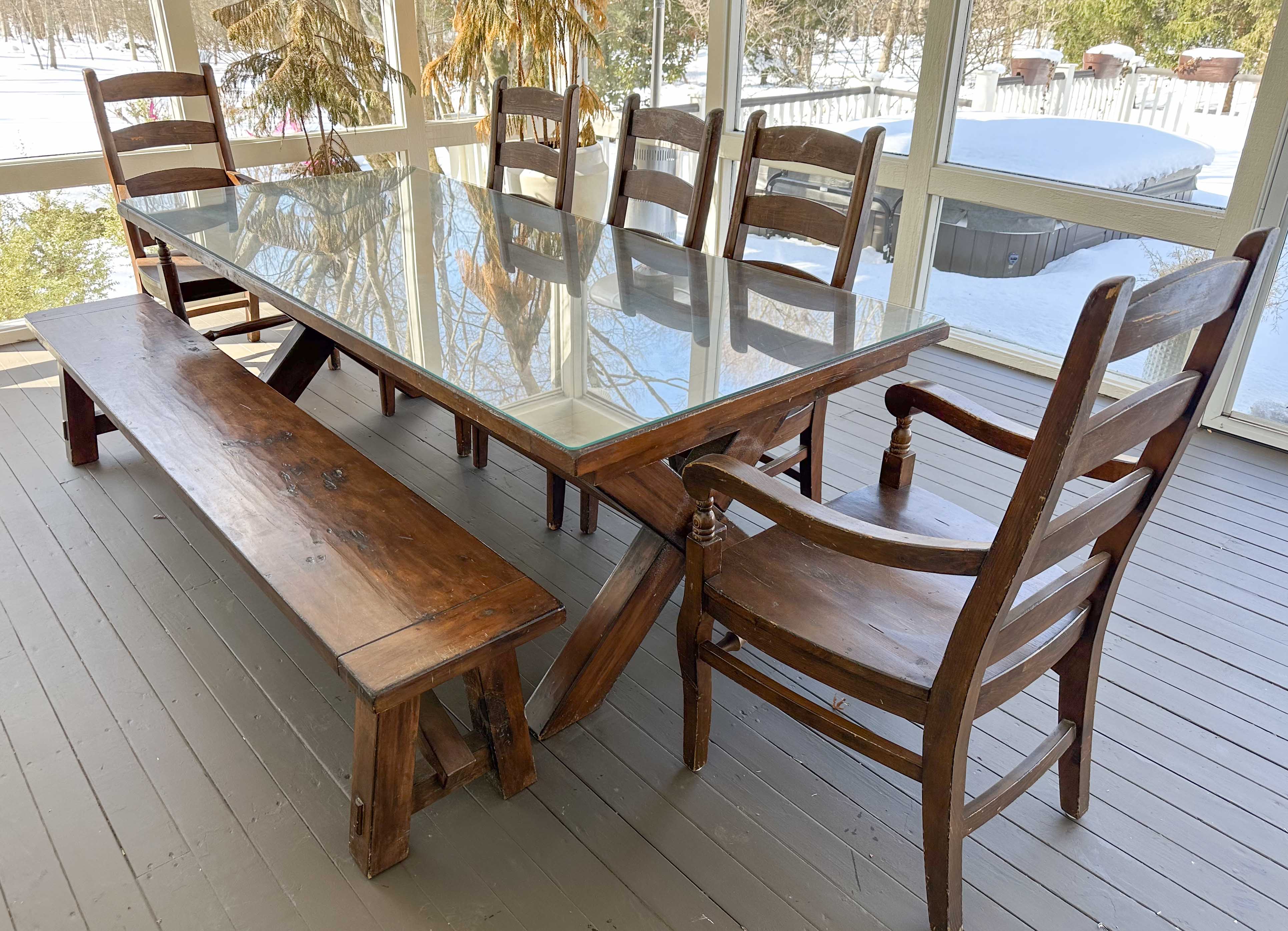 There is some overall wear to all of the pieces. The table top has been protected with a piece of glass. Table: 88” l x 40” w x 30 1/2” h, bench: 88 1/2” l x 14” w x 18 1/2” h, end chairs: 24” w x 22” d x 44” h, side chairs: 19 1/2” w x 21” d x 44” h
