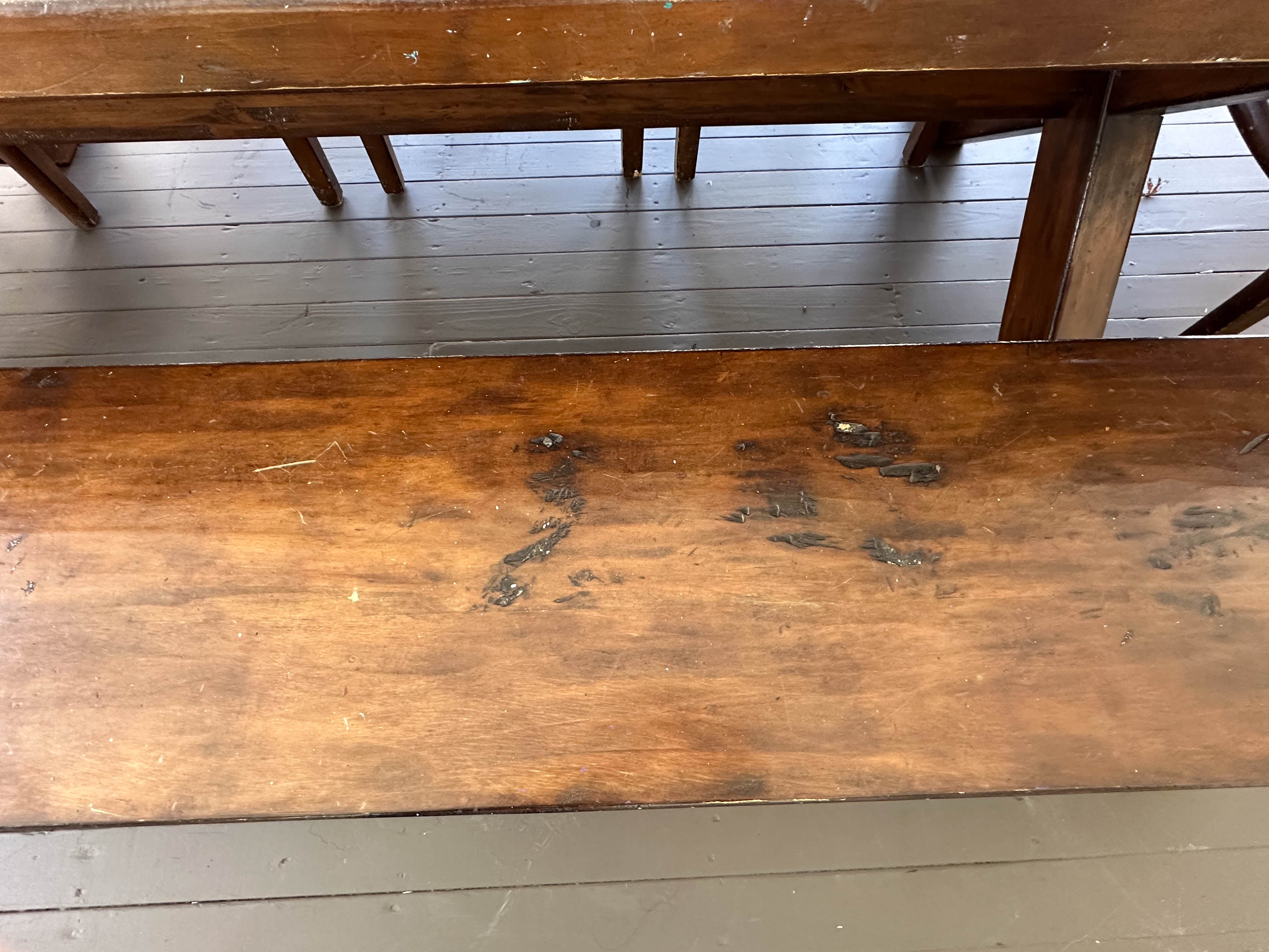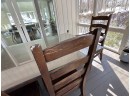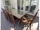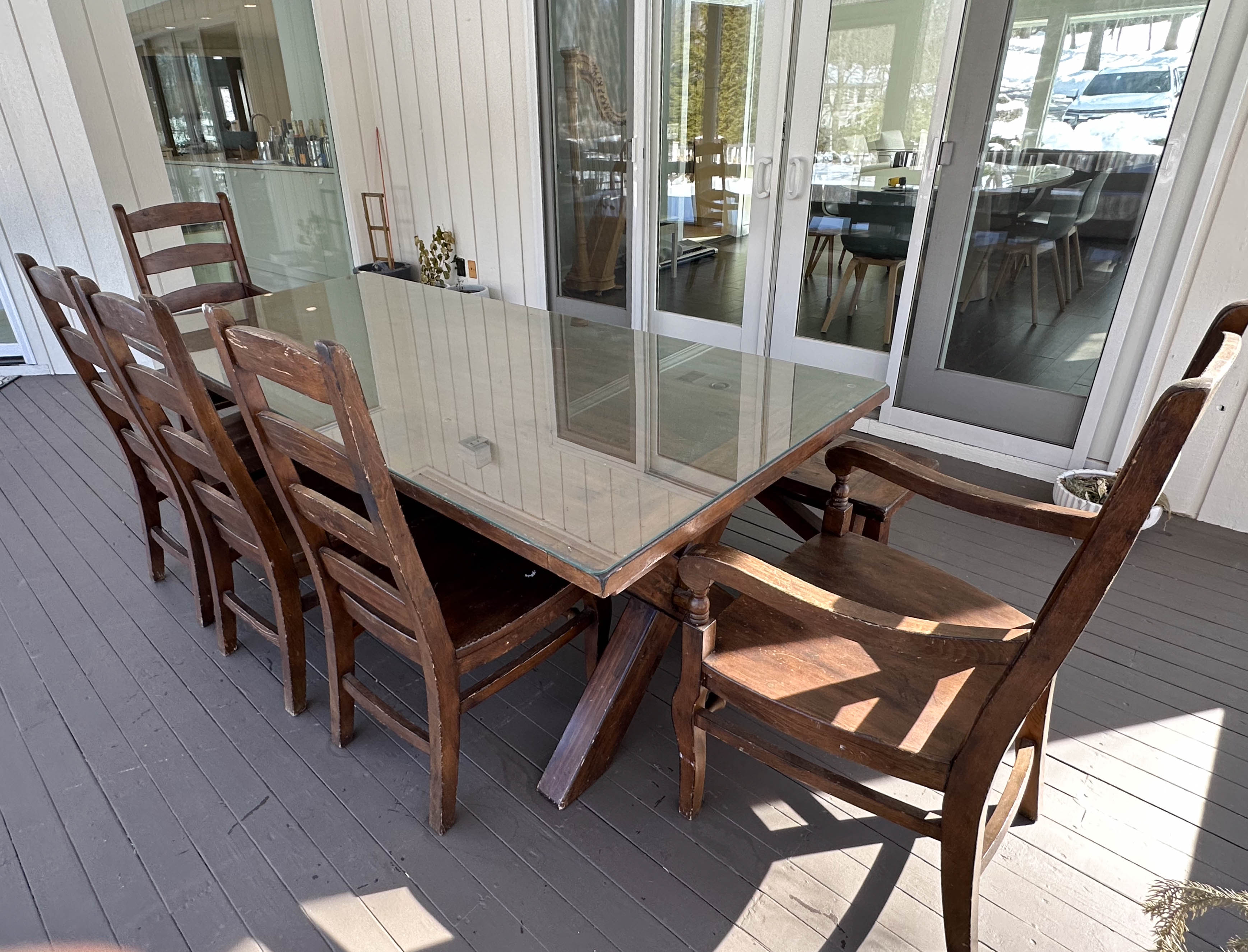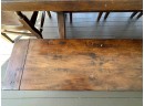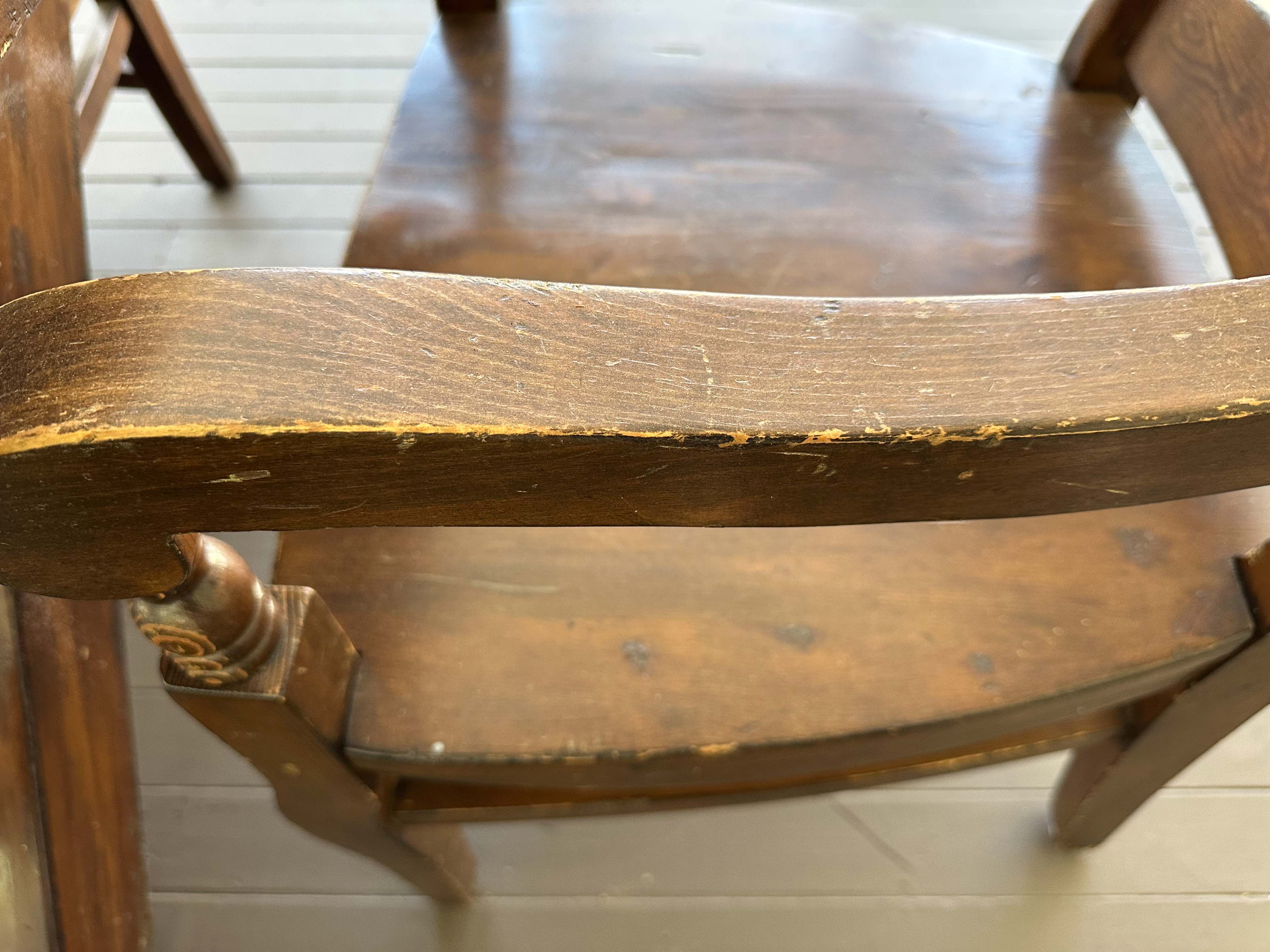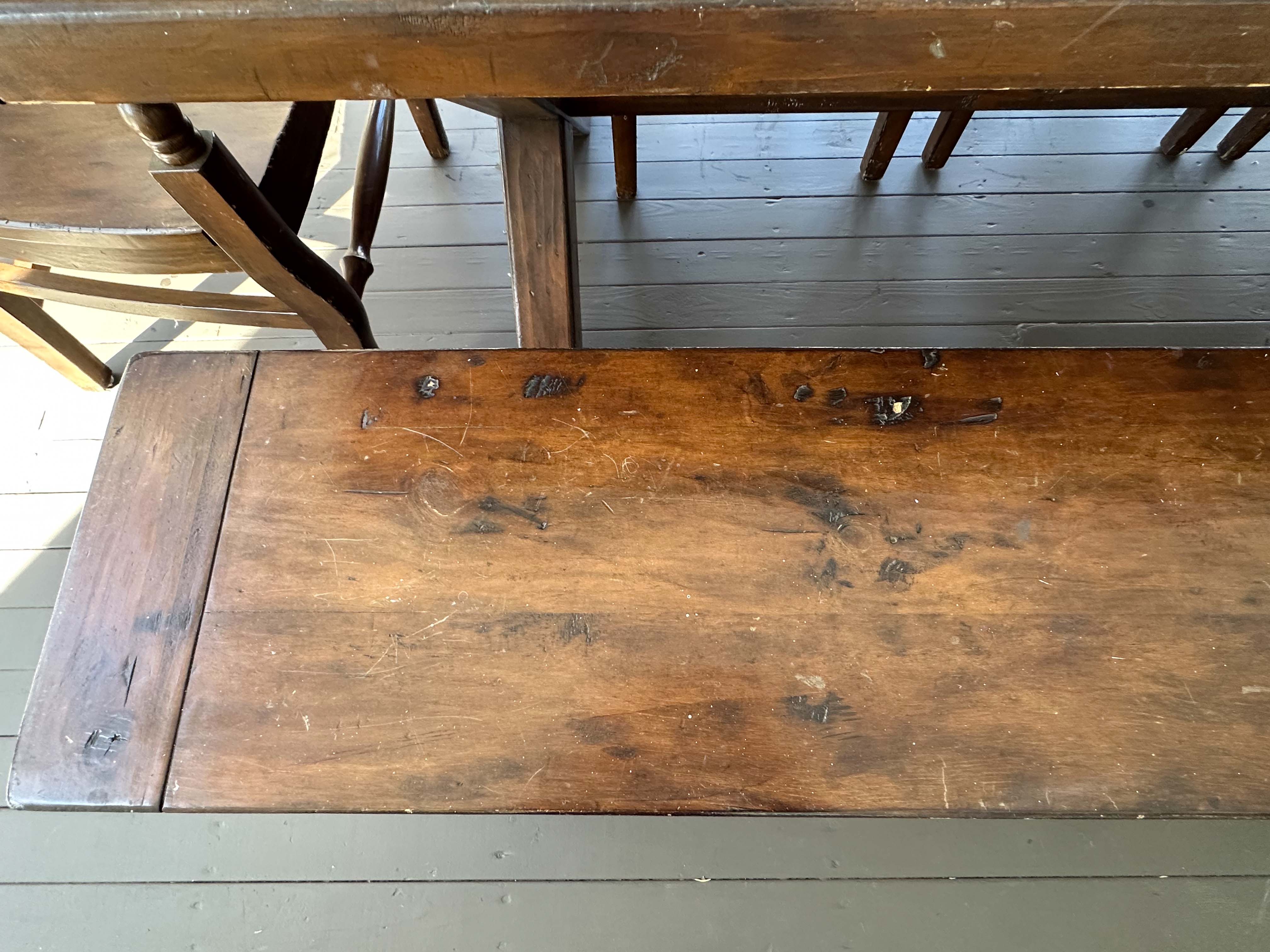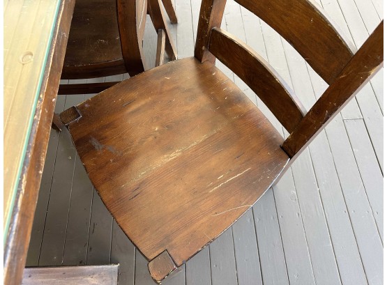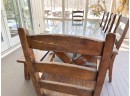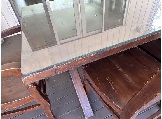 There is some overall wear to all of the pieces. The table top has been protected with a piece of glass. Table: 88” l x 40” w x 30 1/2” h, bench: 88 1/2” l x 14” w x 18 1/2” h, end chairs: 24” w x 22” d x 44” h, side chairs: 19 1/2” w x 21” d x 44” h