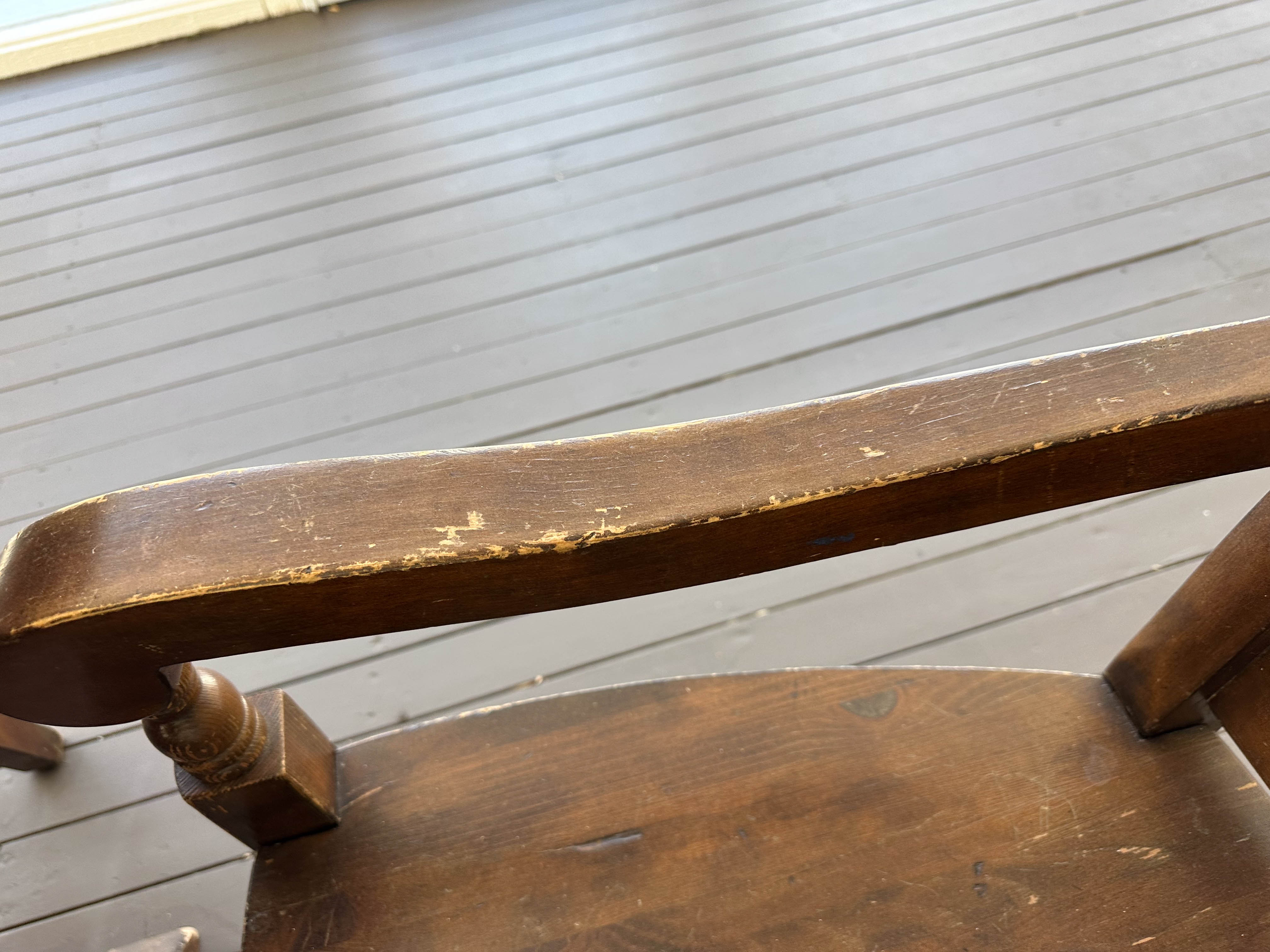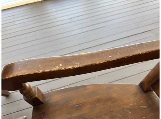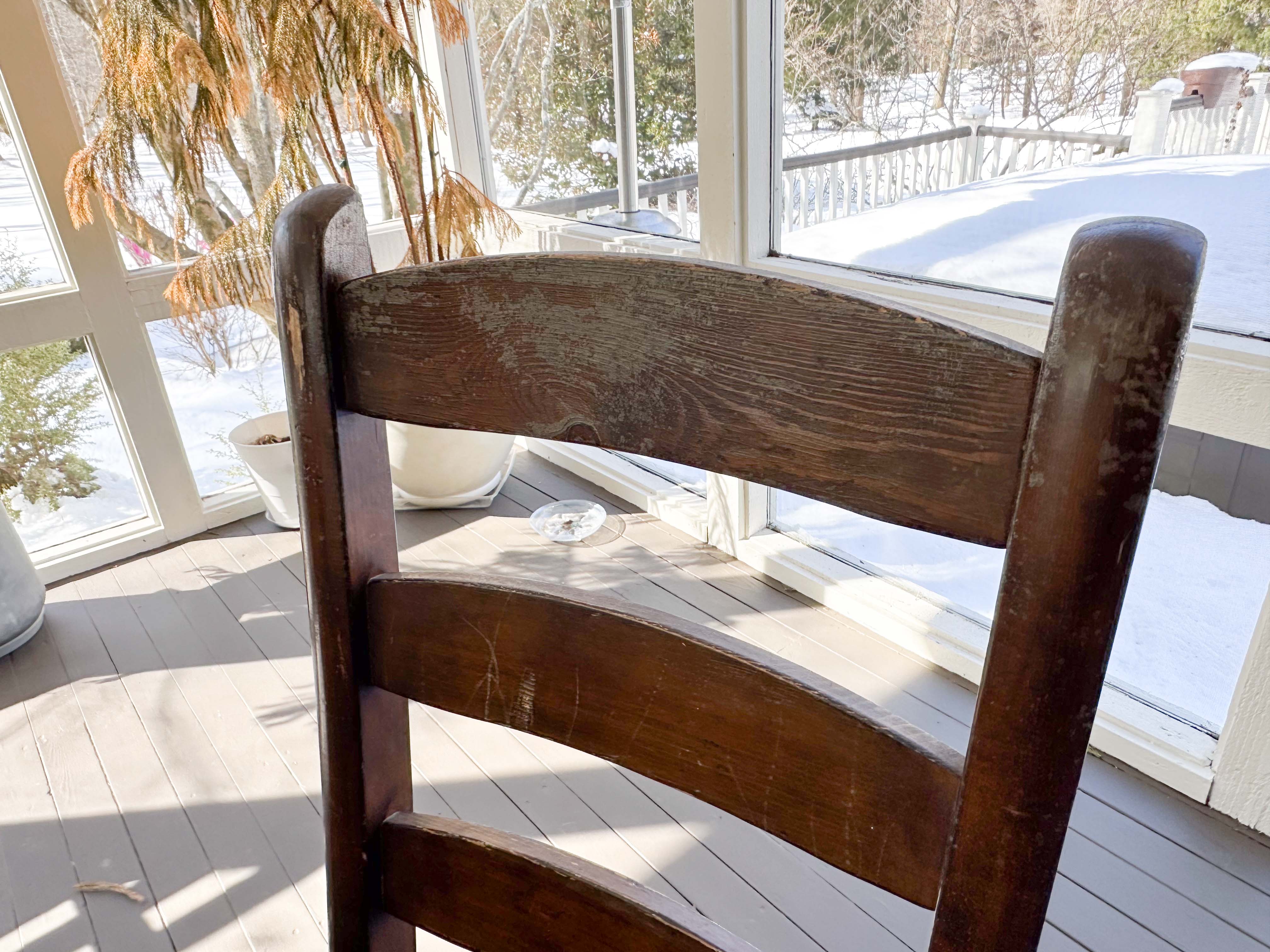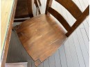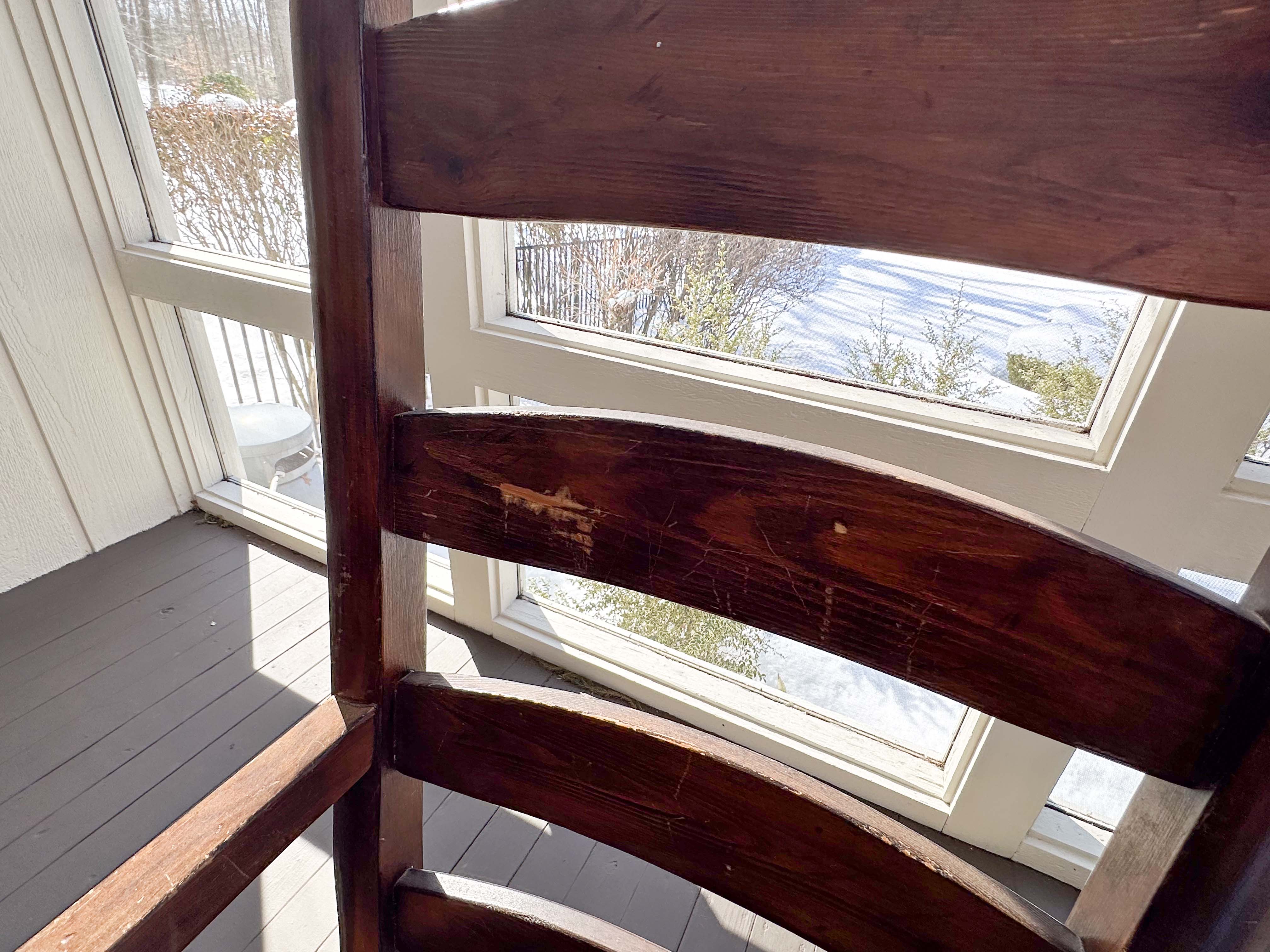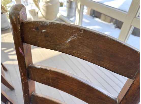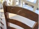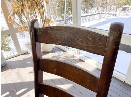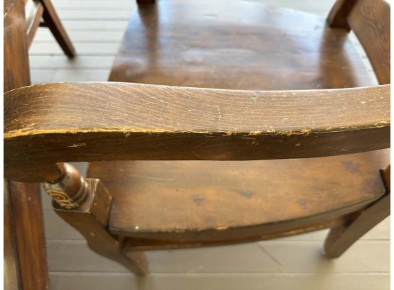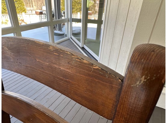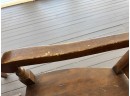 There is some overall wear to all of the pieces. The table top has been protected with a piece of glass. Table: 88” l x 40” w x 30 1/2” h, bench: 88 1/2” l x 14” w x 18 1/2” h, end chairs: 24” w x 22” d x 44” h, side chairs: 19 1/2” w x 21” d x 44” h