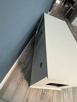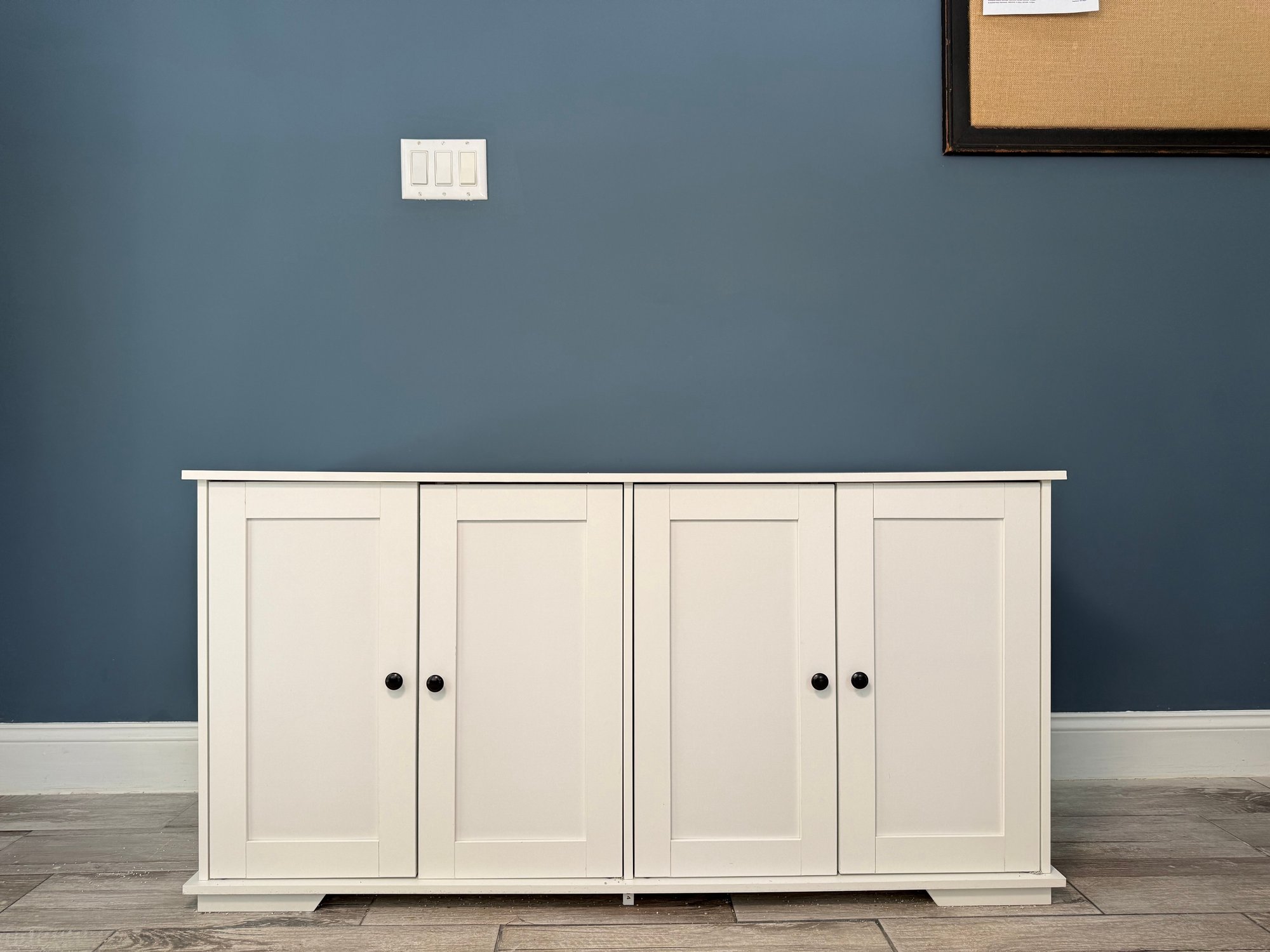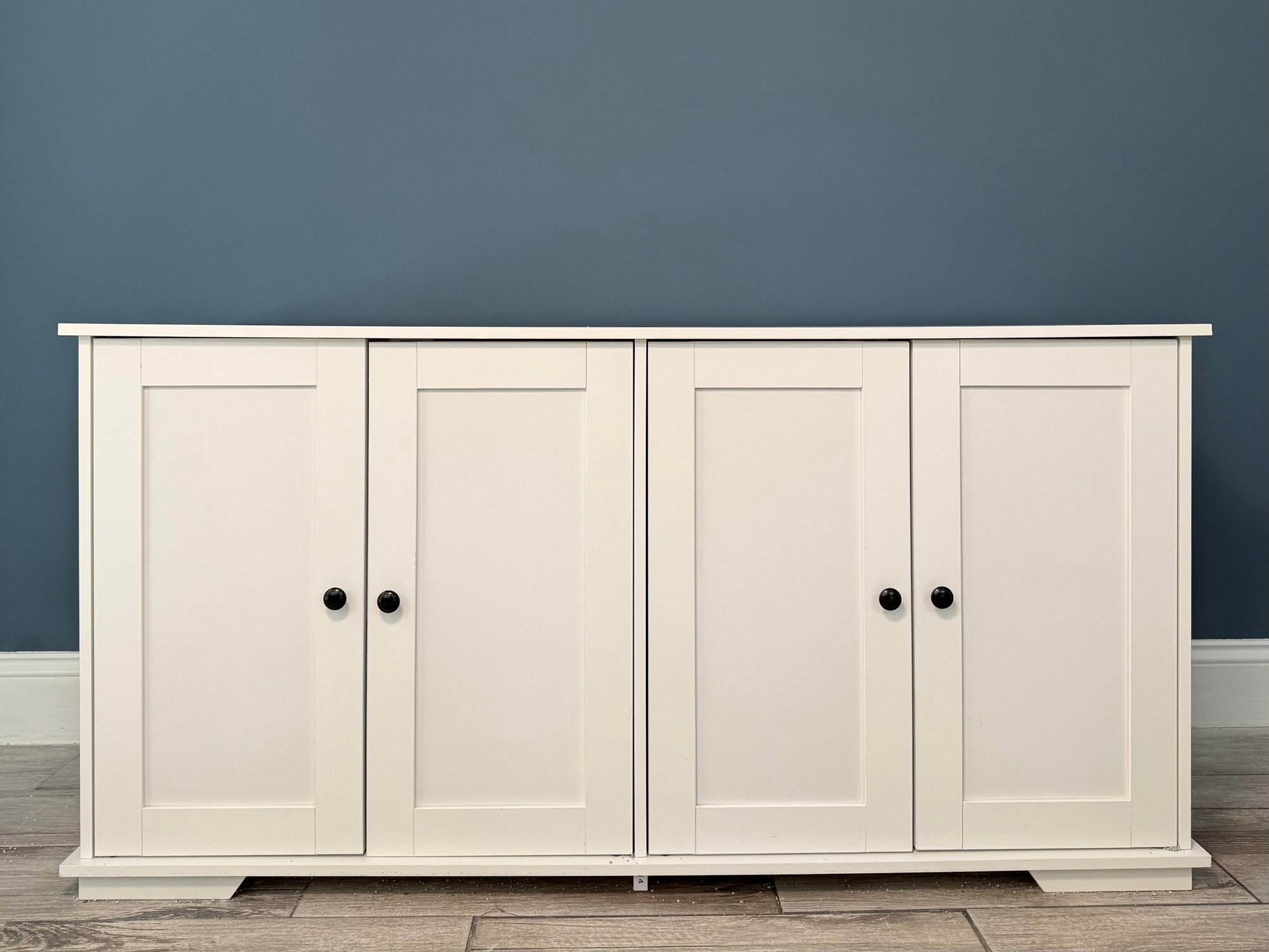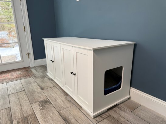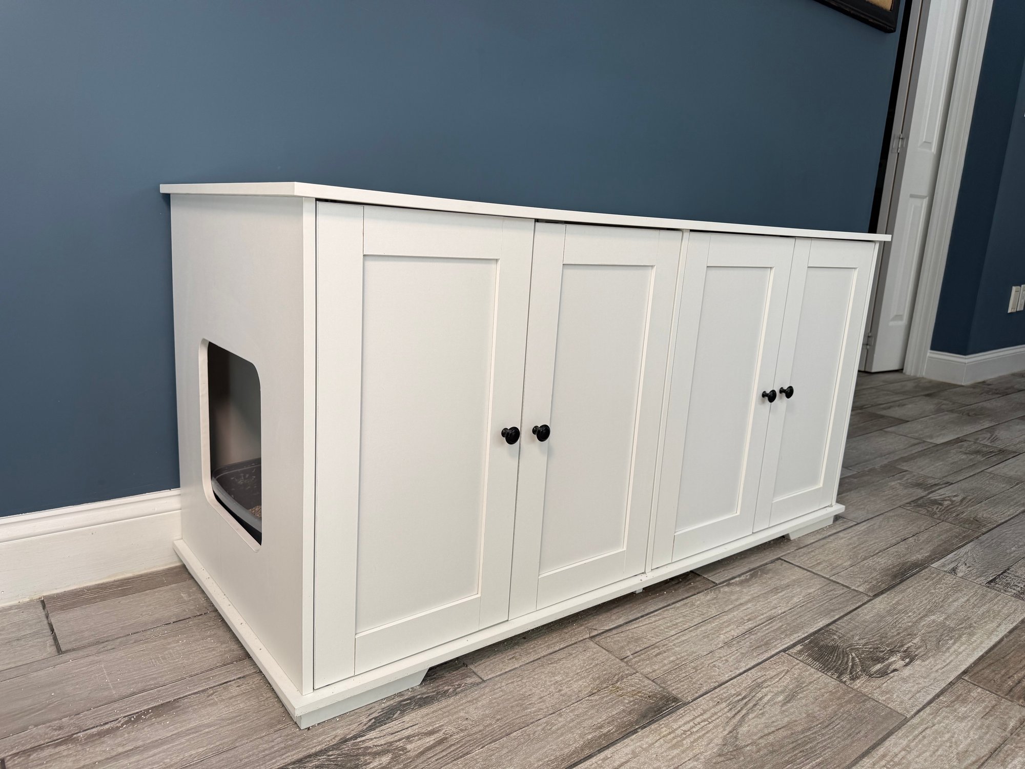 This is a fabulous way to hide your little box! This farmhouse style white cabinet has an entrance on both sides and houses two litter boxes.