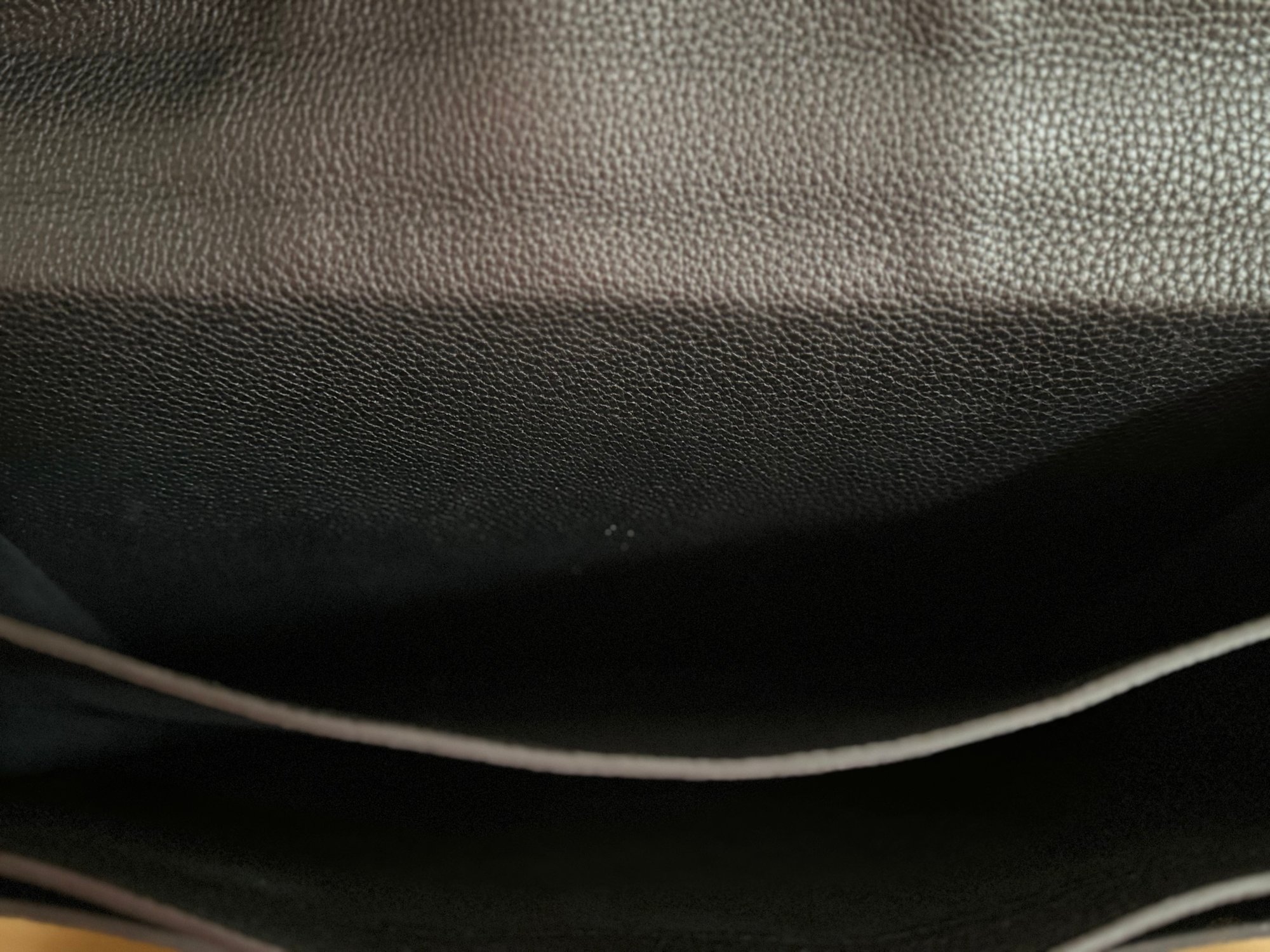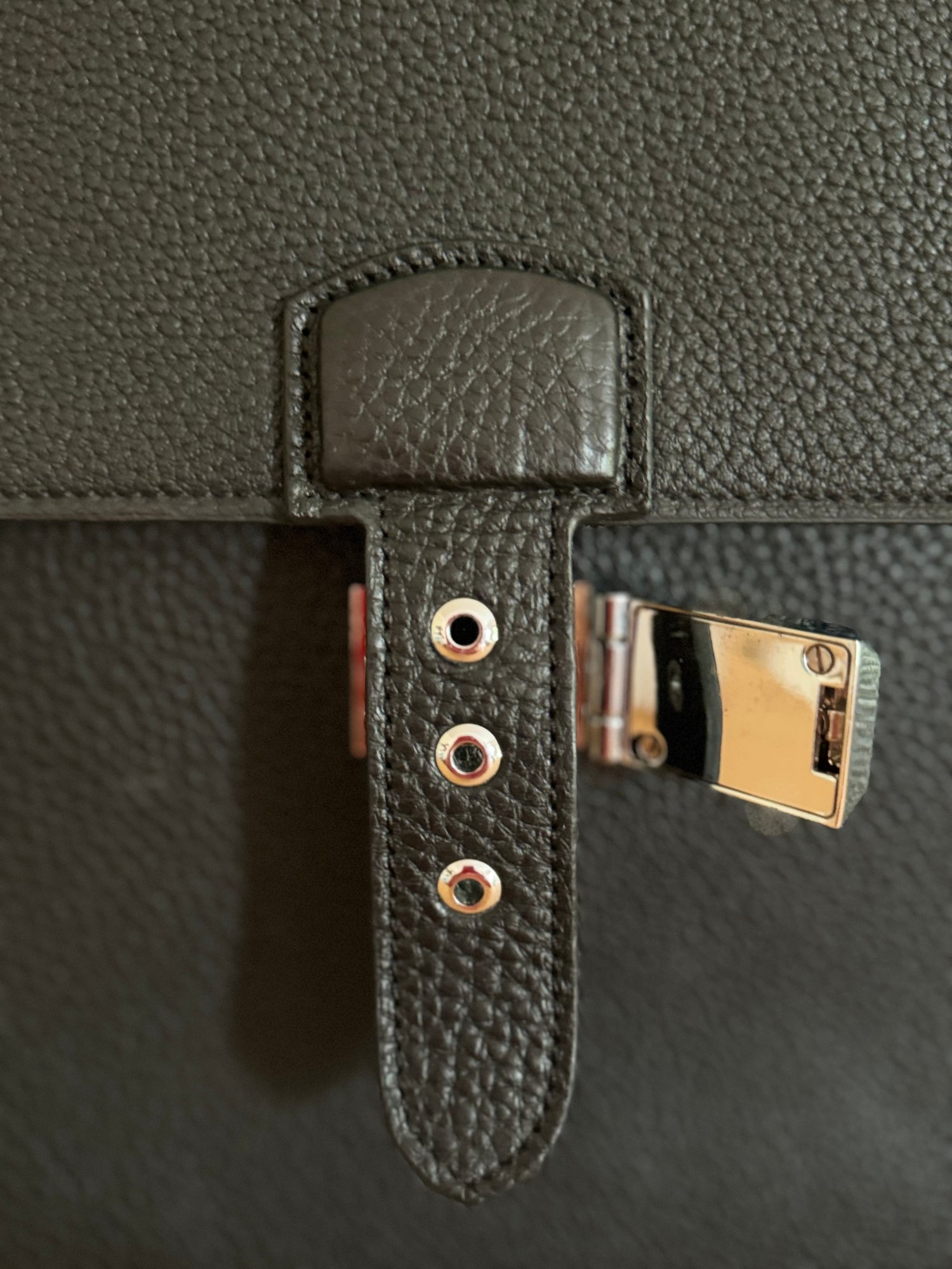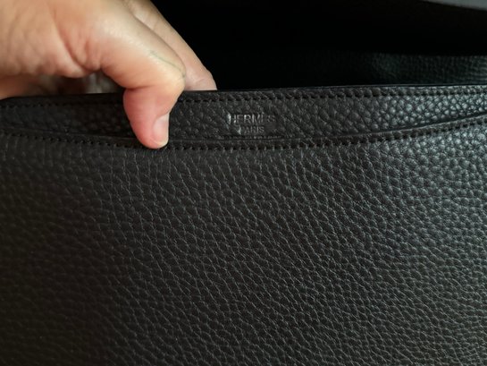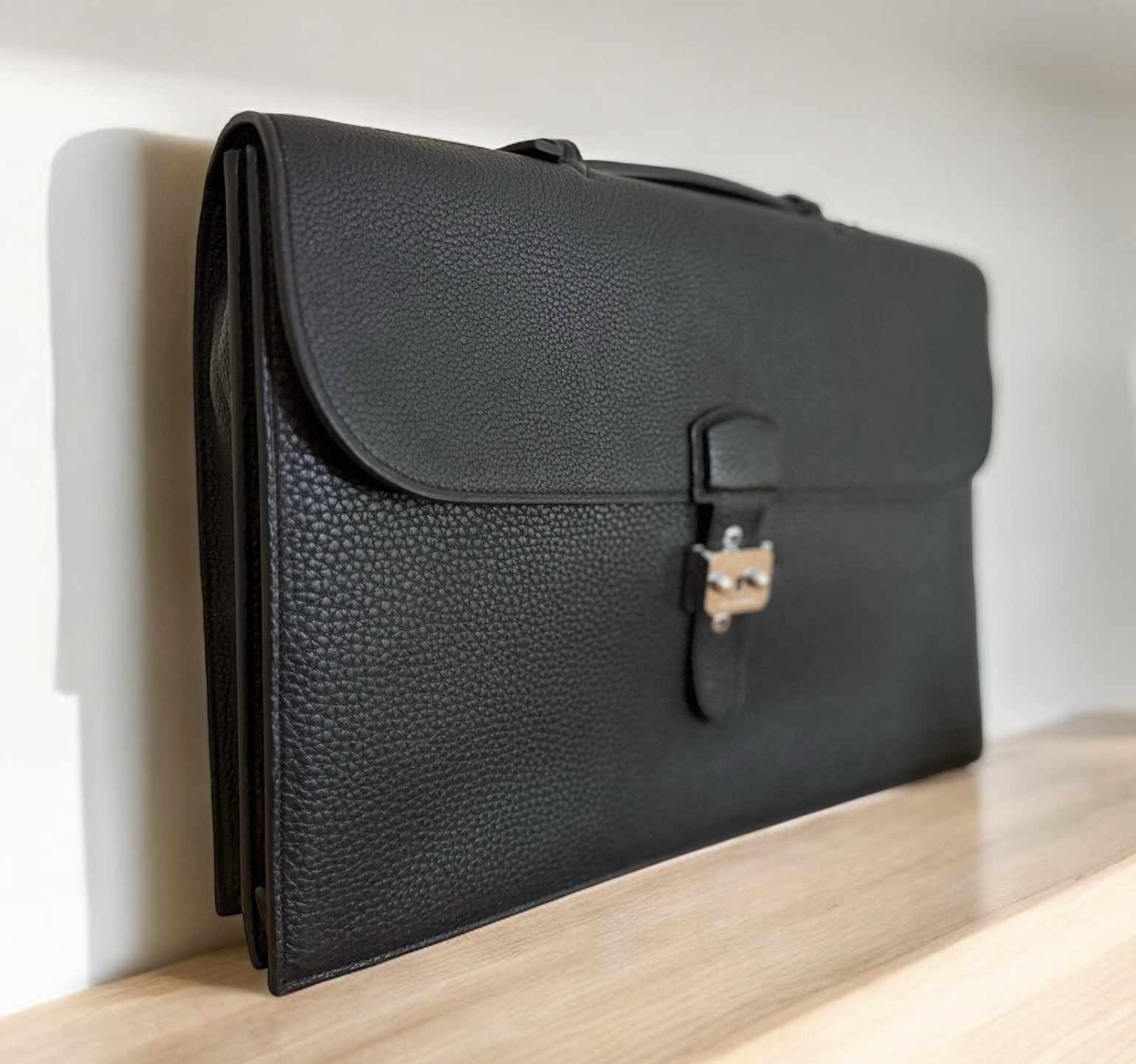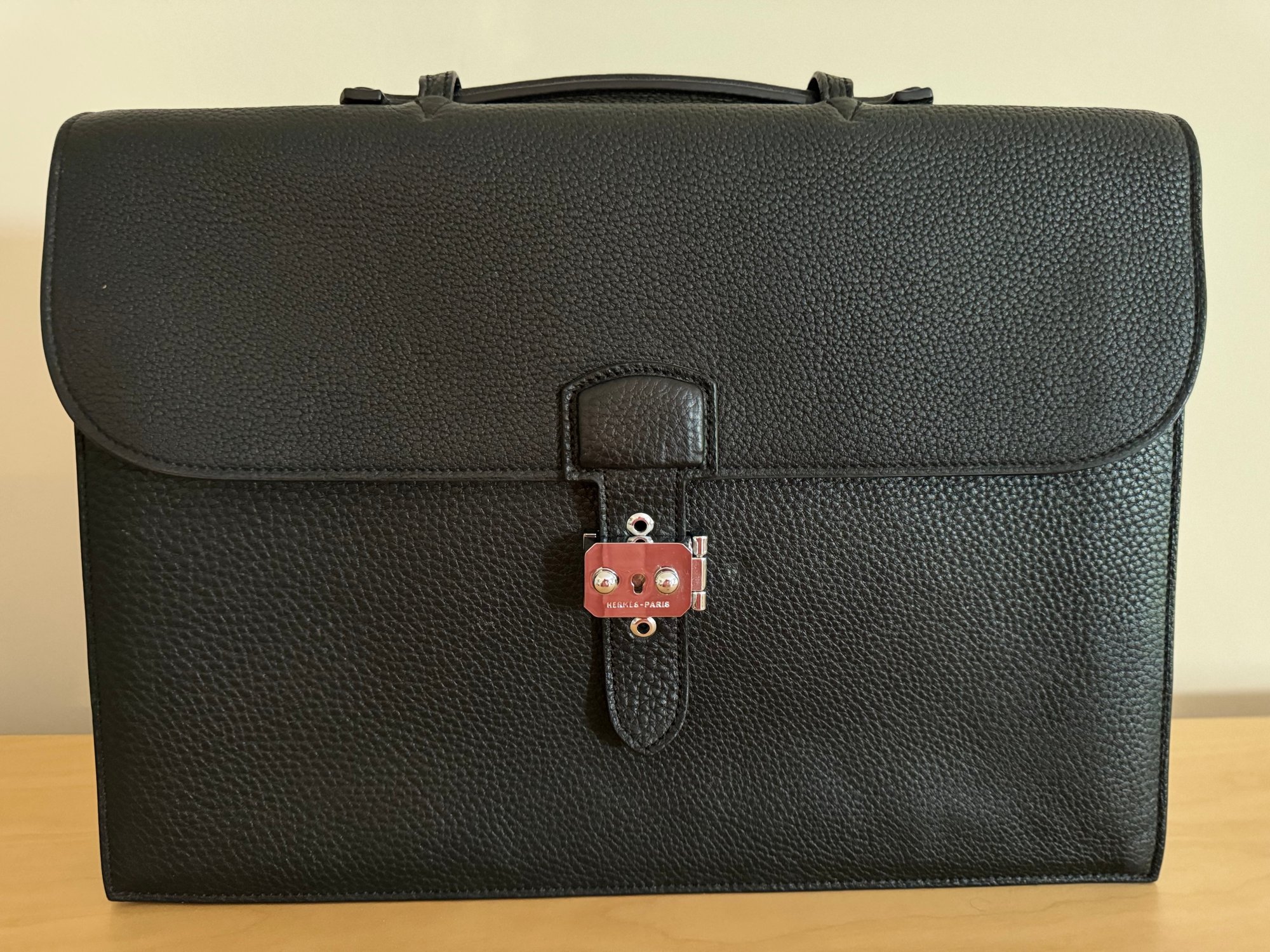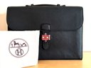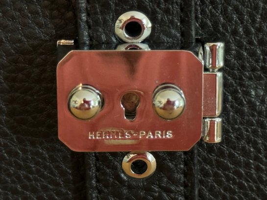 Great faux copy of the classic Hermes briefcase in black embossed style leather with silver polished chrome hardware. Condition good used lightly.