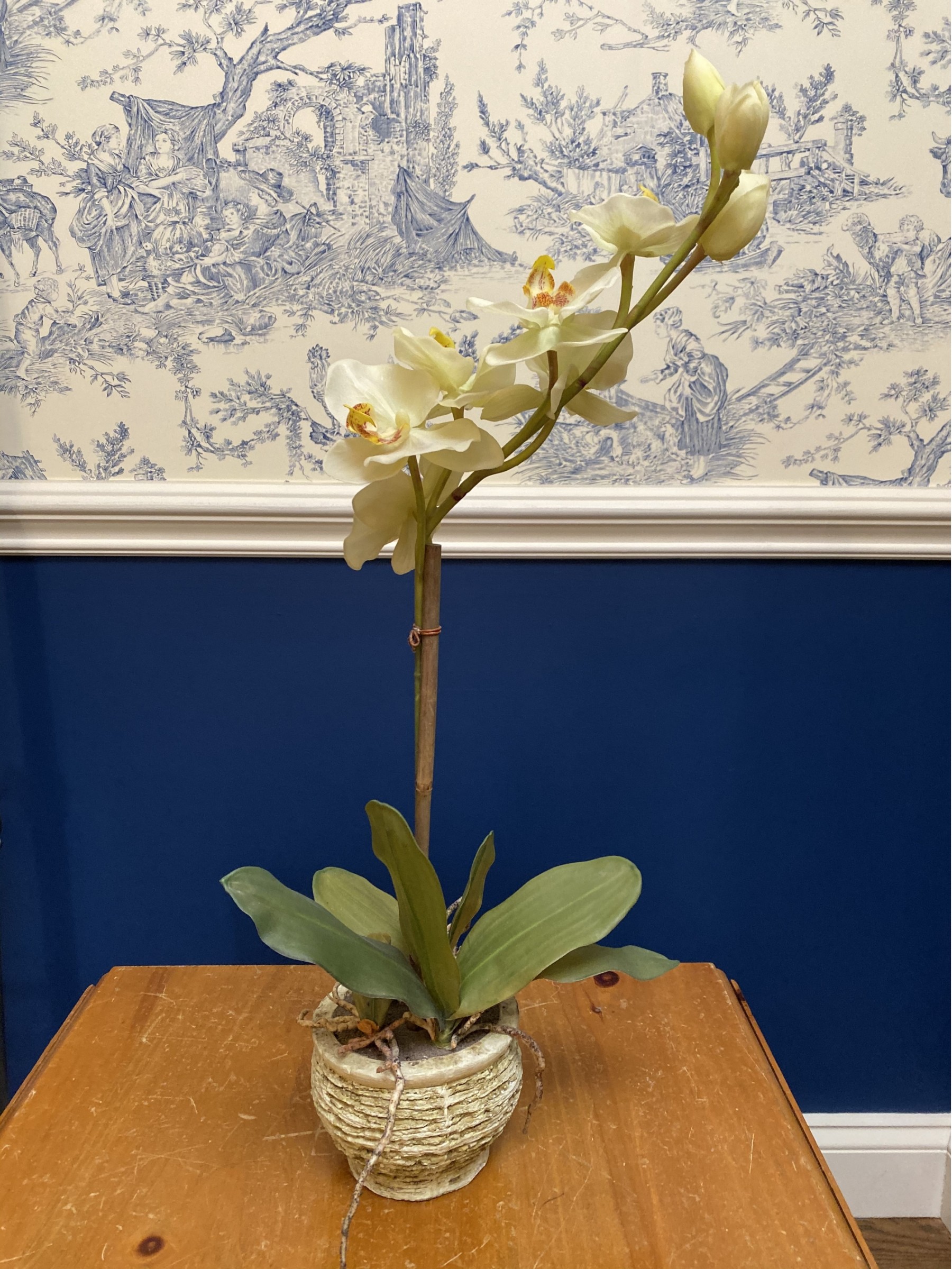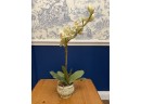 Simply elegant, a faux white orchid rises from an ornate pot crafted in neutral tones. Bamboo supports add a realistic touch while pot features greenery and sedum spills. This pretty arrangement would be a lovely touch in a guest bedroom for a welcoming look.