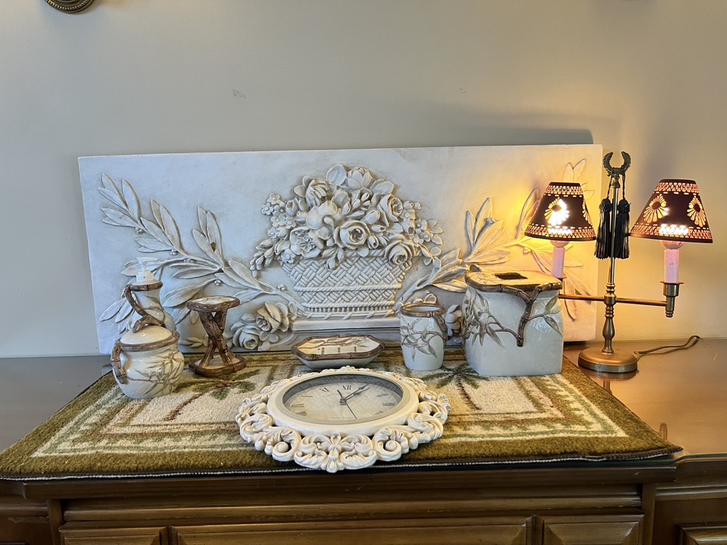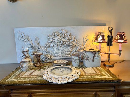 Faux Plaster Wall Decor, Bath Lot, Matching Mat, Cut Work Metal Lampshades, Quartz Resin Clock