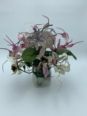 Lovely and unusual flower arrangement of faux spider lilies in a frosted glass vase. All in excellent condition and fine quality. Wire in stems all for posing of flowers and leaves. No chips or cracks found in vase.