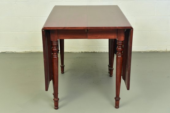 Federal style mahogany drop-leaf dining table, the rectangular top with hinged leaves over a plain apron, raised on slender turned and reeded legs ending in ringed feet.