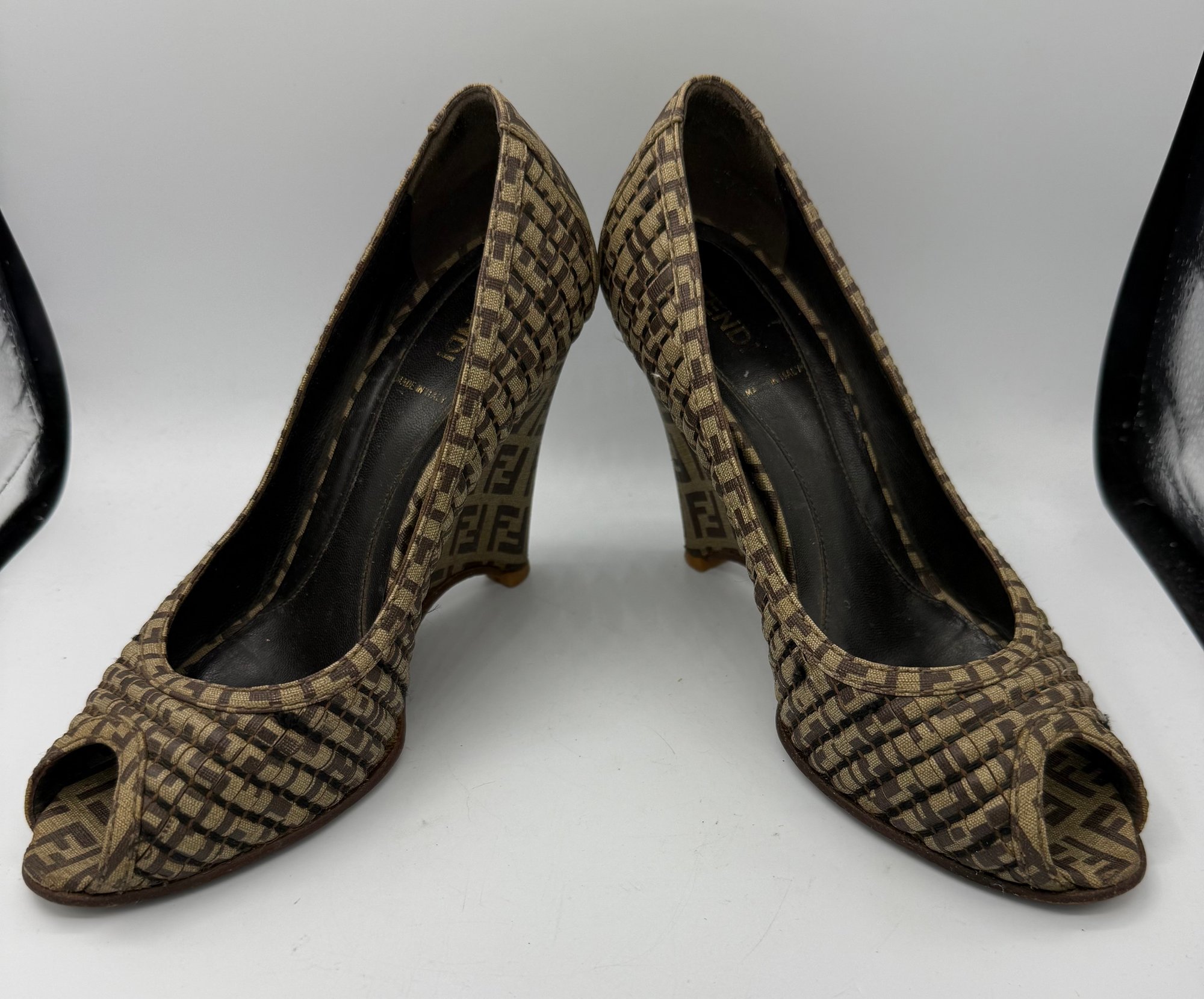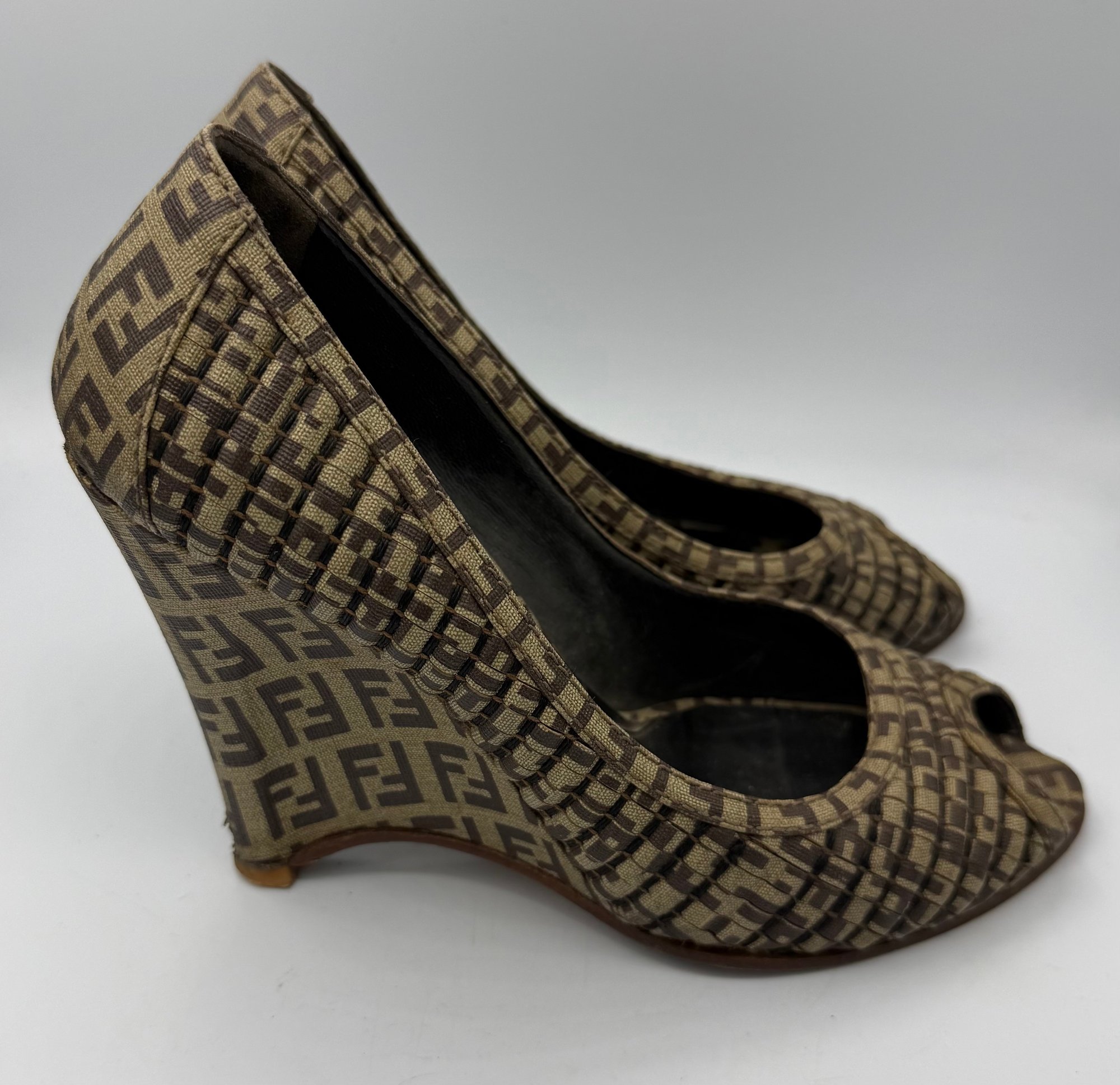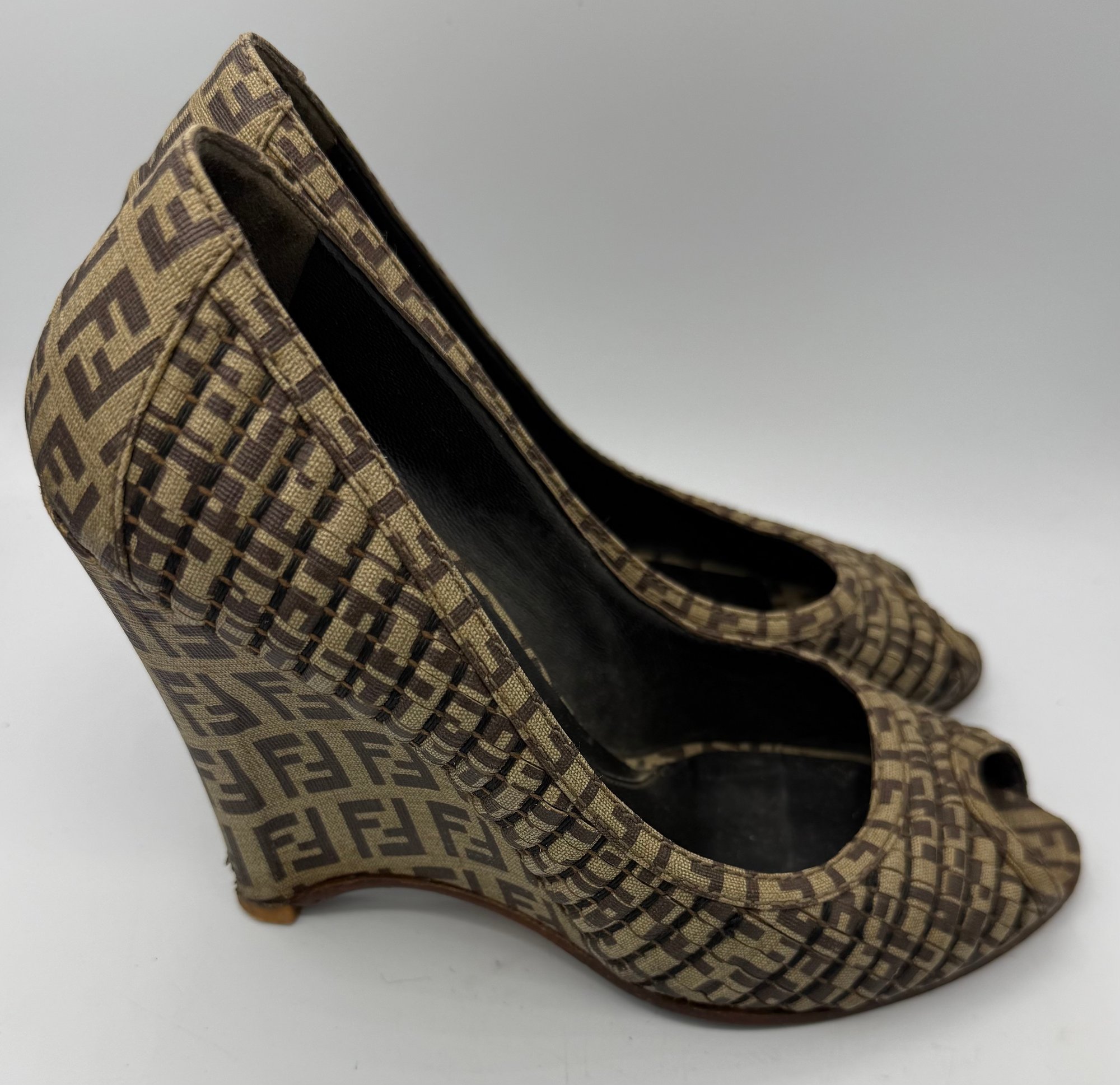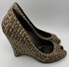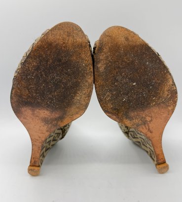This lot features a beautiful pair of high fashion wedges with a peep-toe front and a woven style texture.