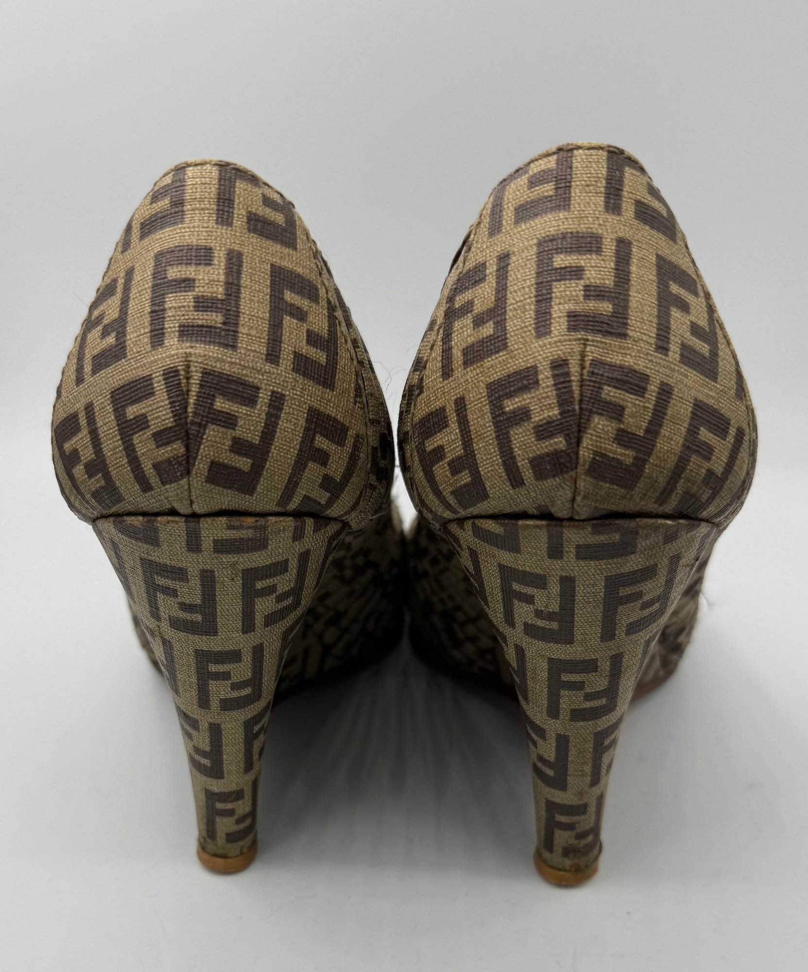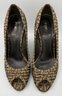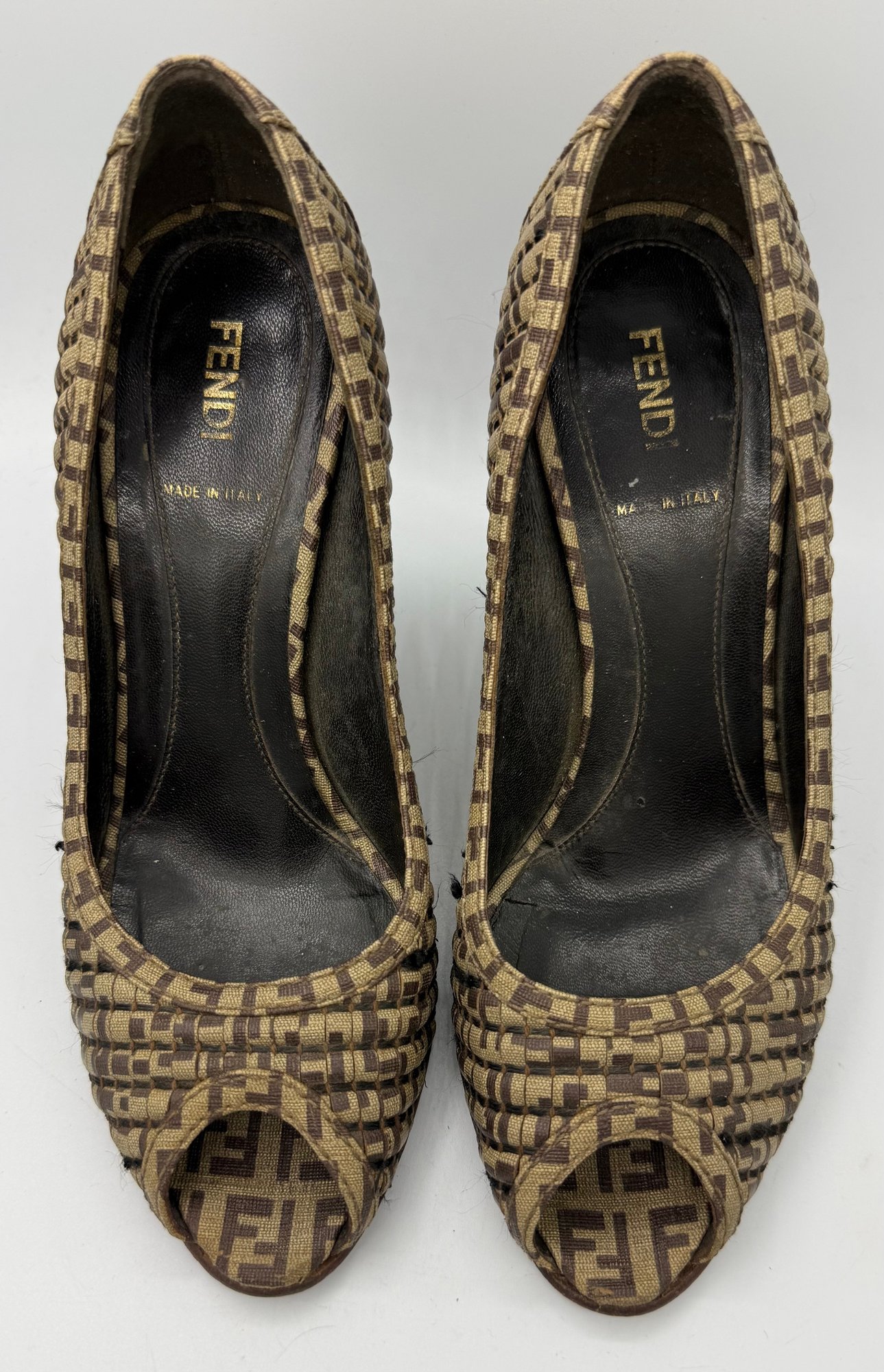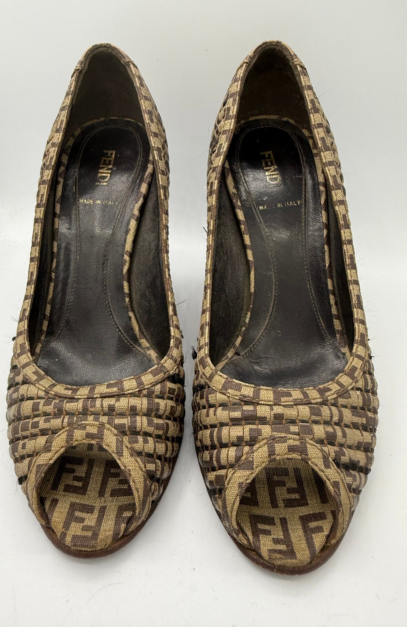 This lot features a beautiful pair of high fashion wedges with a peep-toe front and a woven style texture.