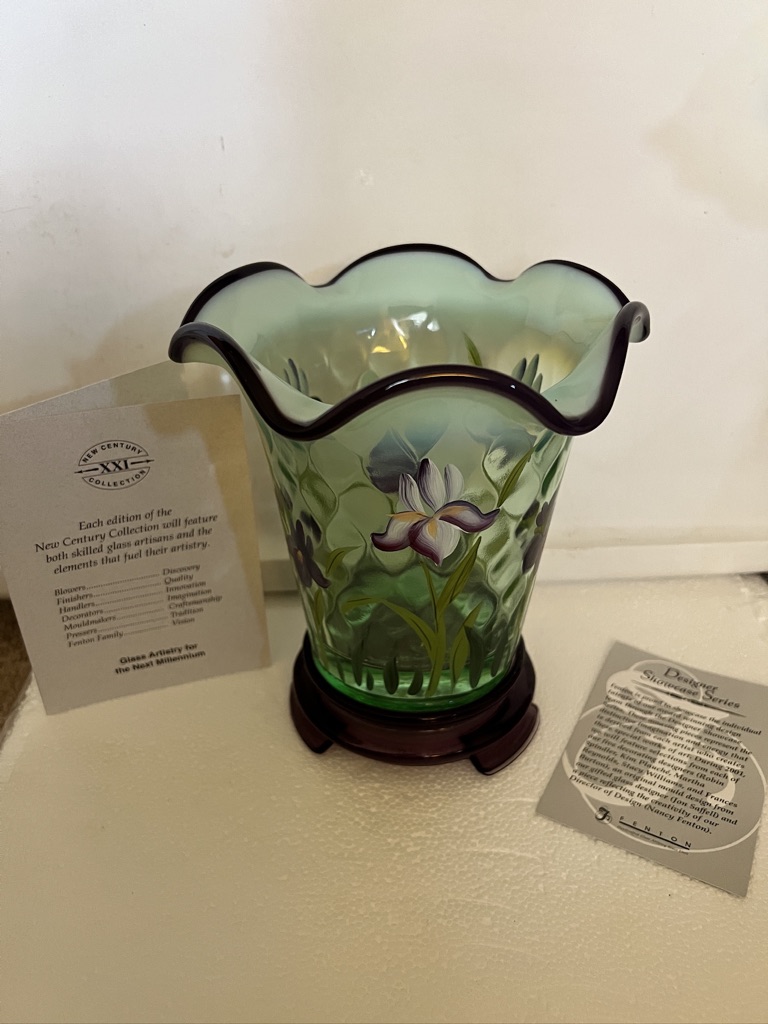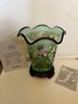 Green iridescent uranium glass, with opal ruffled rim, on amethyst stand, amazing piece, NIB